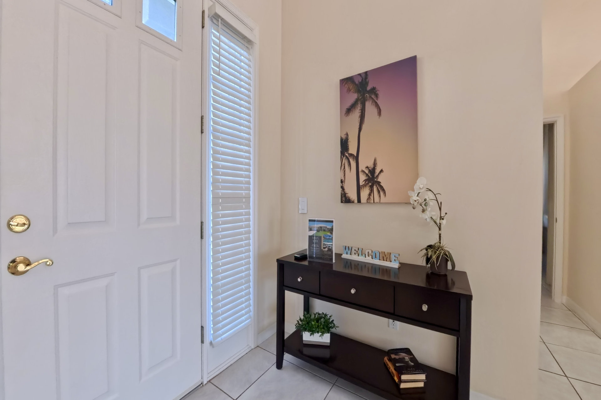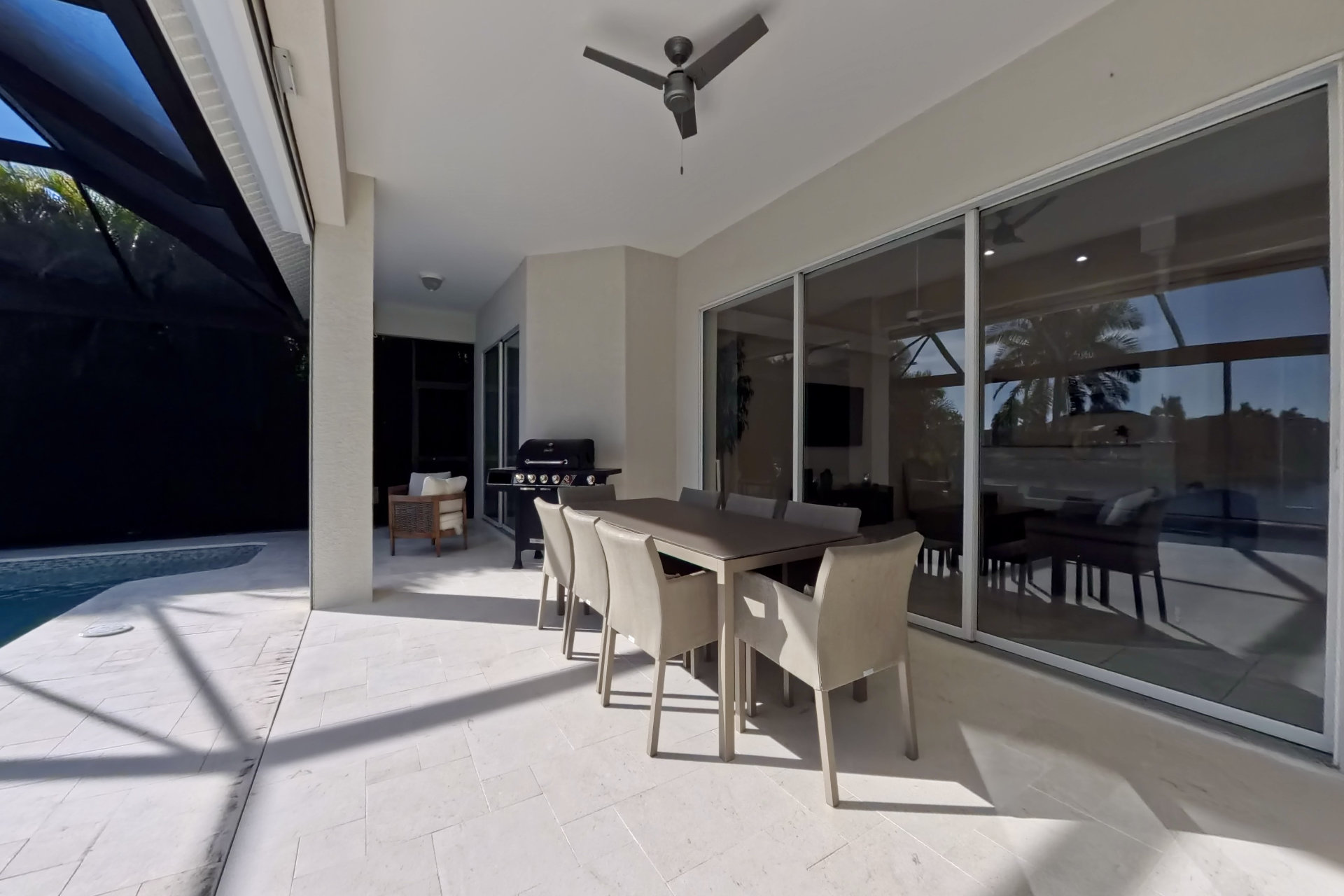 Villa Alba has 4 bedrooms and 2 bathrooms. The living room offers a beautiful view of the large pool, the canal and the tropical garden. The sliding glass doors can be opened completely, creating a great inside-outside feeling.