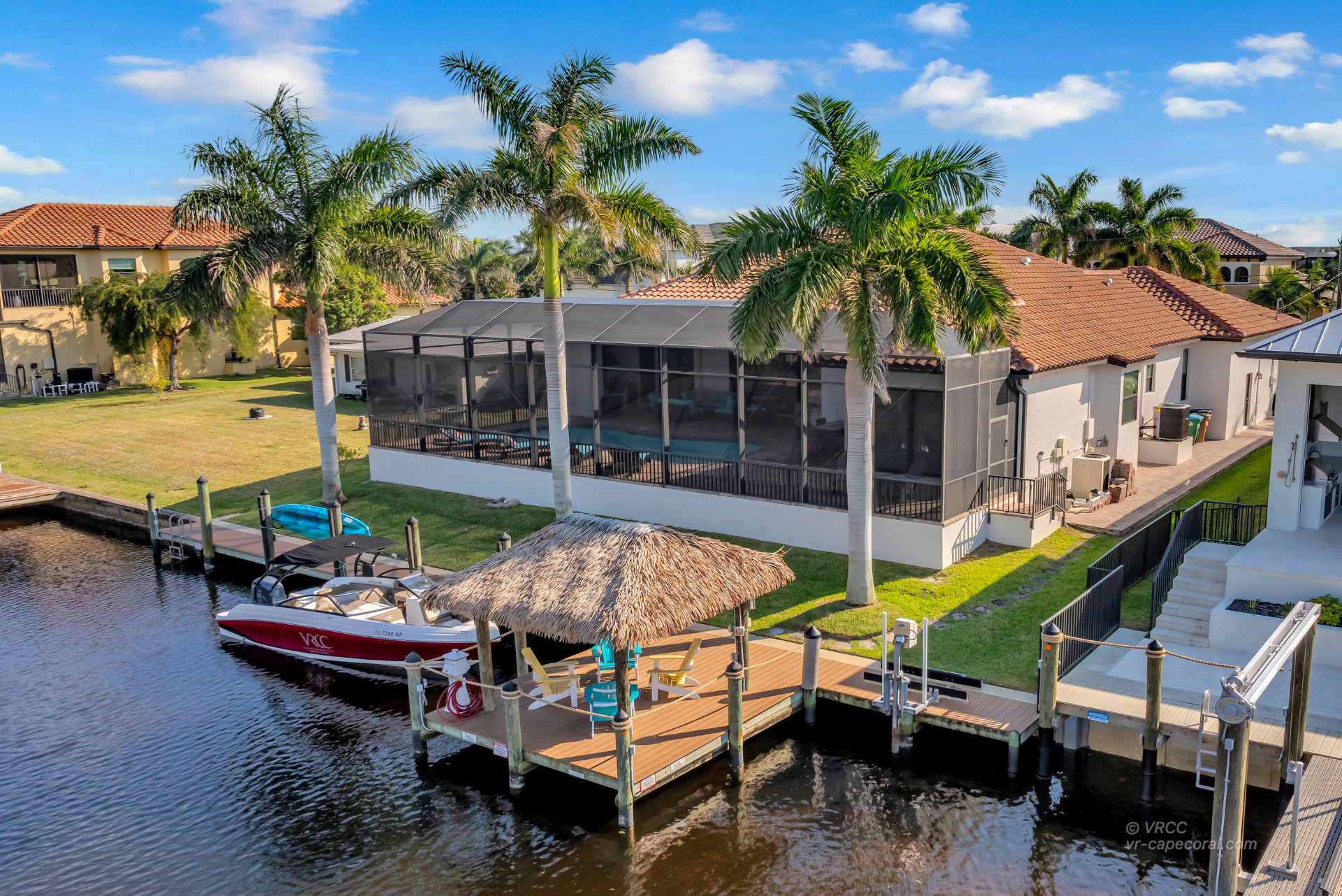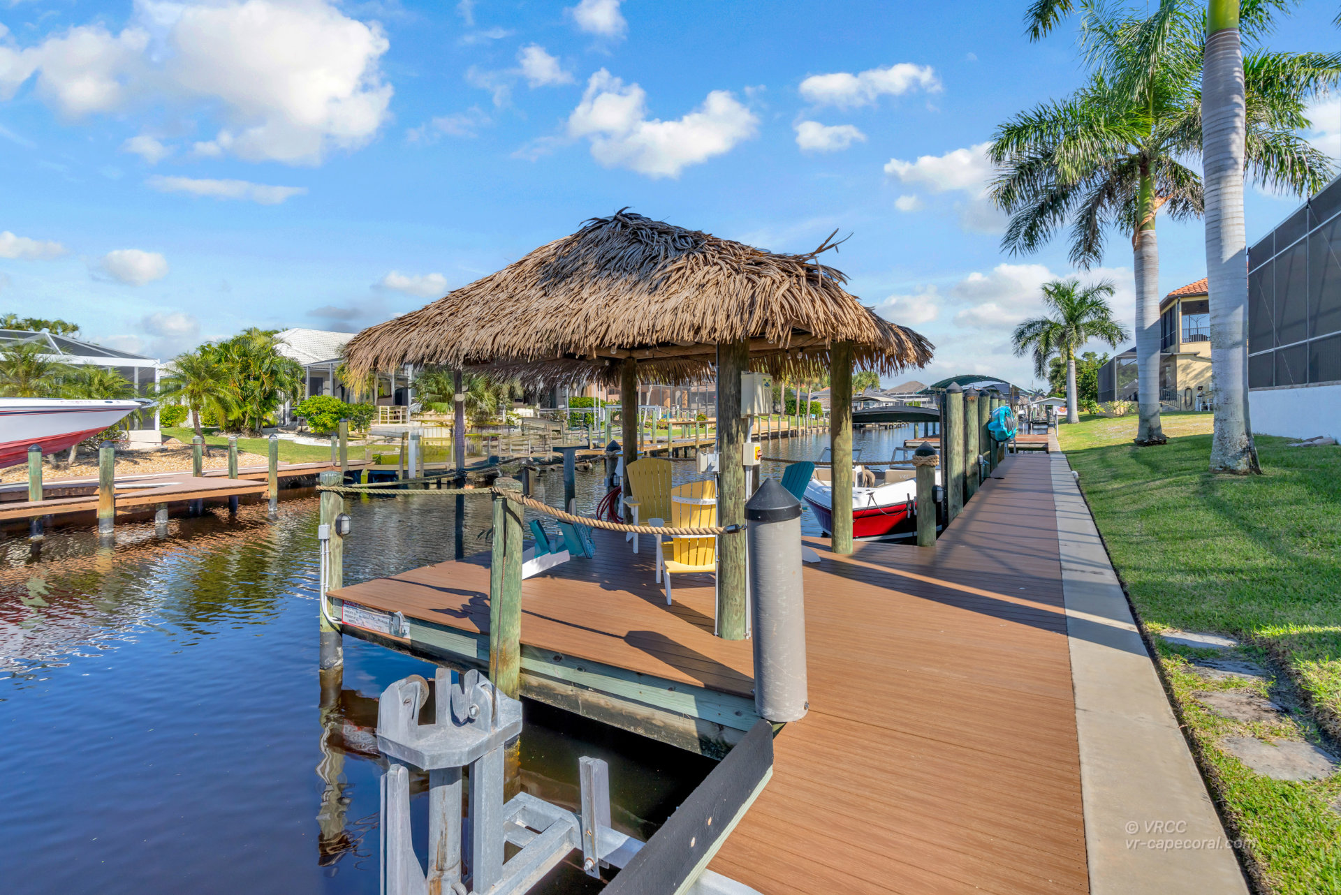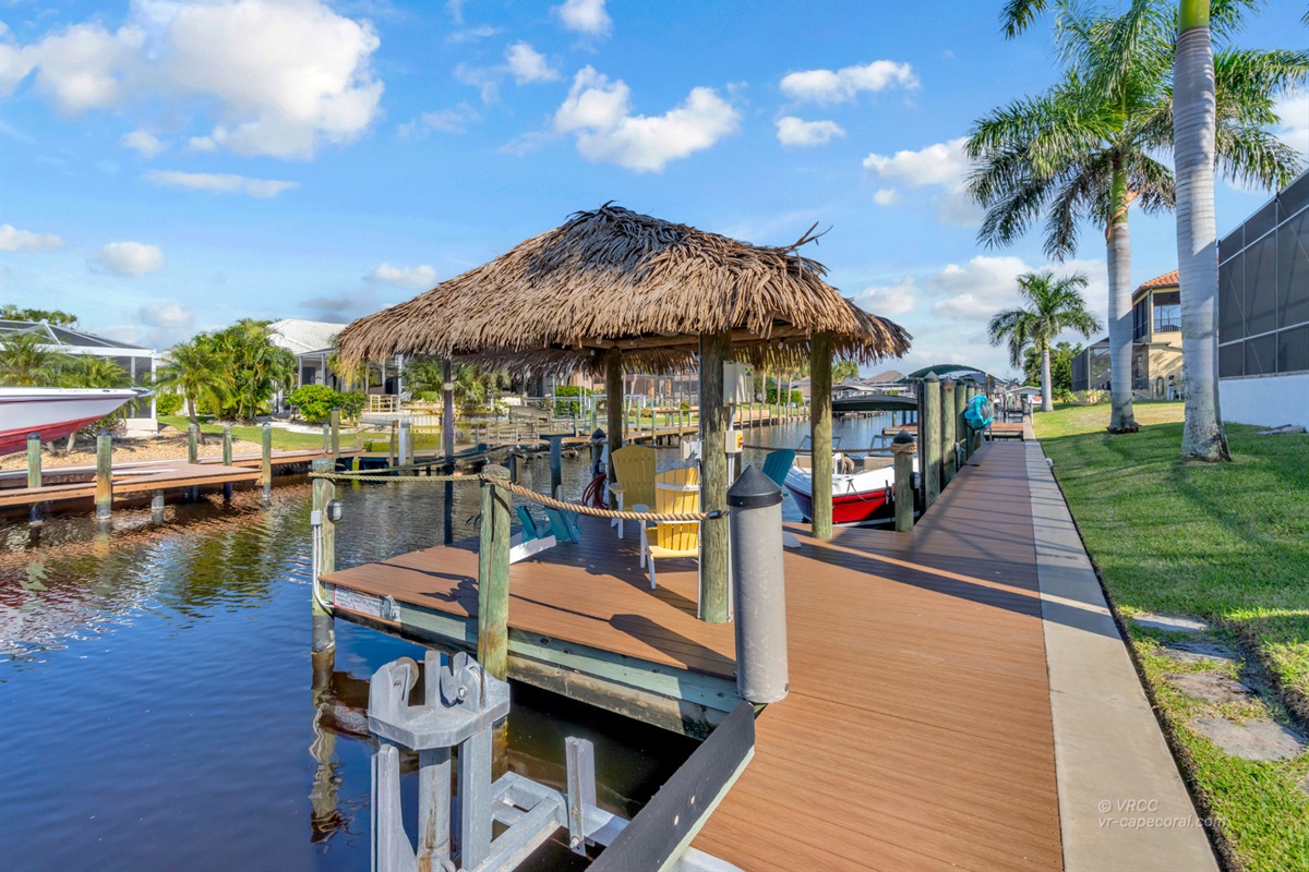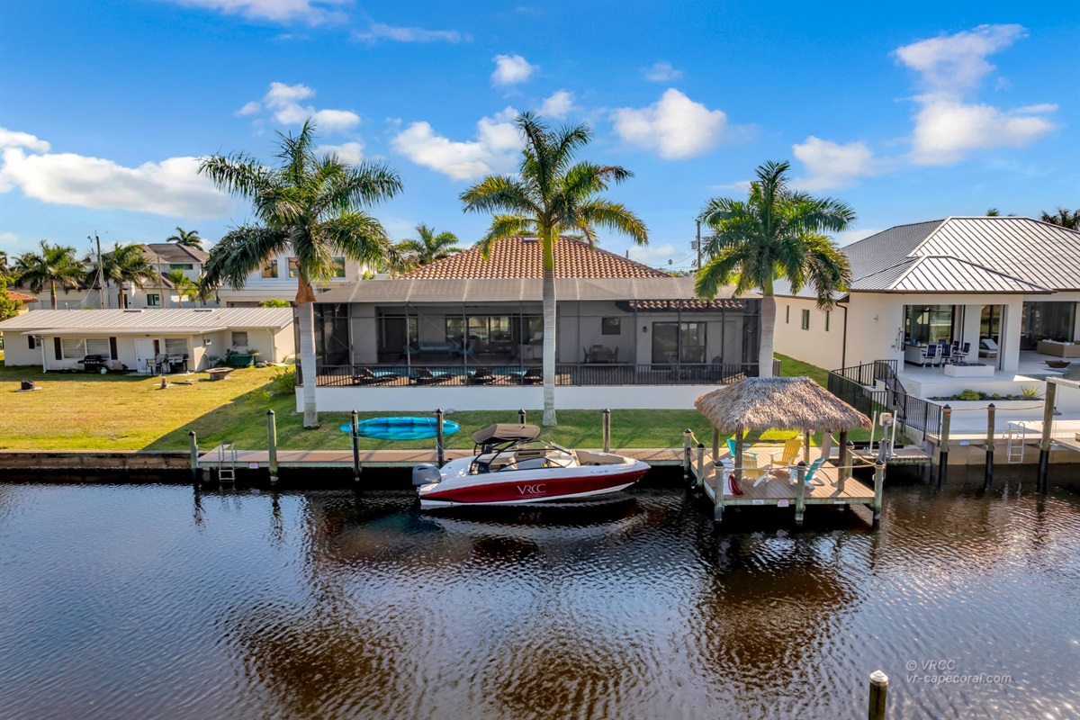 Outside is where this home truly shines. The huge fully screened lanai features a family-sized heated pool, padded loungers, an outdoor kitchen with grill, and shaded seating areas perfect for long, lazy afternoons. Just a few steps farther, your private dock and tropical tiki hut provide a front-row seat to the canal—ideal for sunset cocktails, fishing, or simply watching boats drift by.