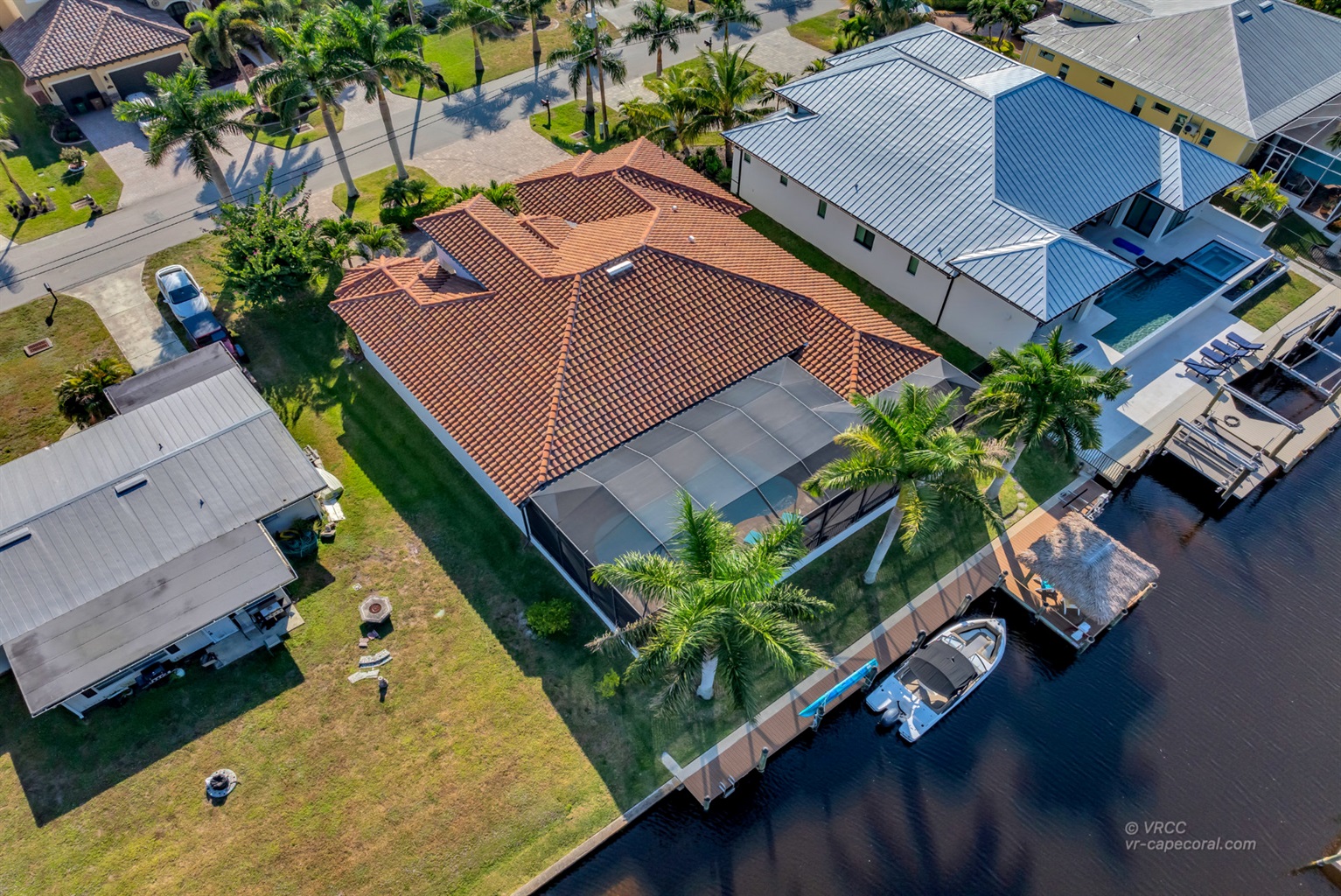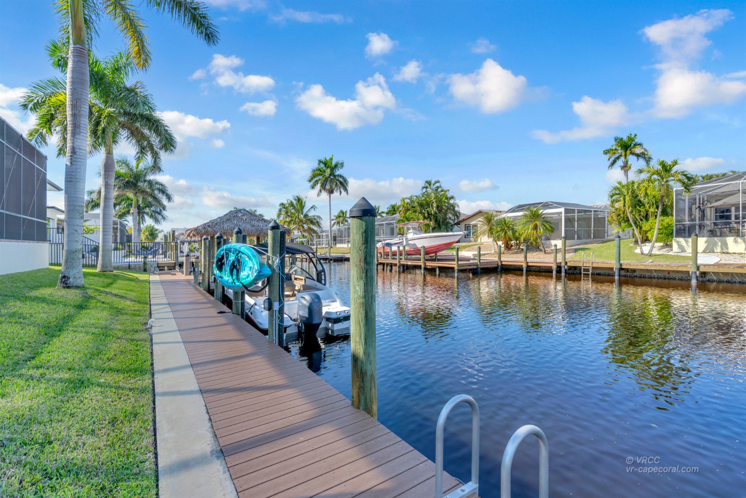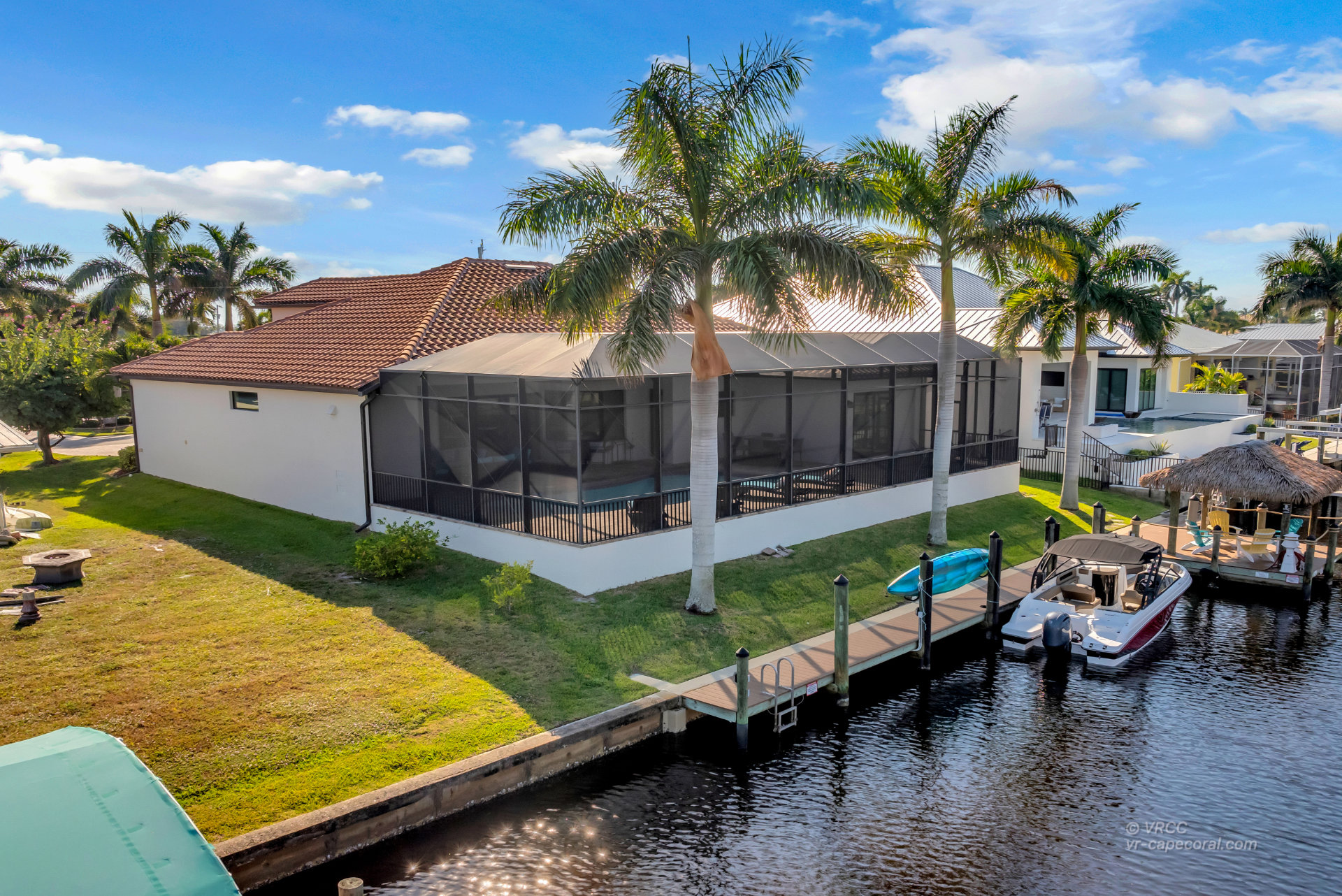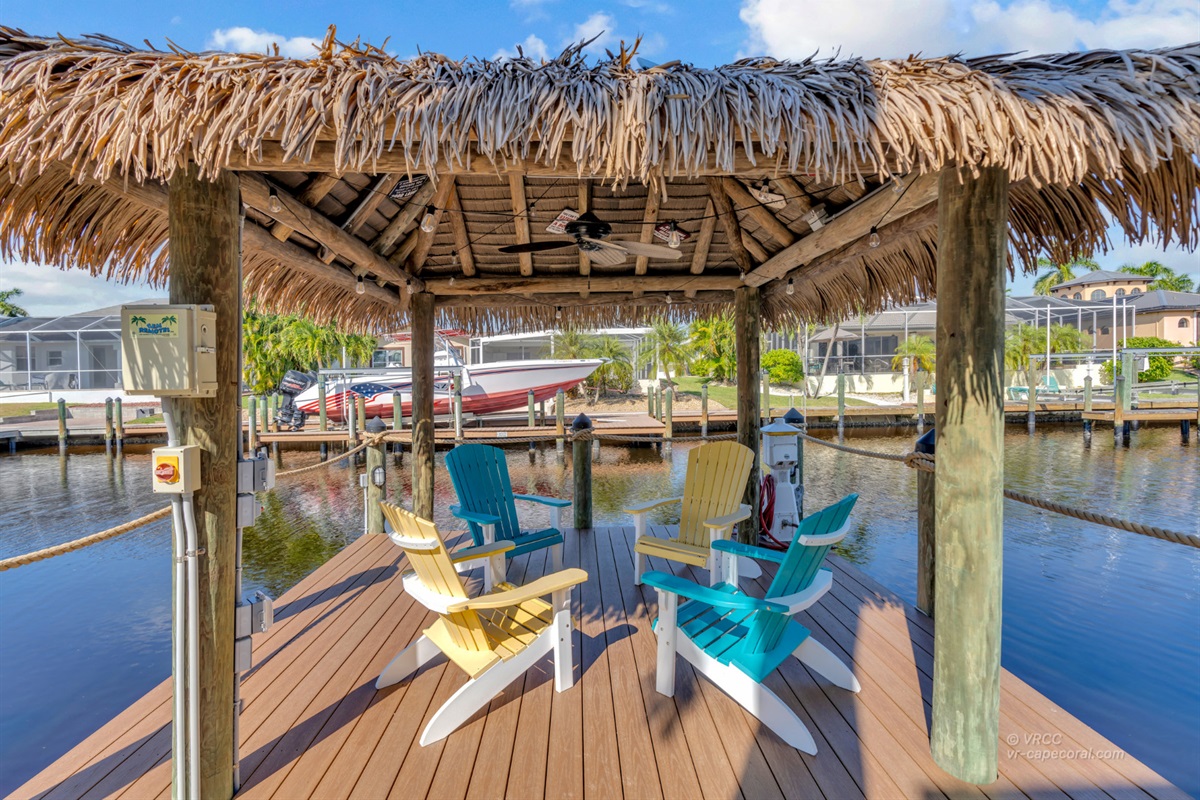 Outside is where this home truly shines. The huge fully screened lanai features a family-sized heated pool, padded loungers, an outdoor kitchen with grill, and shaded seating areas perfect for long, lazy afternoons. Just a few steps farther, your private dock and tropical tiki hut provide a front-row seat to the canal—ideal for sunset cocktails, fishing, or simply watching boats drift by.