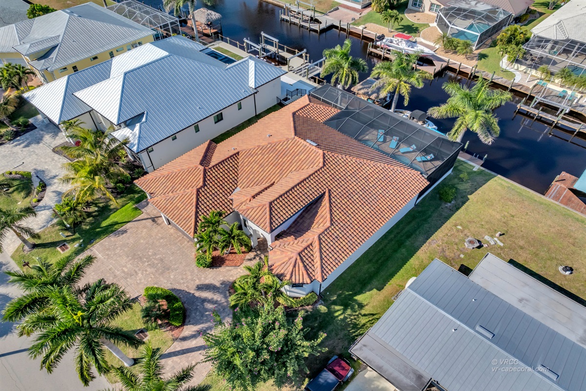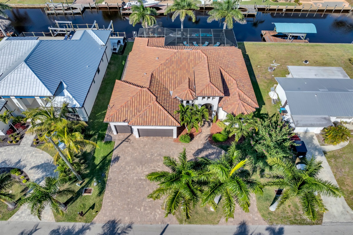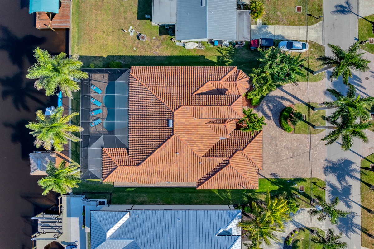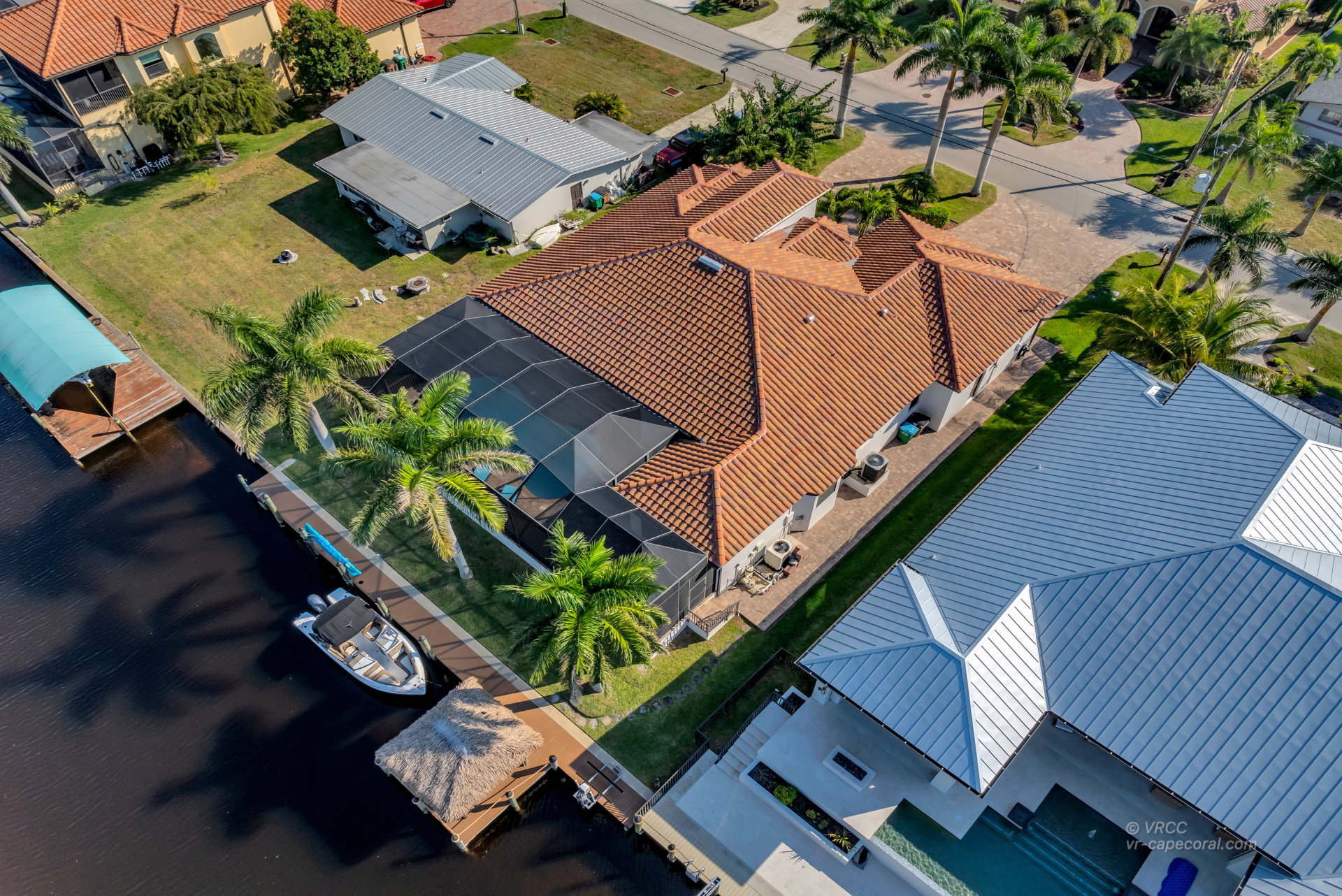 Outside is where this home truly shines. The huge fully screened lanai features a family-sized heated pool, padded loungers, an outdoor kitchen with grill, and shaded seating areas perfect for long, lazy afternoons. Just a few steps farther, your private dock and tropical tiki hut provide a front-row seat to the canal—ideal for sunset cocktails, fishing, or simply watching boats drift by.