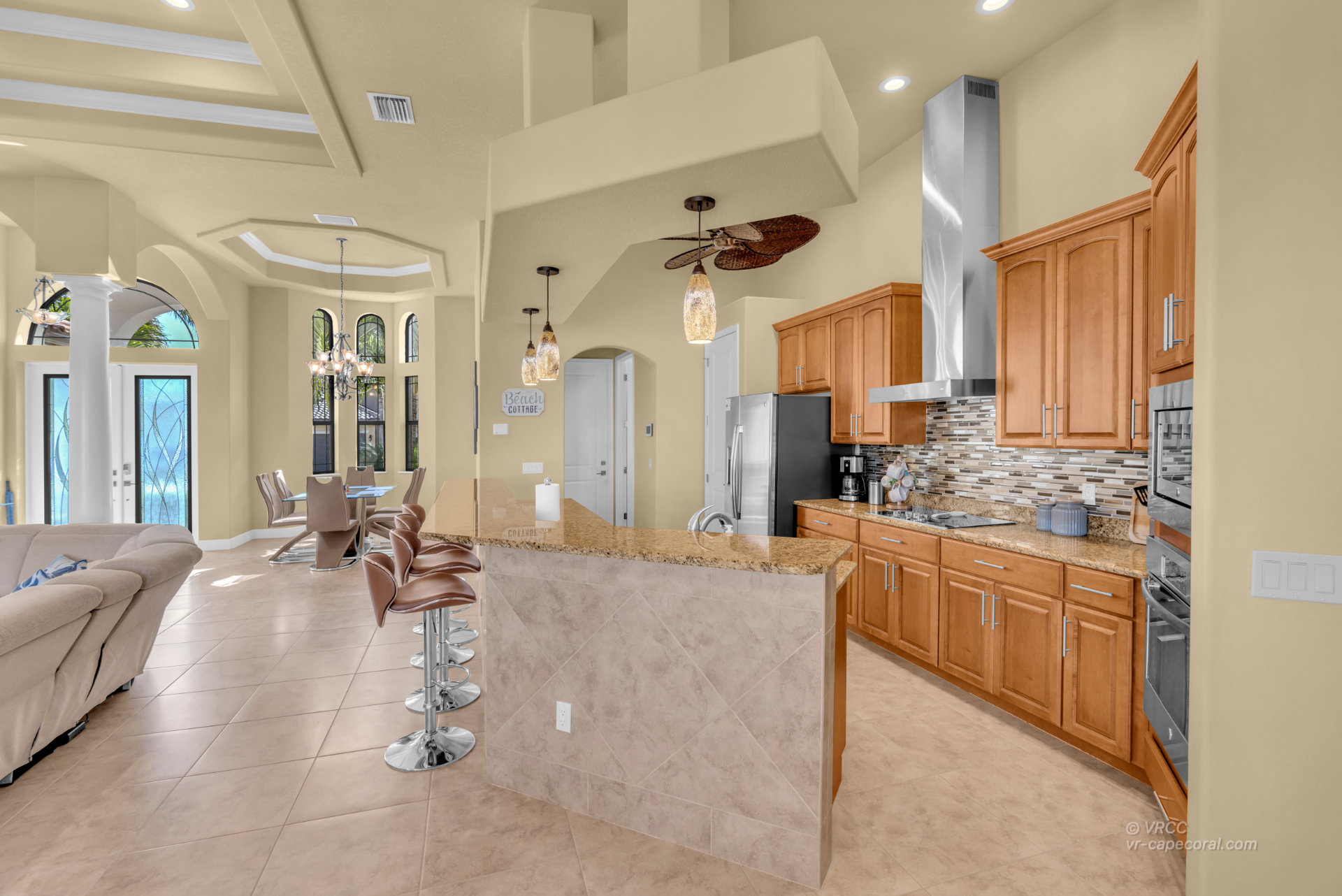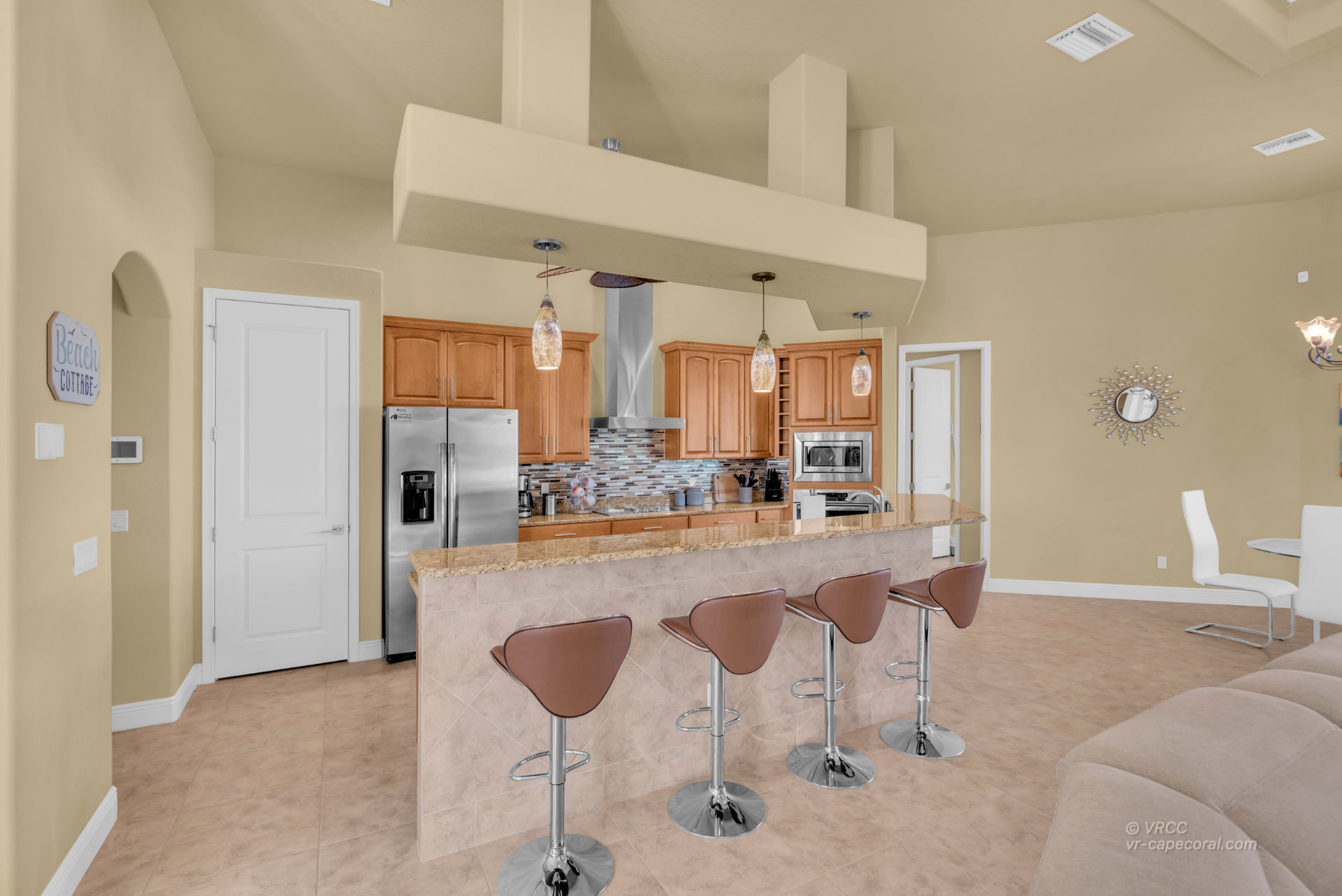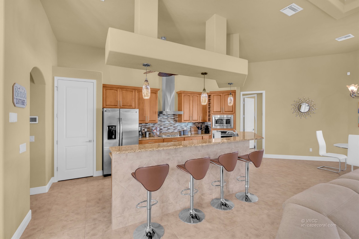The fully equipped gourmet kitchen features sleek cabinetry, stainless-steel appliances, and a spacious island with breakfast bar seating. Start your day with coffee at the bar, prep snacks for a day by the pool, or cook a full dinner to enjoy indoors or outside on the covered patio.