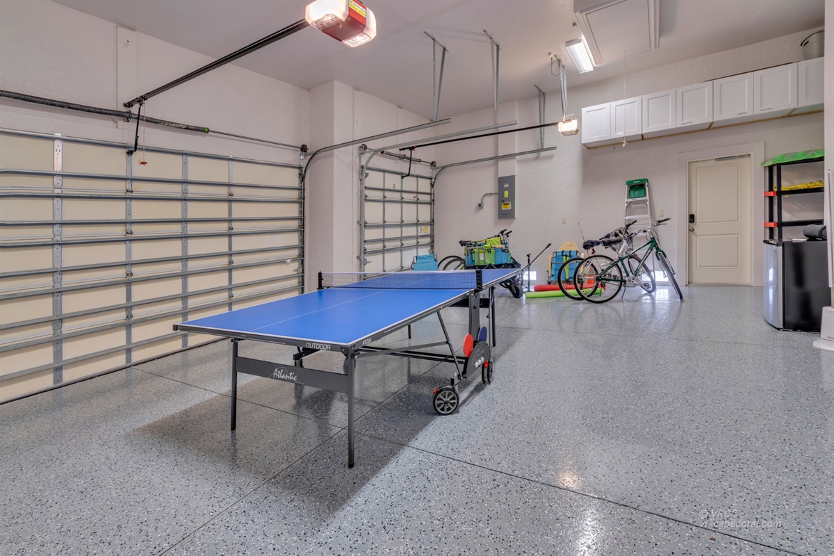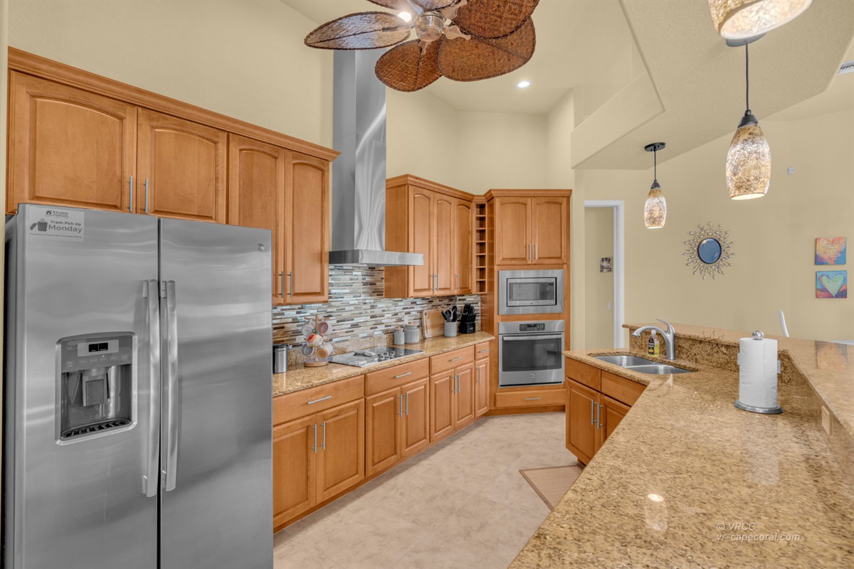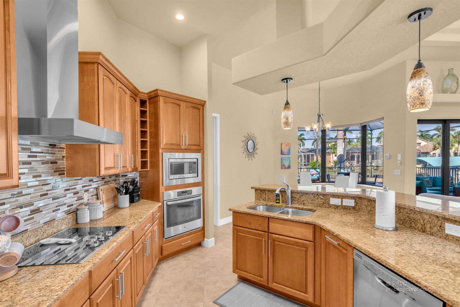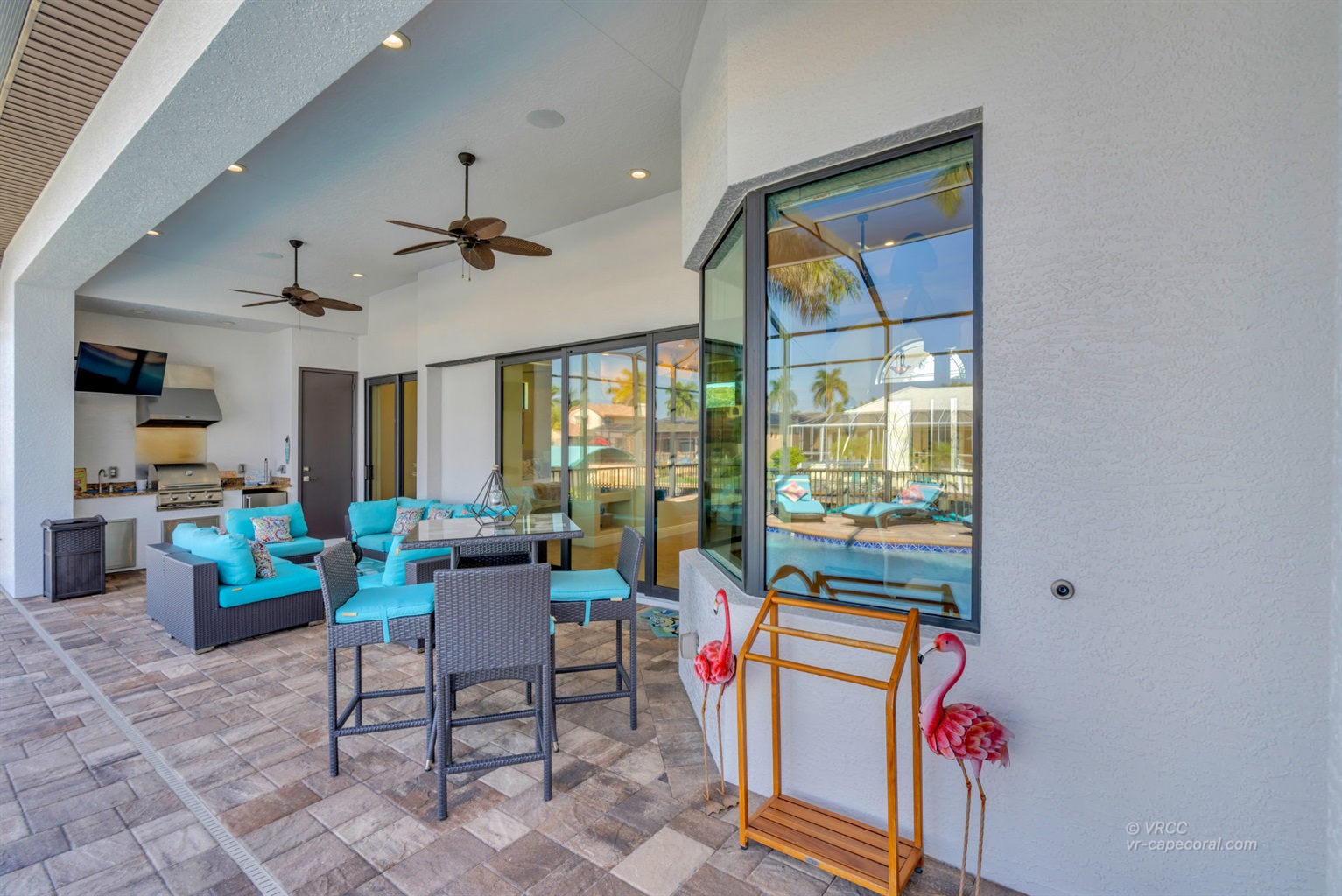 The fully equipped gourmet kitchen features sleek cabinetry, stainless-steel appliances, and a spacious island with breakfast bar seating. Start your day with coffee at the bar, prep snacks for a day by the pool, or cook a full dinner to enjoy indoors or outside on the covered patio.