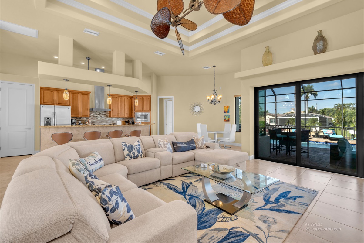 Step into the open-concept living area and you’re greeted by high ceilings, oversized modern sofas, and large sliding doors that frame the pool and canal views. It’s the perfect spot for movie nights, watching the big game, or simply lounging together while still feeling connected to the outdoor space.