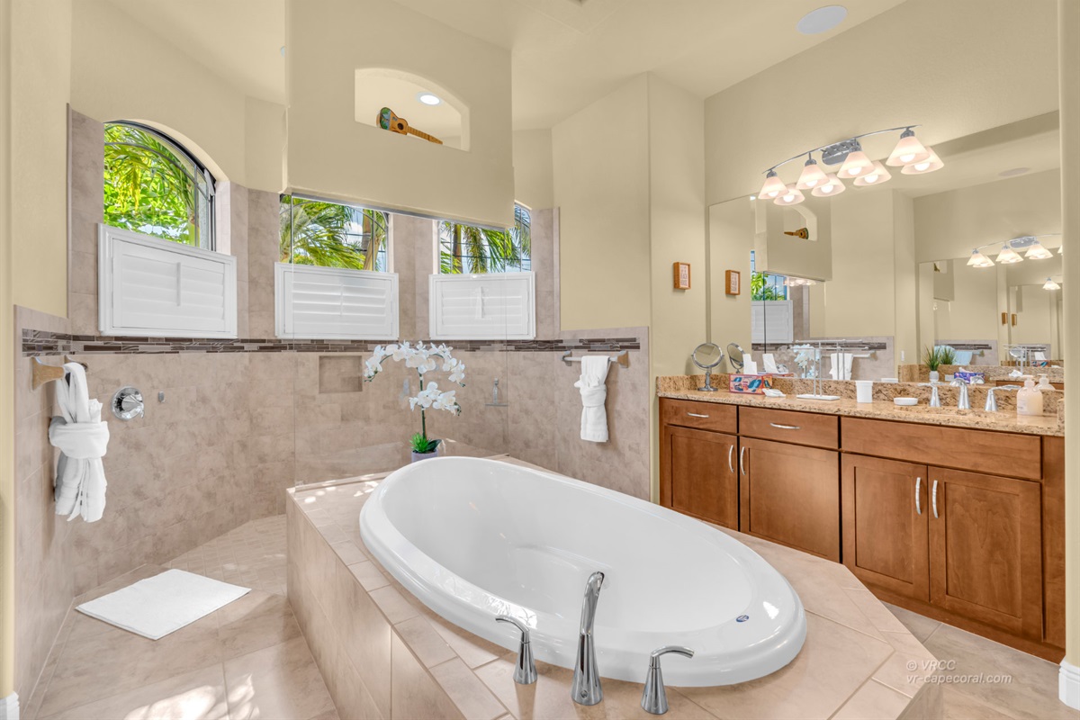 The master suite feels like your own private spa retreat, with a plush king bed, cozy sitting area, and direct access to the lanai for an early morning swim. The ensuite bathroom offers a large soaking tub, walk-in shower, and double vanities, creating a calm, luxurious space to unwind. Additional bedrooms are tastefully decorated with comfortable beds and ample storage, making it easy for families and groups to settle in.