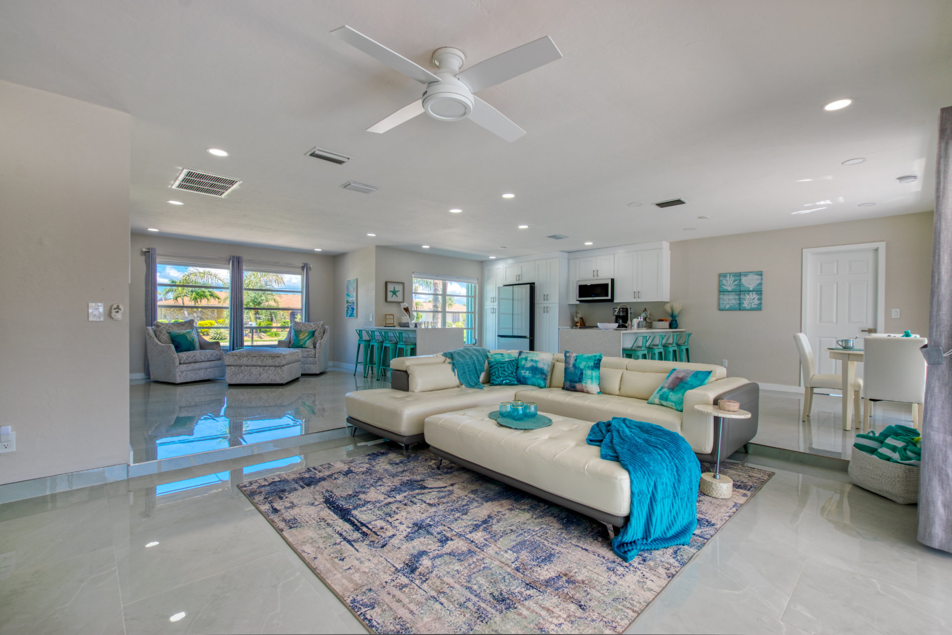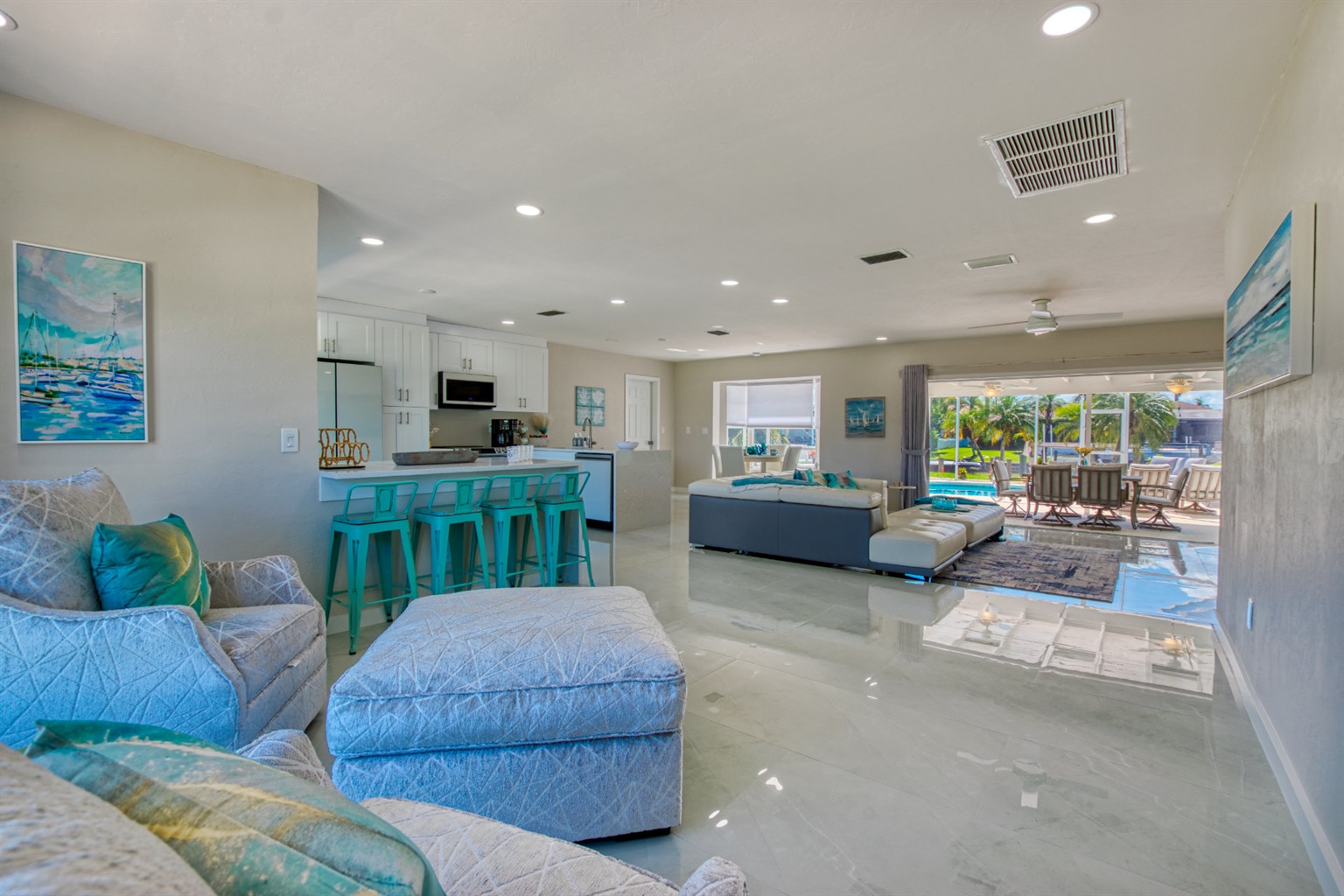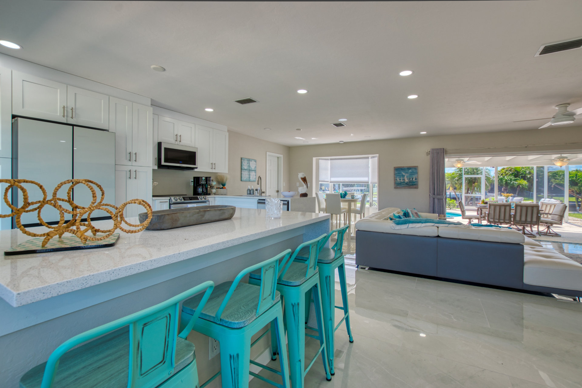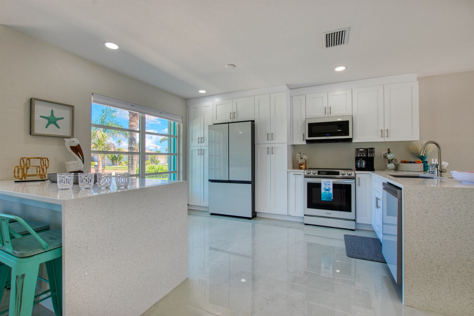 Step into a world of casual elegance with polished marble floors that stretch throughout the house, and the beautifully bright atmosphere, thanks to plenty of natural light. Featuring other luxe natural finishes, the soft neutral palette is has cheerful pops of blue that pay homage to our waterfront paradise.