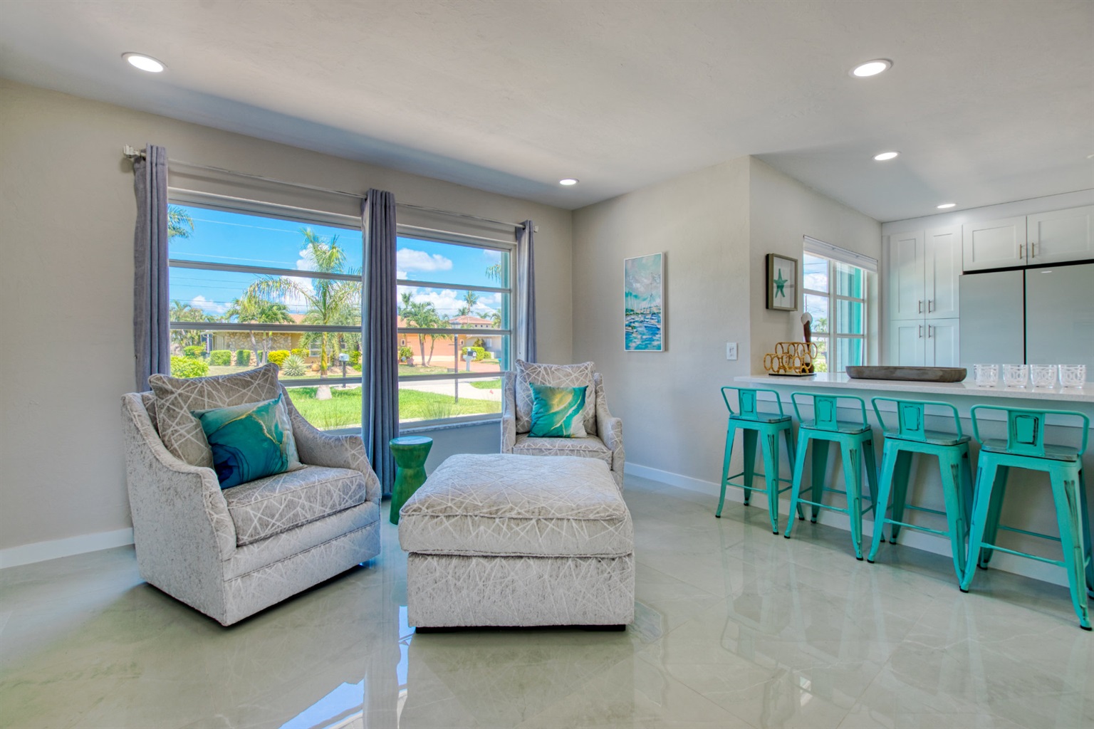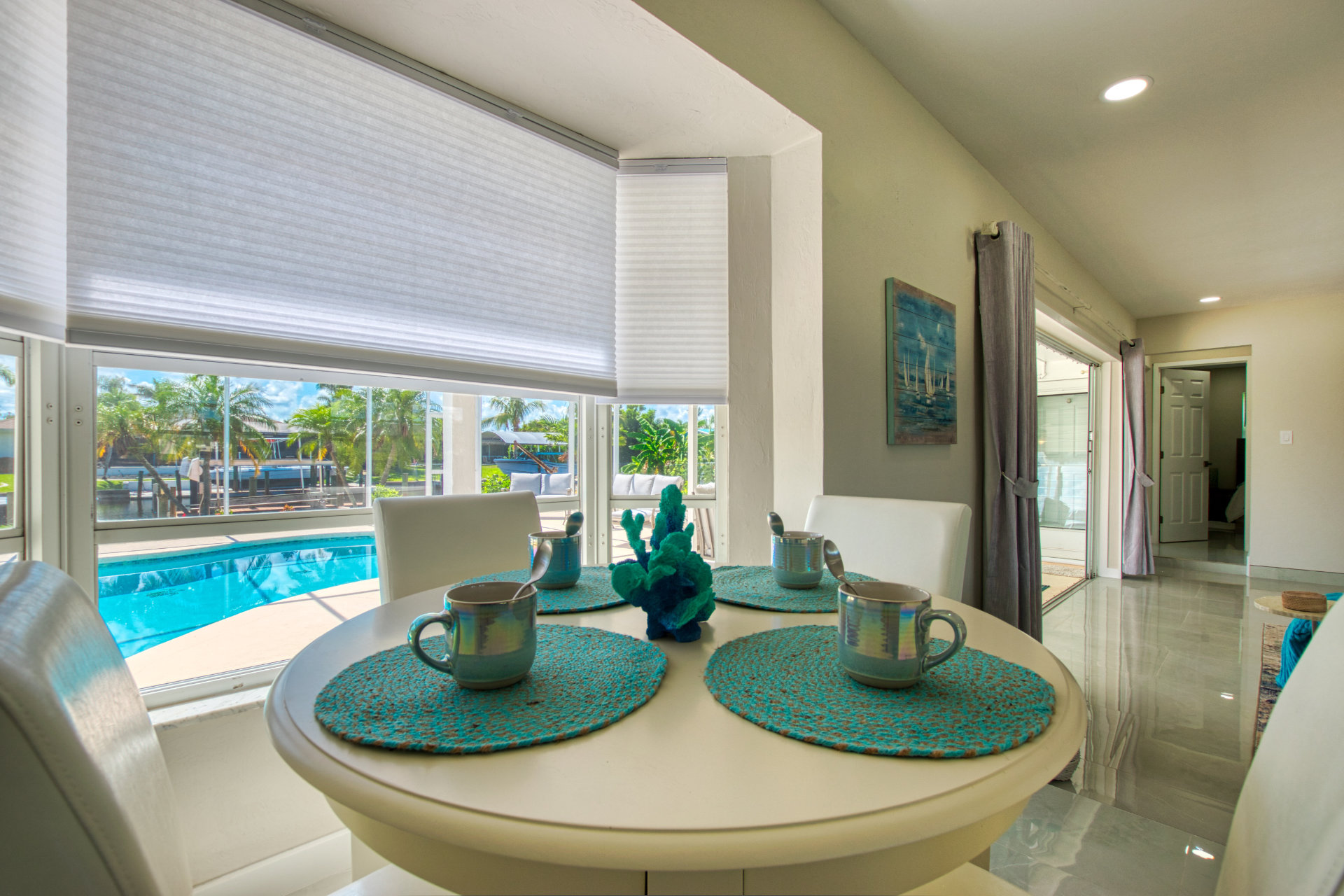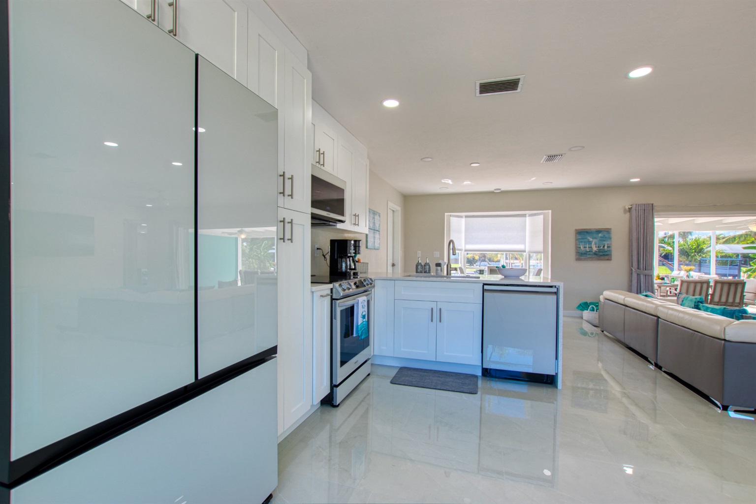 Step into a world of casual elegance with polished marble floors that stretch throughout the house, and the beautifully bright atmosphere, thanks to plenty of natural light. Featuring other luxe natural finishes, the soft neutral palette is has cheerful pops of blue that pay homage to our waterfront paradise.
