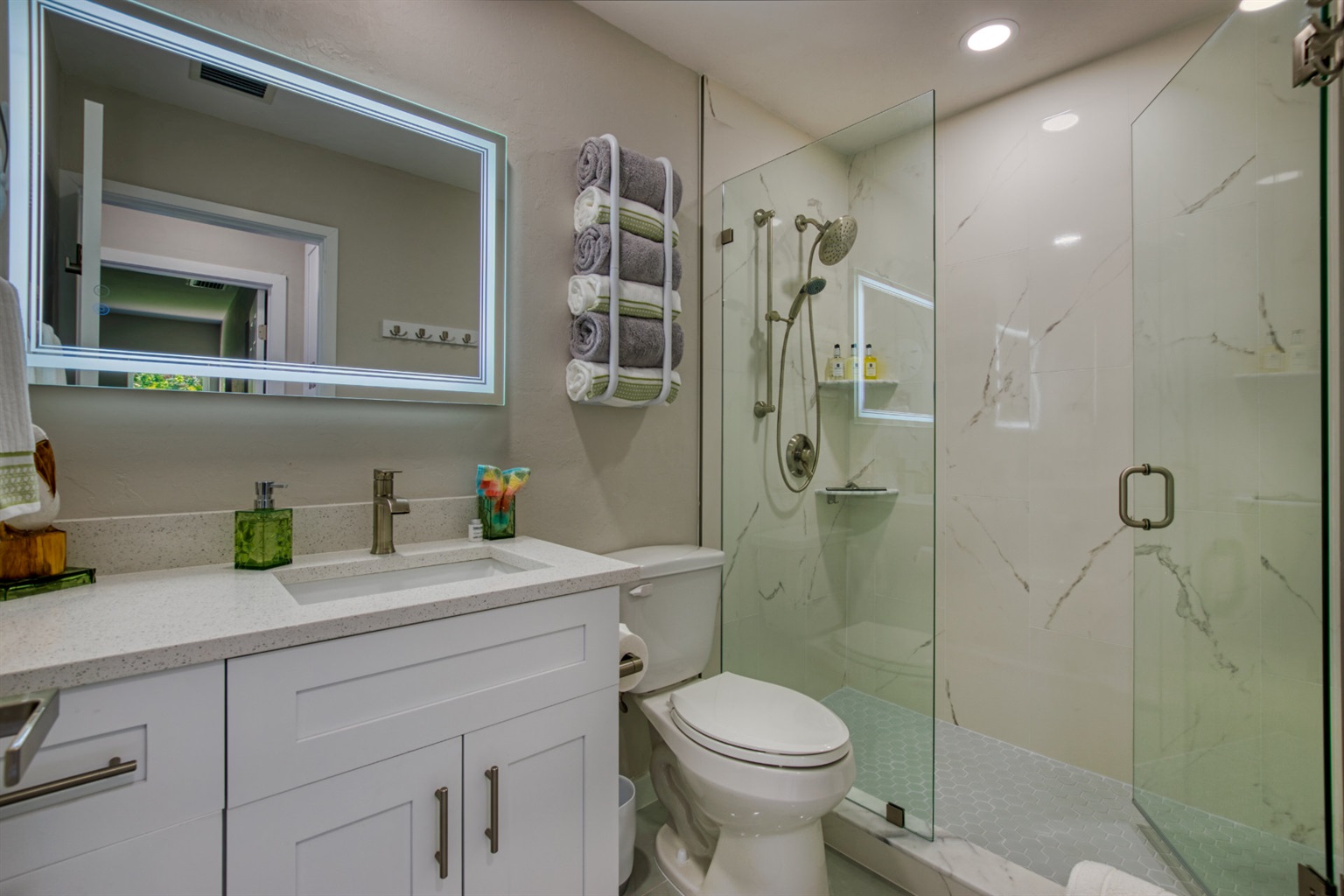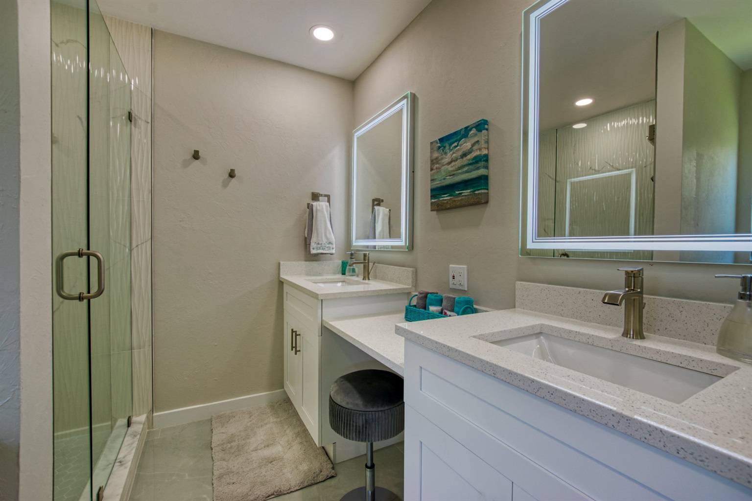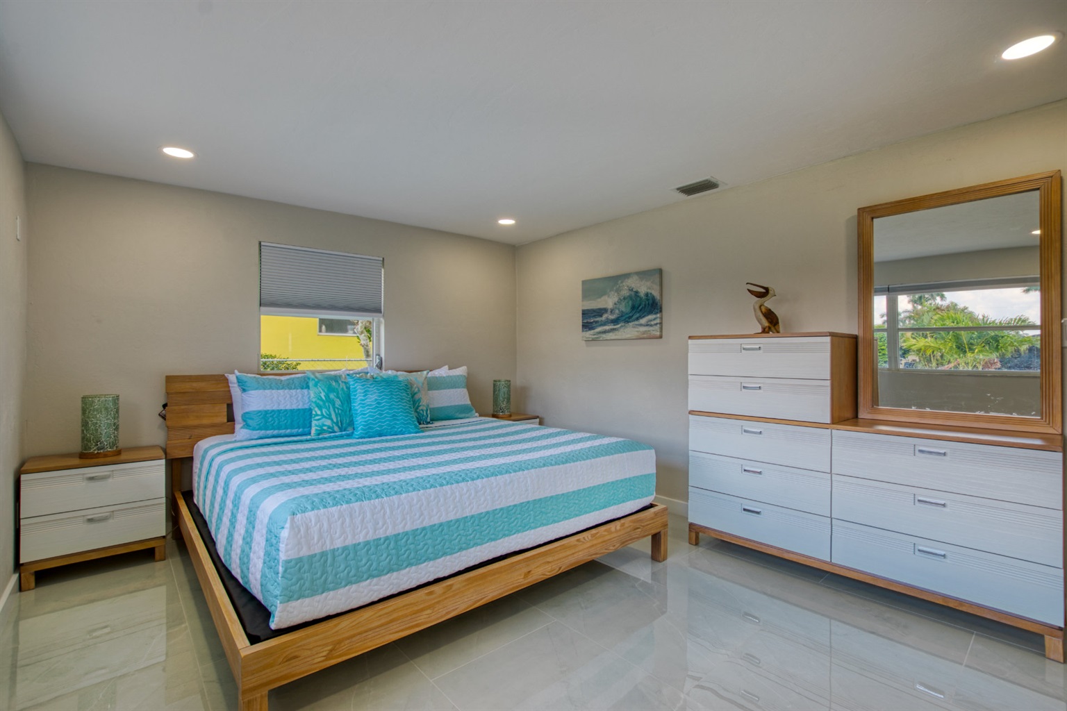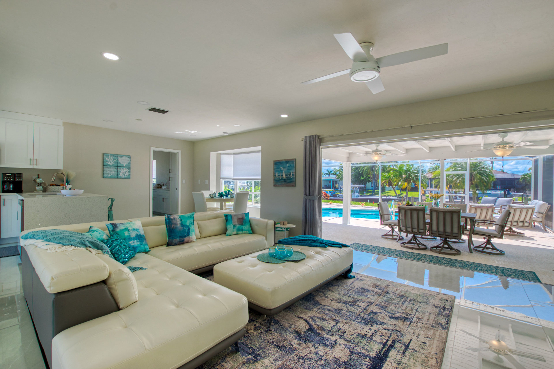 Step into a world of casual elegance with polished marble floors that stretch throughout the house, and the beautifully bright atmosphere, thanks to plenty of natural light. Featuring other luxe natural finishes, the soft neutral palette is has cheerful pops of blue that pay homage to our waterfront paradise.
