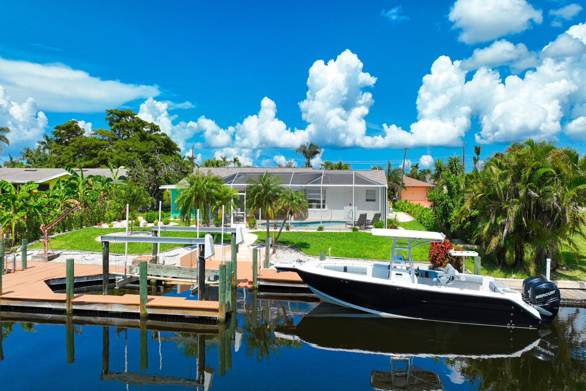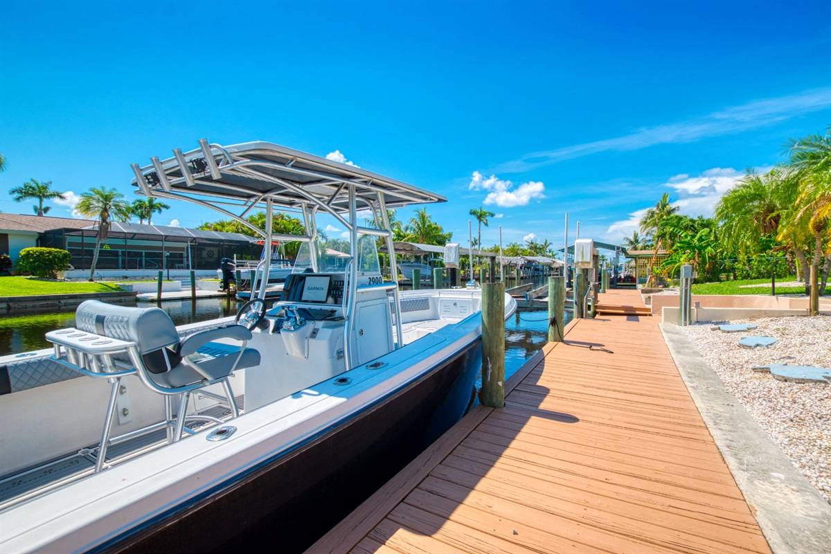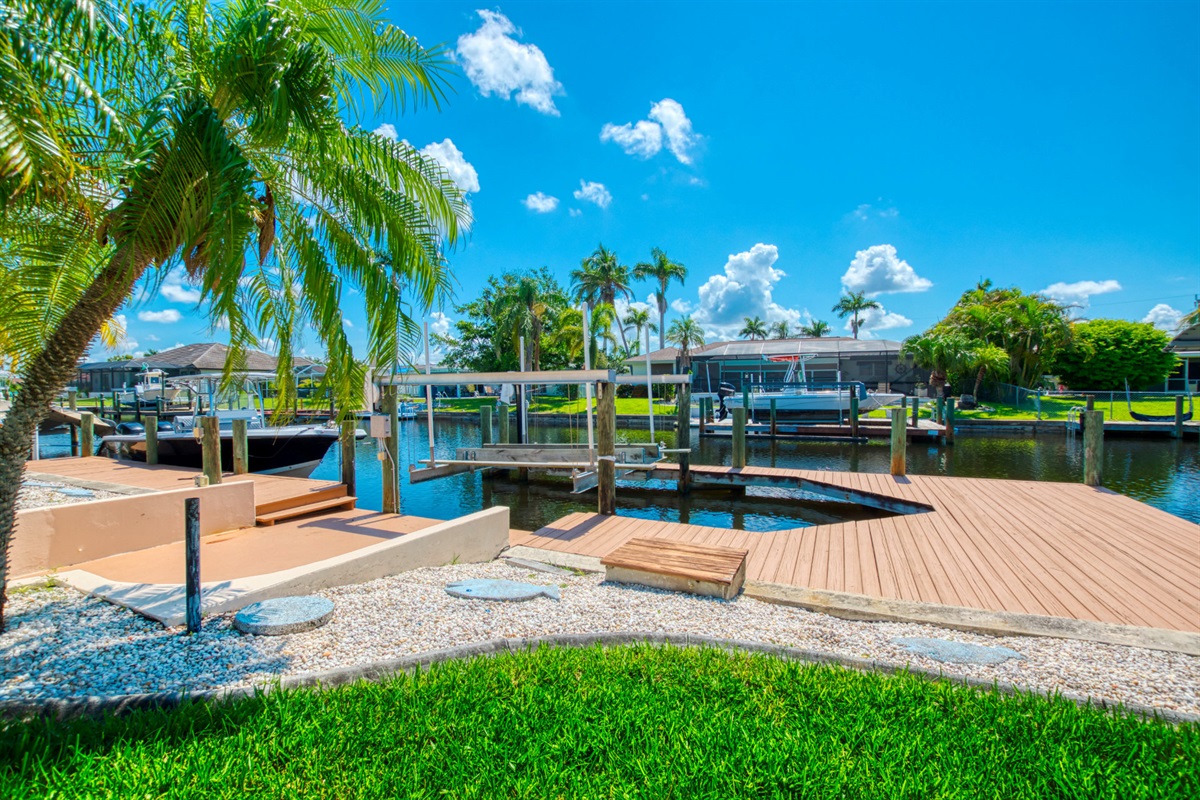 Last but certainly not least, Villa Blue Pelican offers a huge dock with a boat lift, perfect for fishing from or gathering before you sail away for the day. If you're excited to get on the water, we're happy to arrange a boat rental and have it delivered straight to your dock.