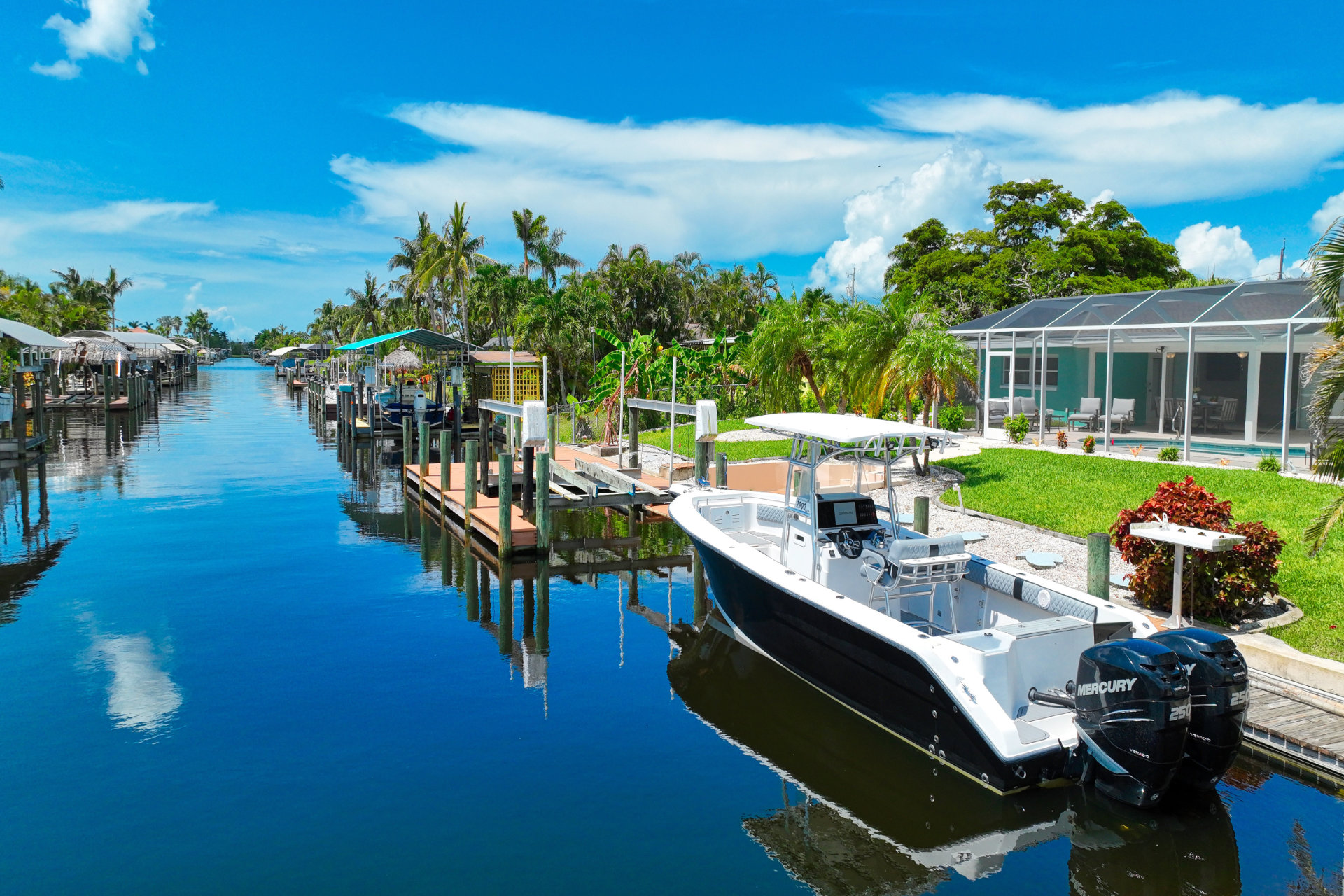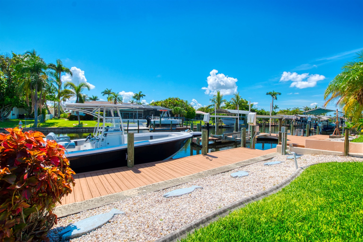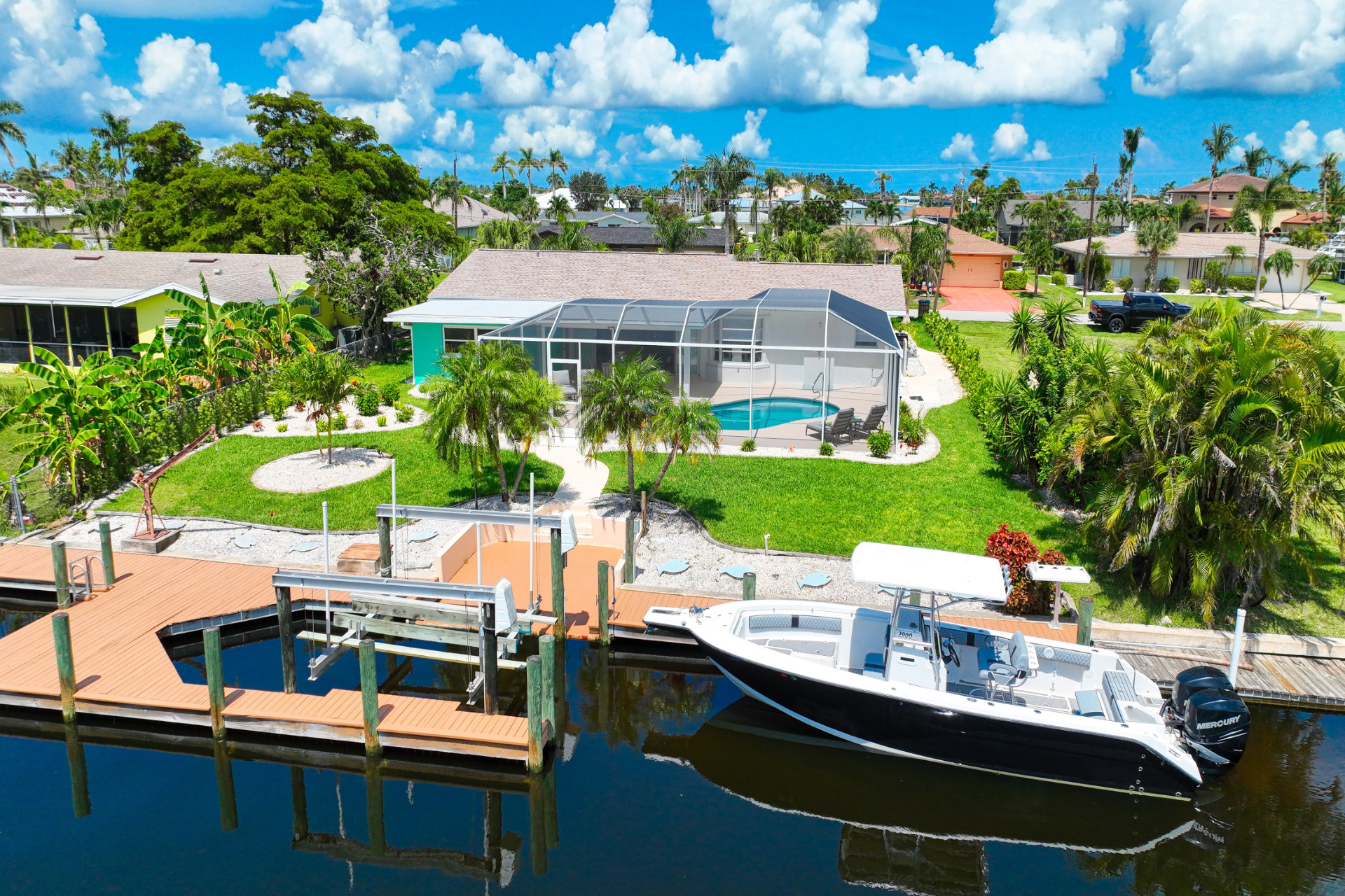 Last but certainly not least, Villa Blue Pelican offers a huge dock with a boat lift, perfect for fishing from or gathering before you sail away for the day. If you're excited to get on the water, we're happy to arrange a boat rental and have it delivered straight to your dock.
