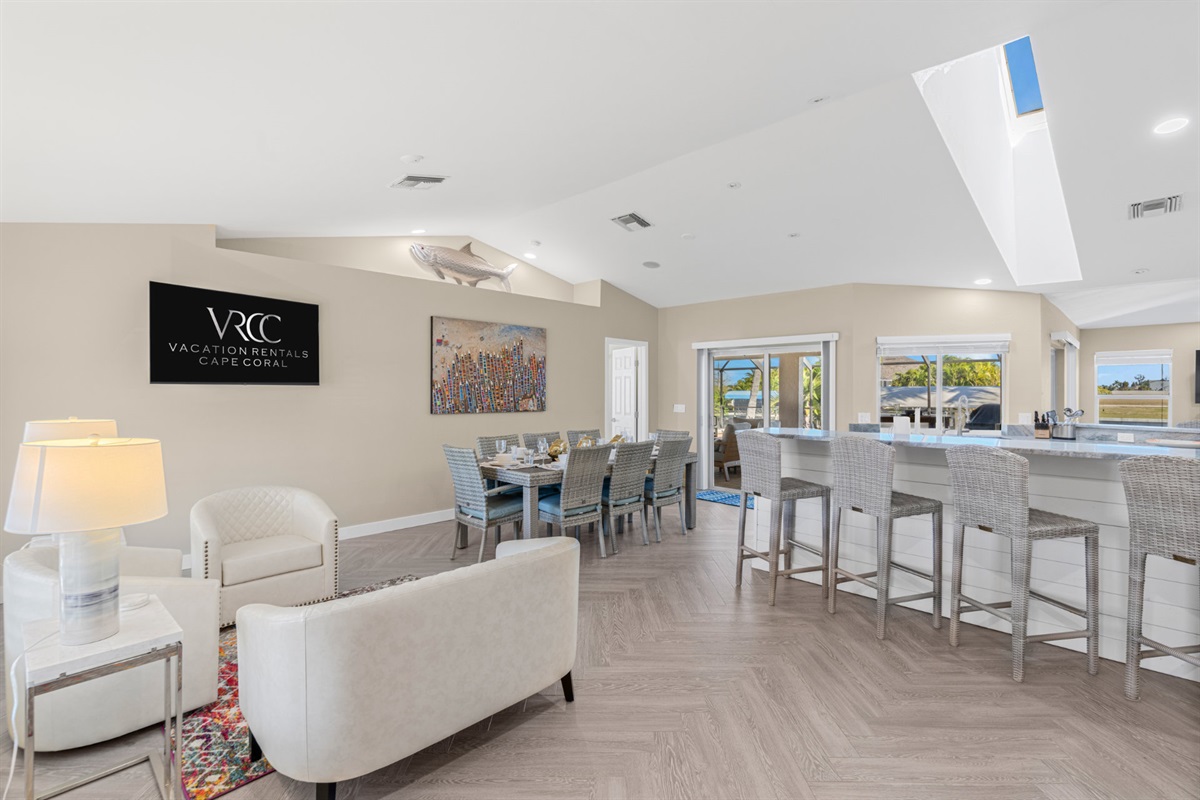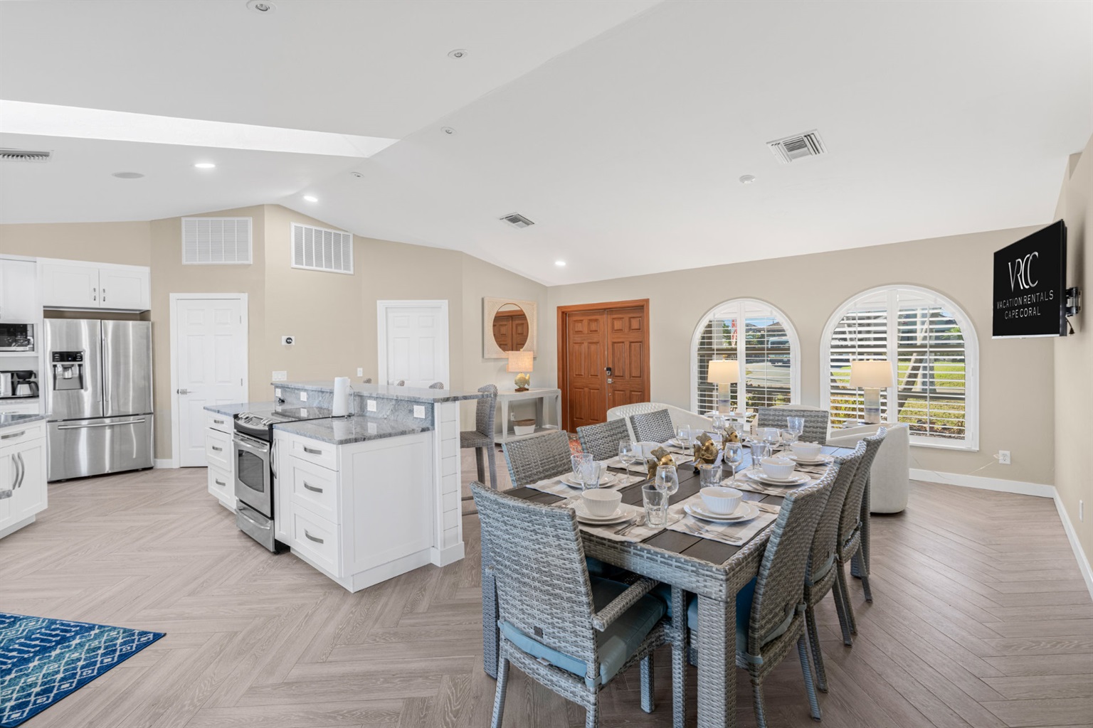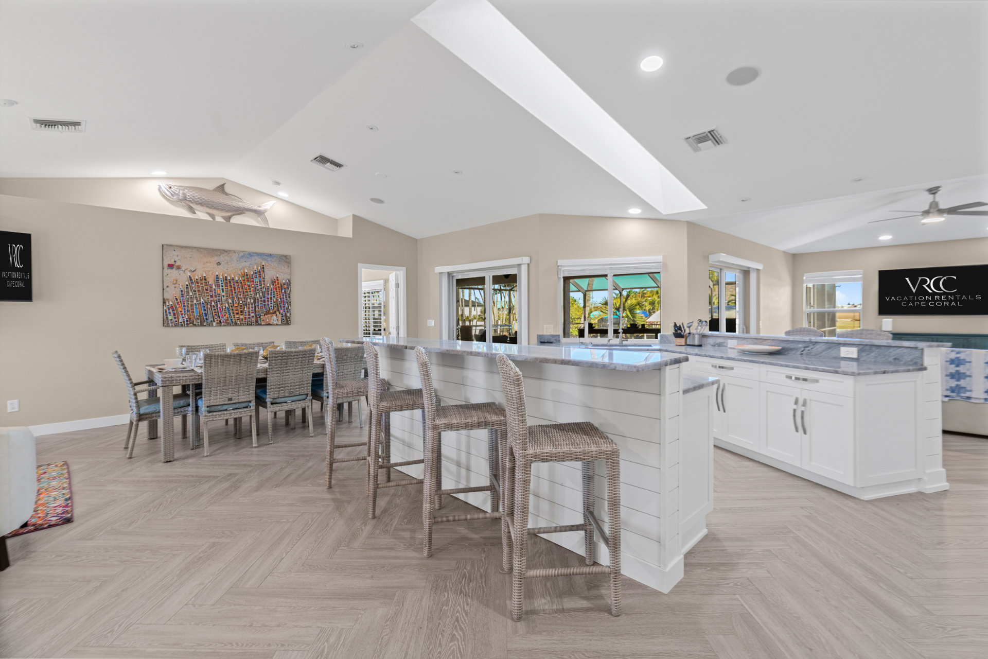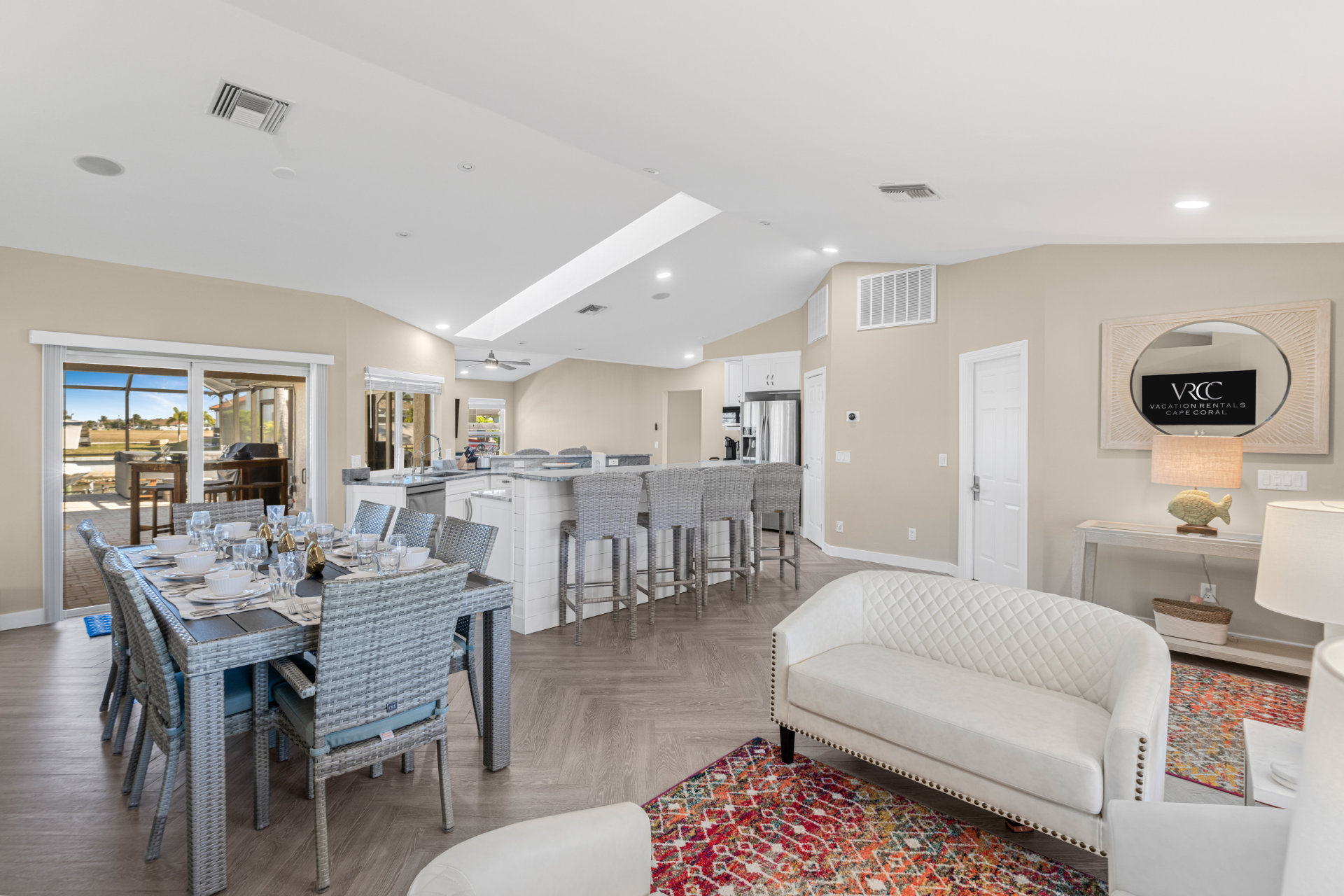 The open floor plan connects the living area, dining space, and fully equipped kitchen—so everyone can stay part of the conversation, from morning coffee to evening cocktails.