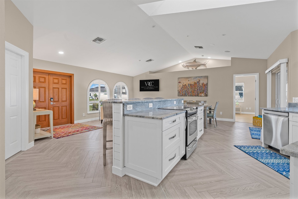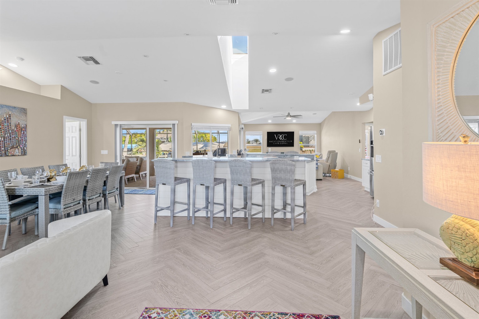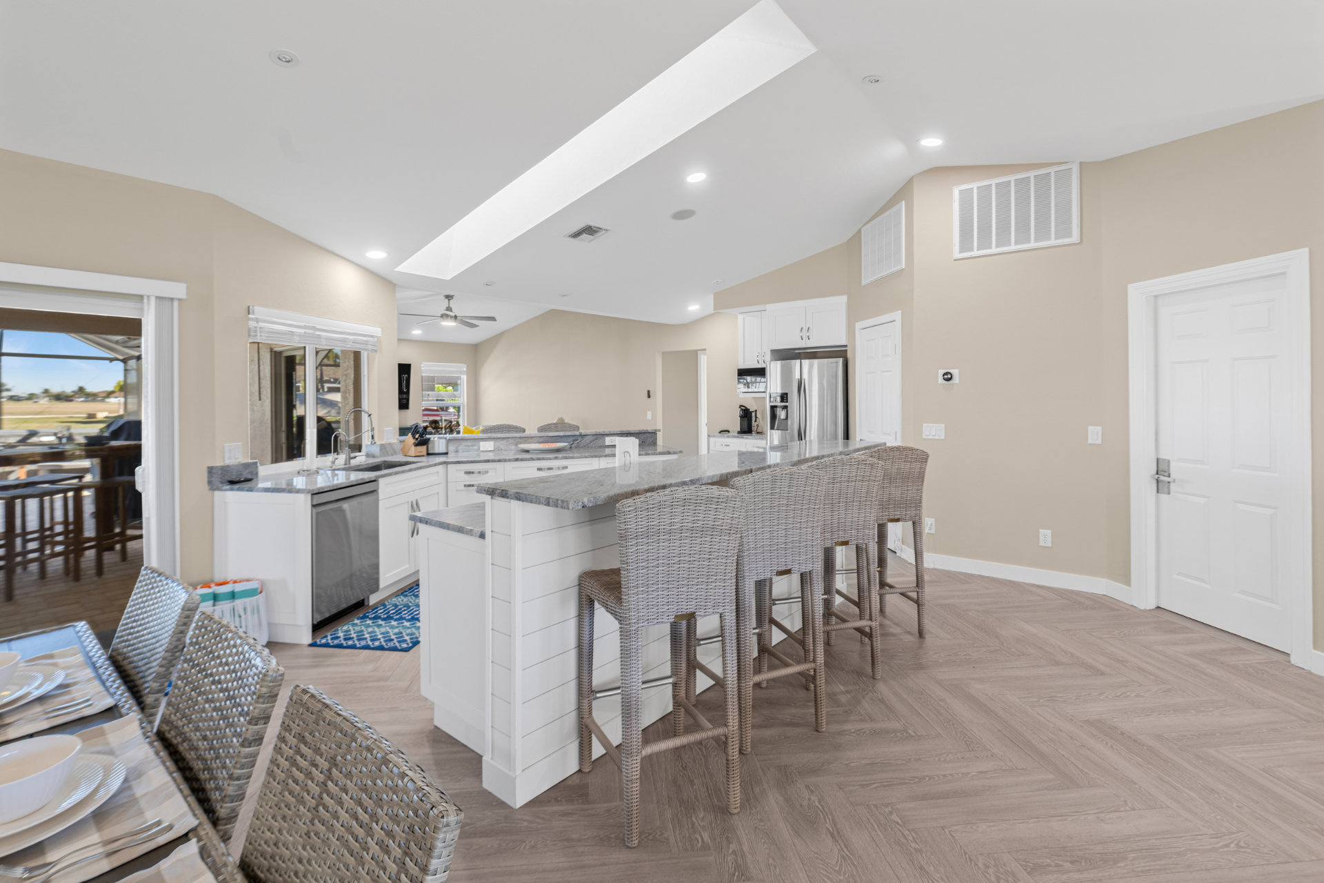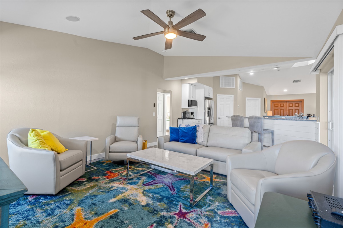 The open floor plan connects the living area, dining space, and fully equipped kitchen—so everyone can stay part of the conversation, from morning coffee to evening cocktails.