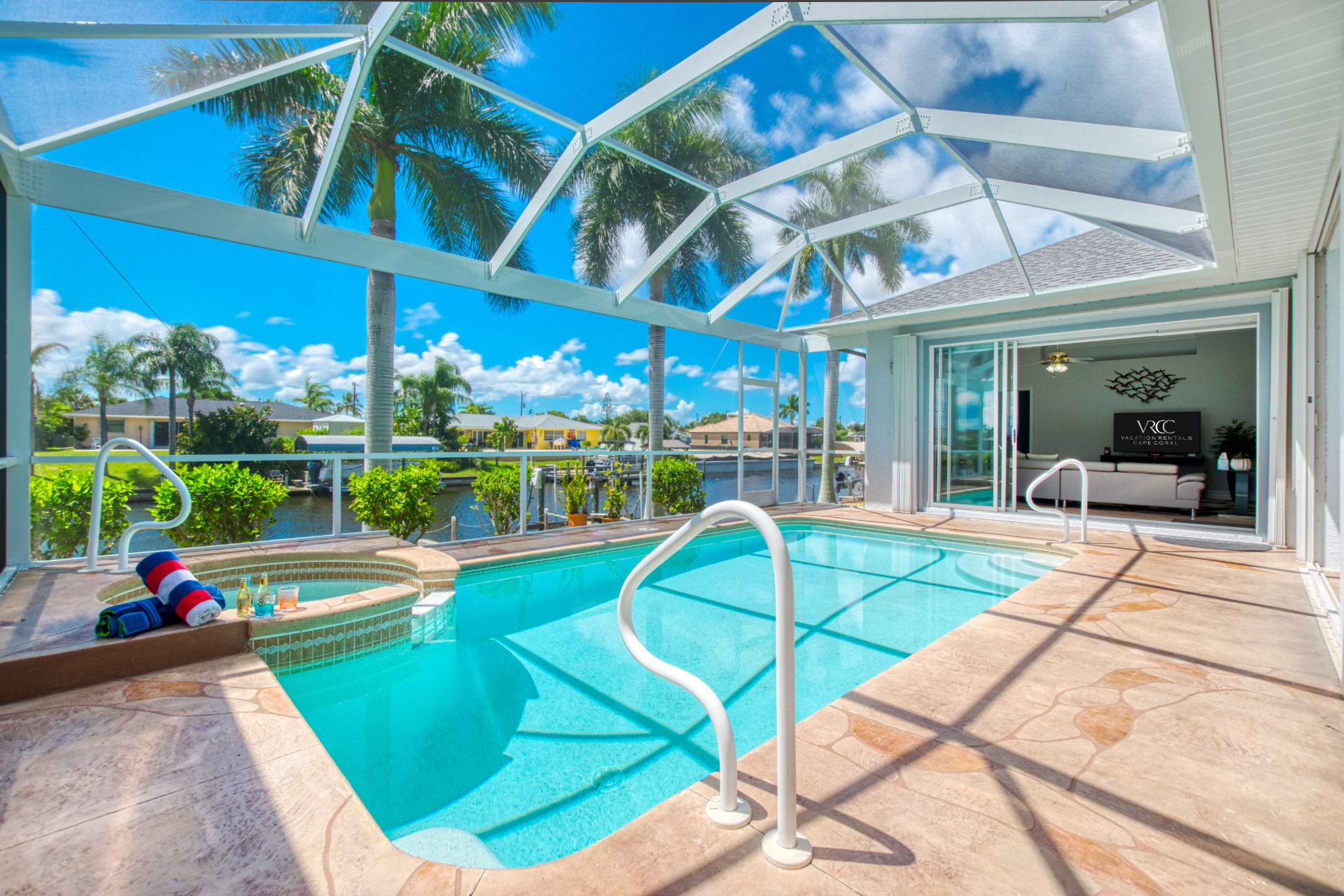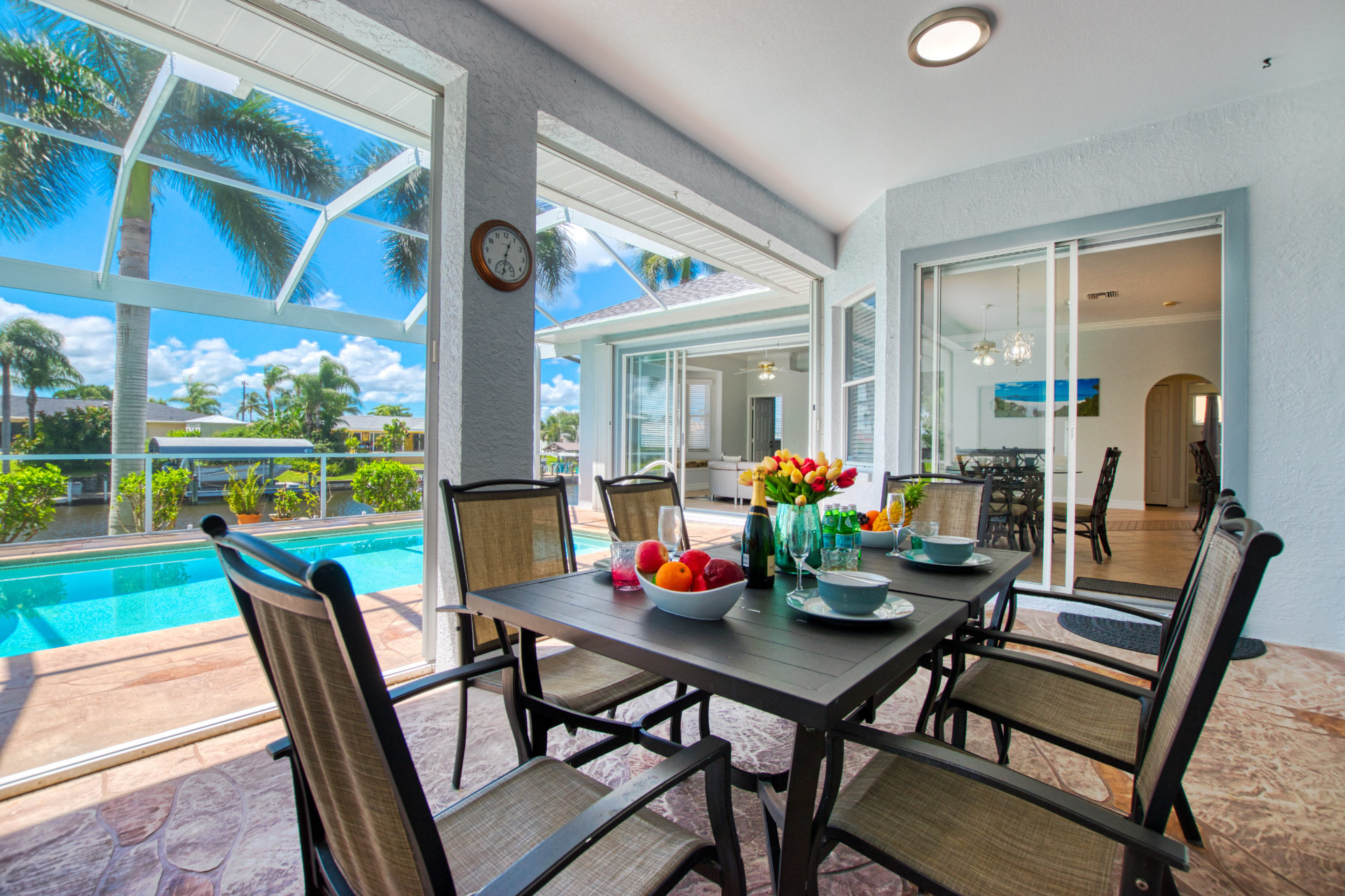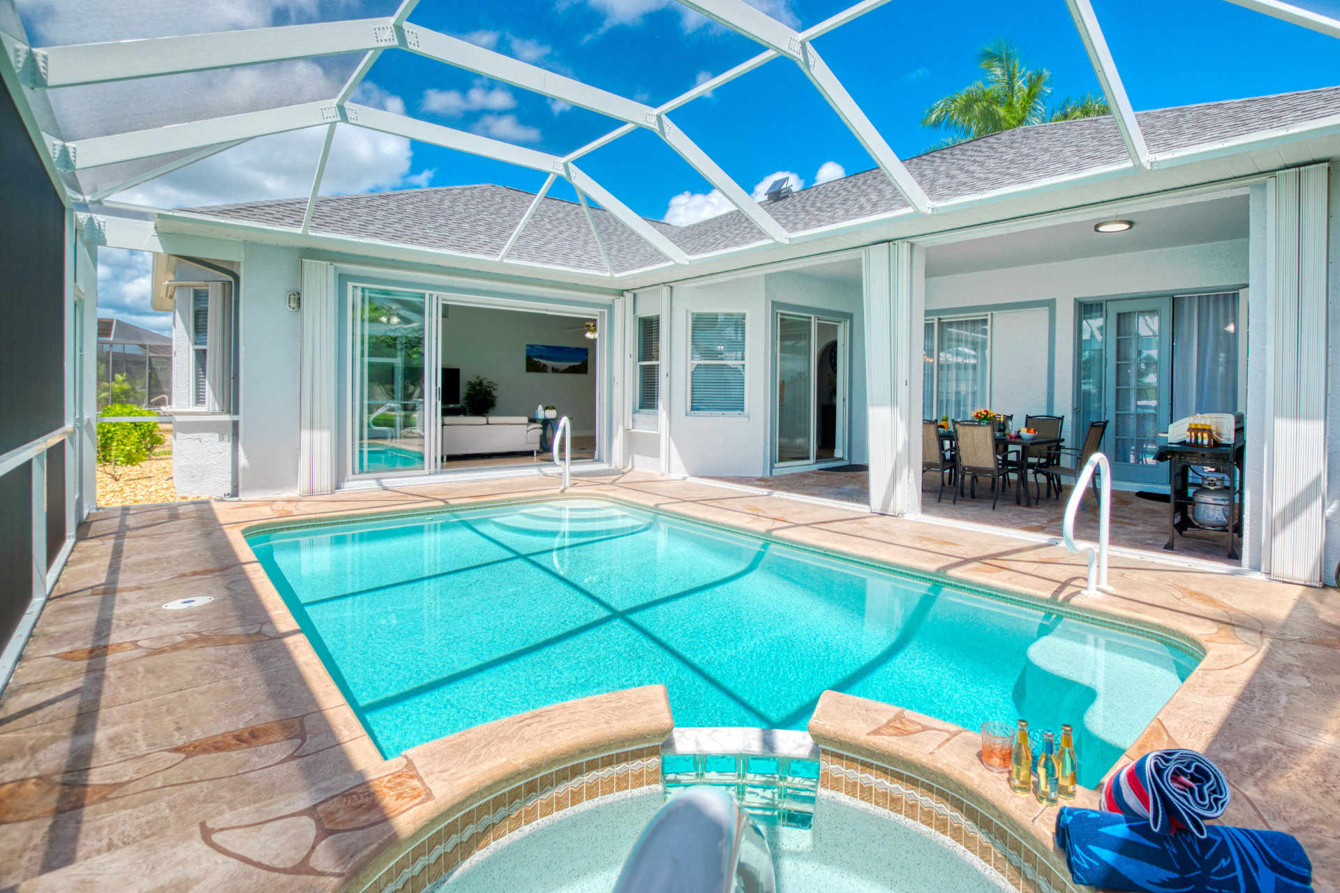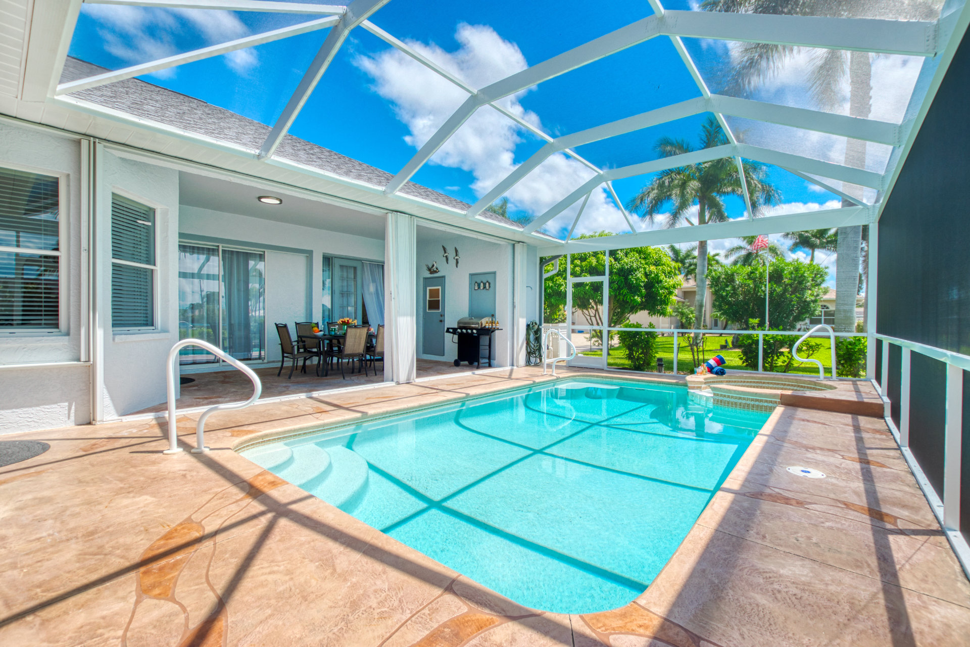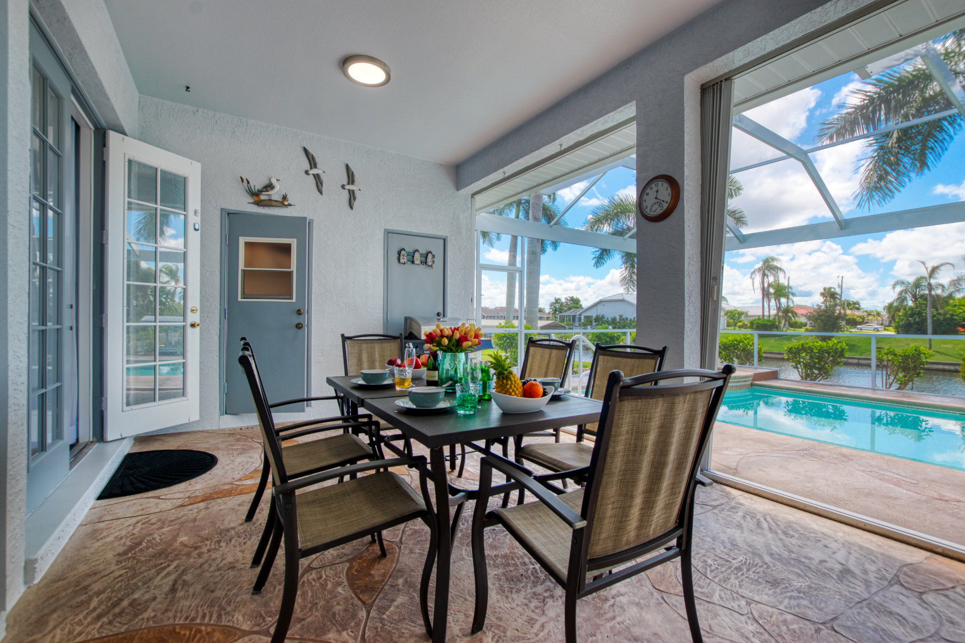 4 Bedrooms • 3 Bathrooms (2 full, 1 half) 3 Baths (2 full, 1 half) • Sleeps 5-8Villa Coral Cabana is a peaceful, beautifully furnished home at the end of a quiet street in the center of SE Cape Coral. Its lanai with heated pool and spa has a spectacular Southern exposure for you to enjoy the Florida sun from smooth sunrises to spectacular sunsets. The setting is ideal for boaters, anglers, and sunshine lovers.