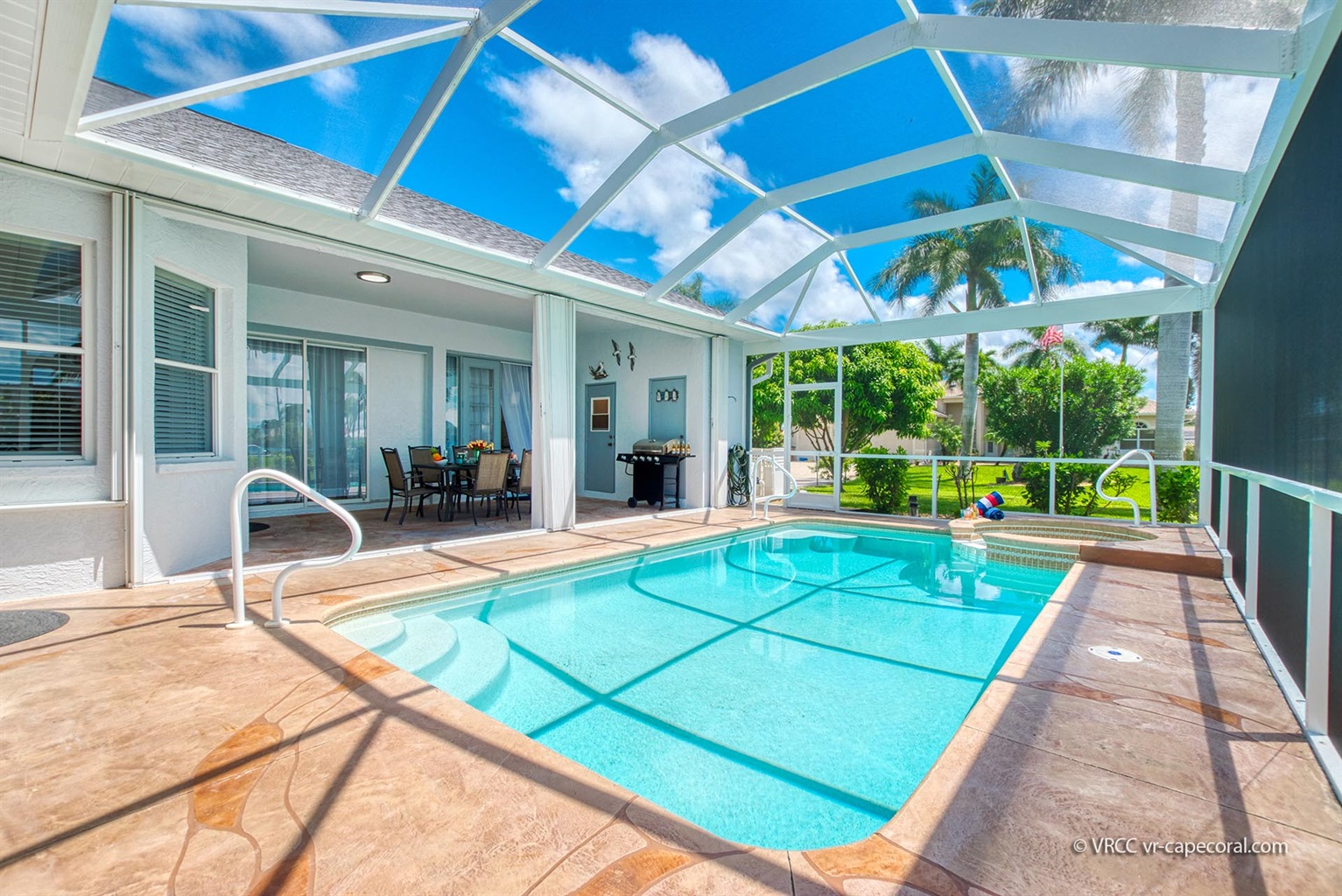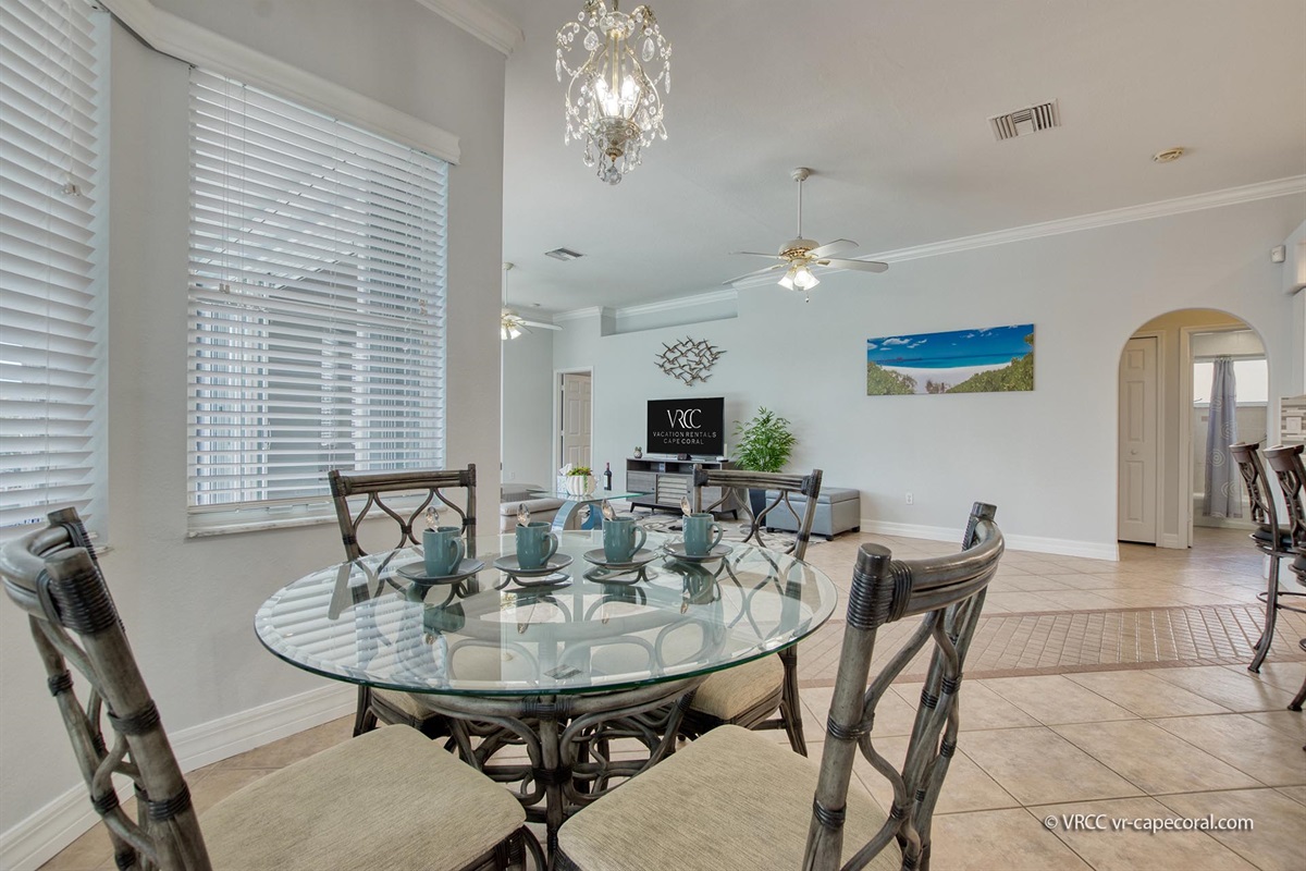 Villa Coral Cabana is a peaceful, beautifully furnished home at the end of a quiet street in the center of SE Cape Coral. Its lanai with heated pool and spa has a spectacular Southern exposure for you to enjoy the Florida sun from smooth sunrises to spectacular sunsets. The setting is ideal for boaters, anglers, and sunshine lovers.