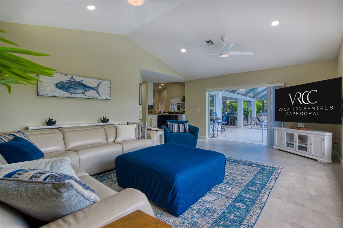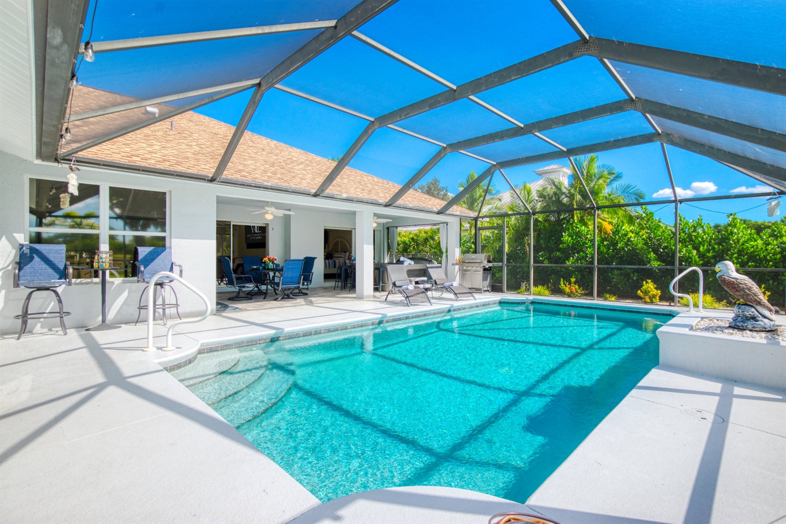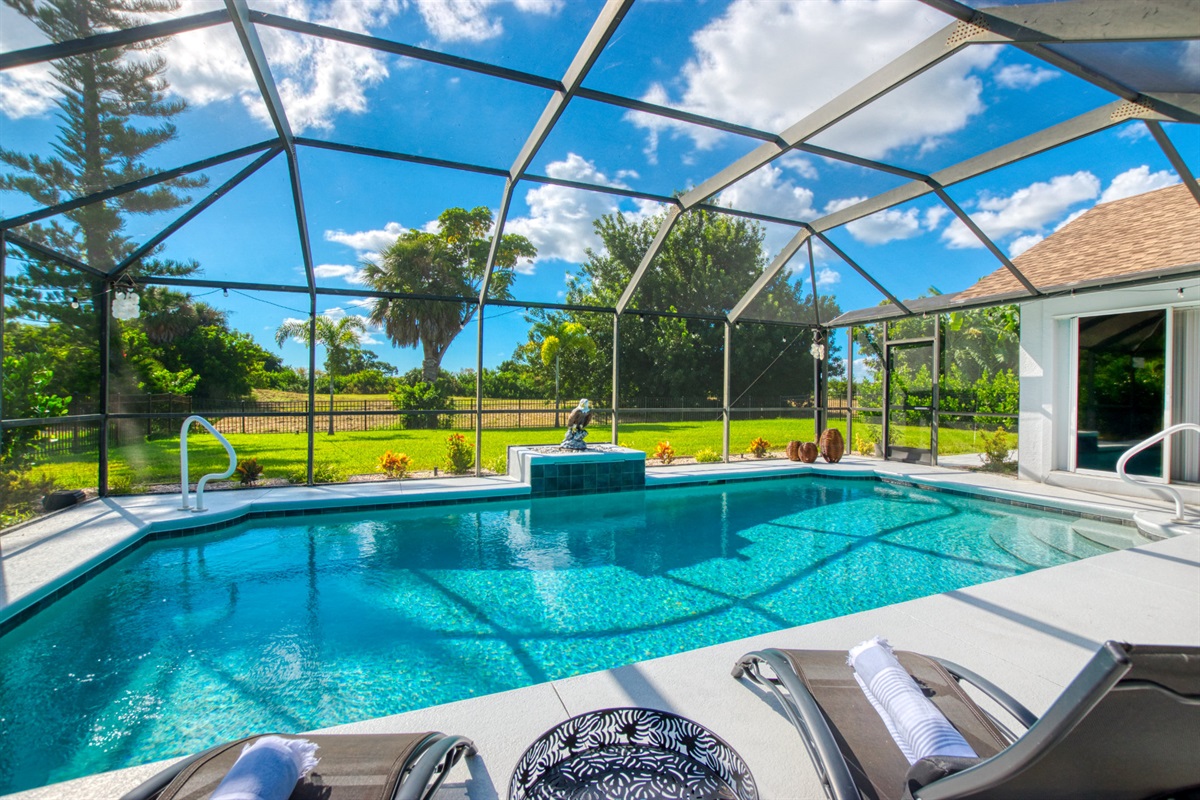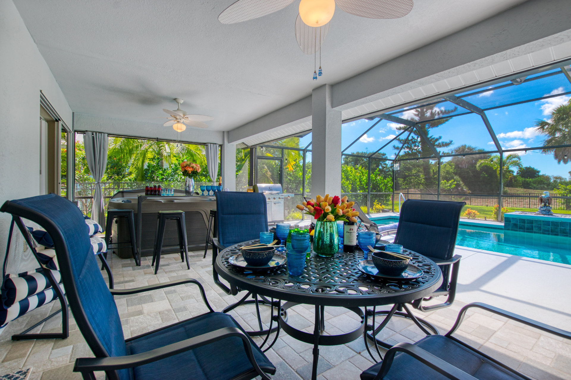 As you make your way through the house, you'll discover a large lanai that opens up to a sparkling pool and private backyard perfect for basking in the Florida sun and lounging by the poolside with your favorite drink in hand. The surrounding greenery creates a sense of serenity and privacy, making it the perfect place to unwind and enjoy your vacation.