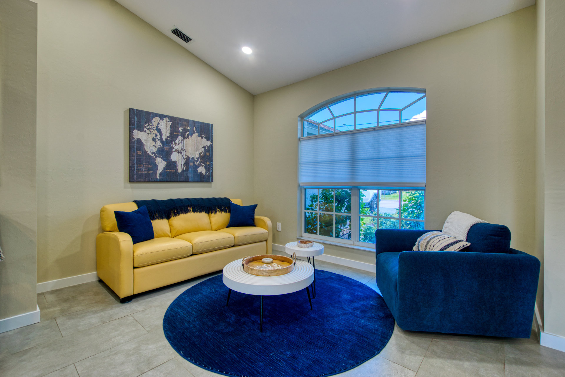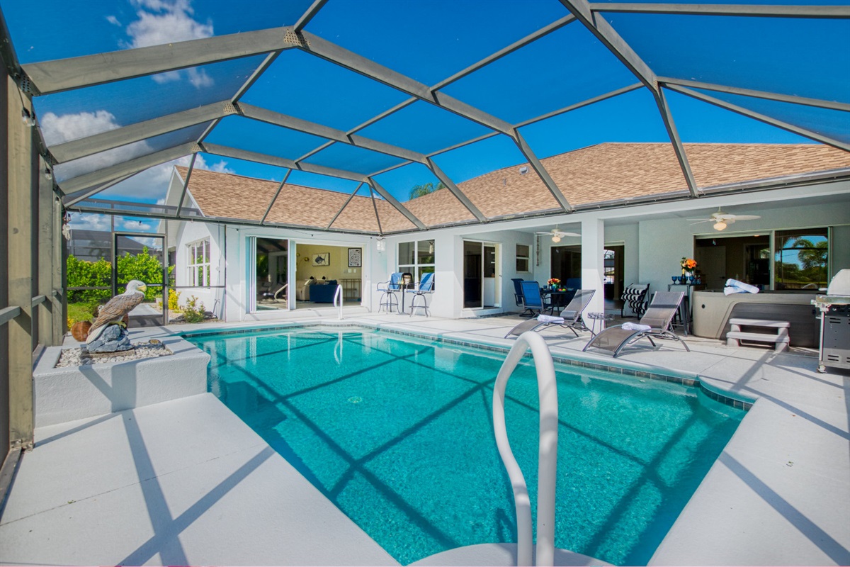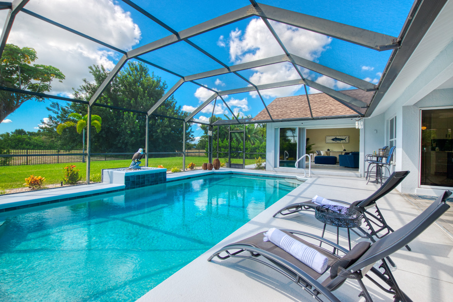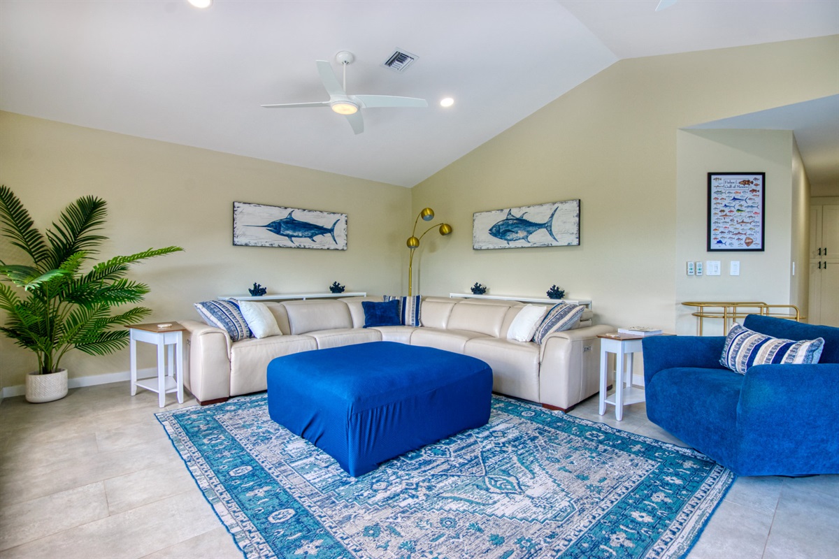As you make your way through the house, you'll discover a large lanai that opens up to a sparkling pool and private backyard perfect for basking in the Florida sun and lounging by the poolside with your favorite drink in hand. The surrounding greenery creates a sense of serenity and privacy, making it the perfect place to unwind and enjoy your vacation.