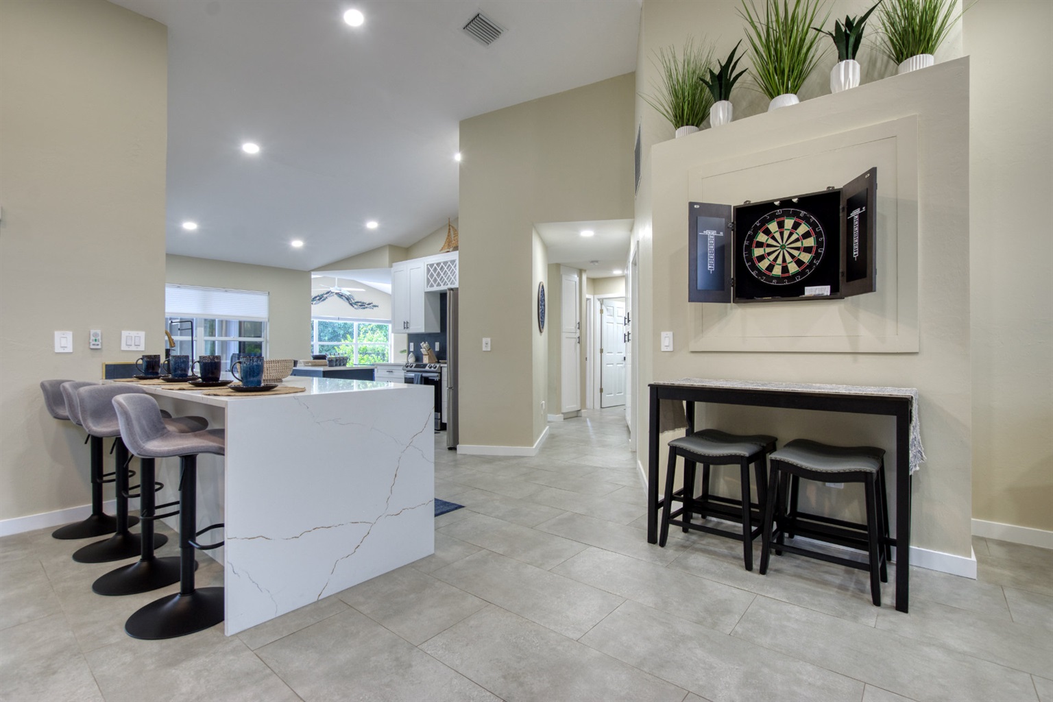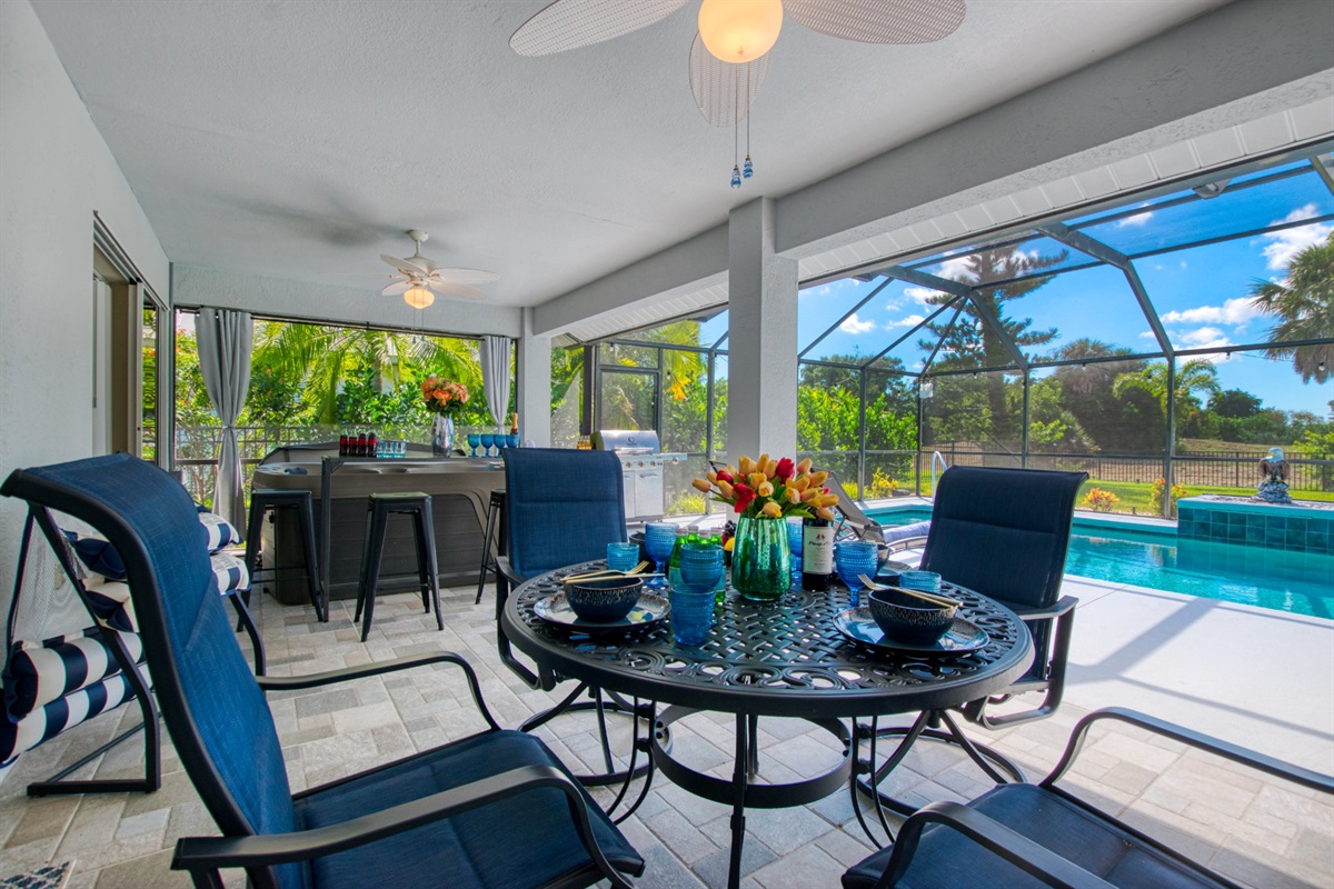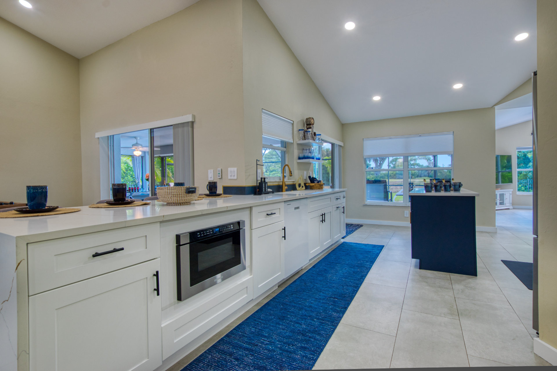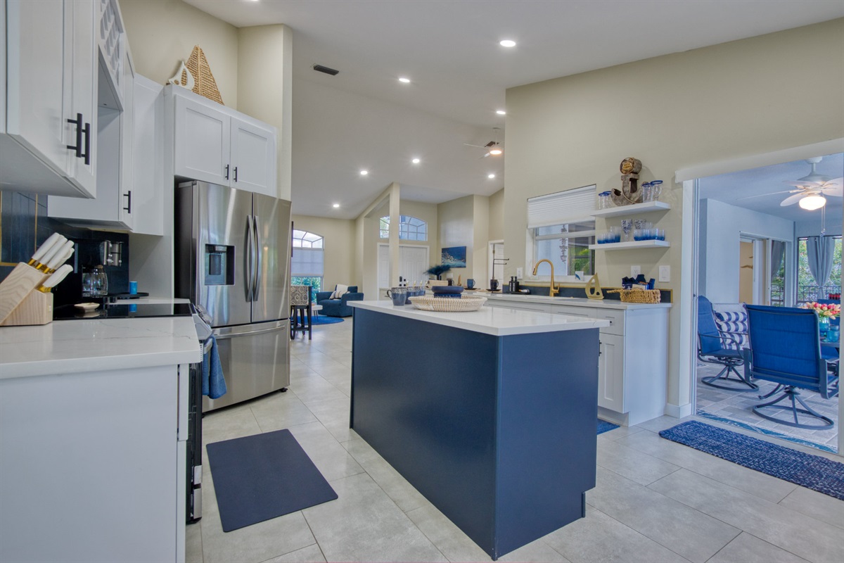 The kitchen boasts top of the line appliances and plenty of counter space, making it a pleasure to prepare meals for your family and friends. Whether you're whipping up a gourmet dinner or mixing up a cocktail to savor on the lanai, the kitchen has everything you need.
