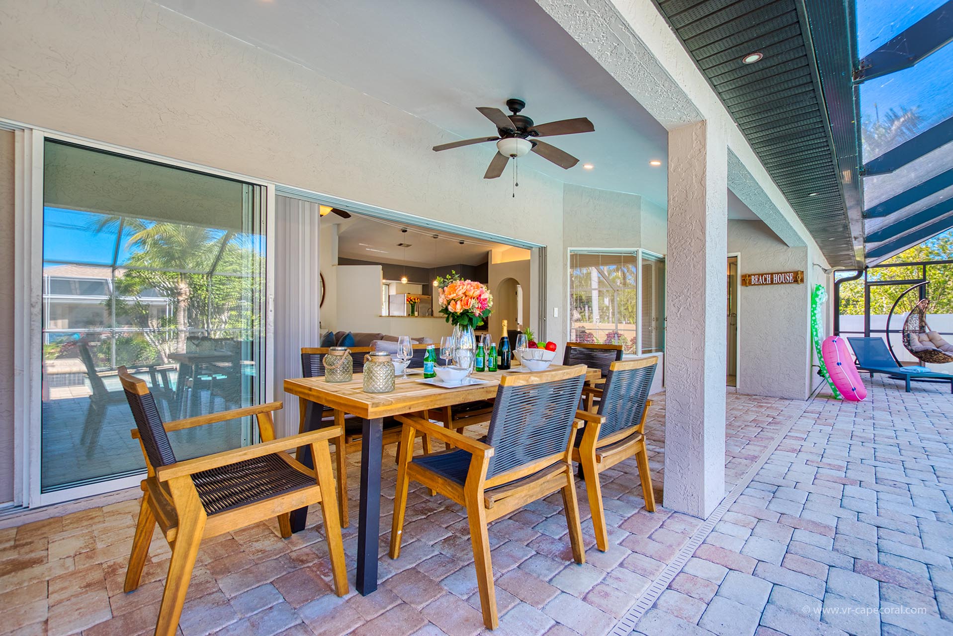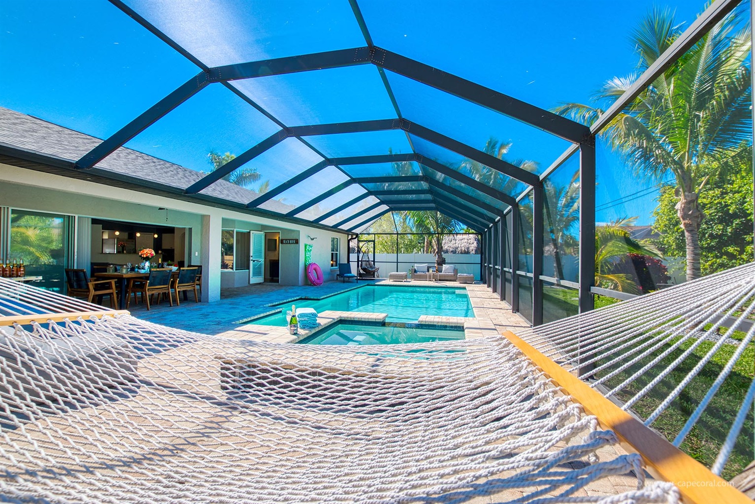 This vacation haven offers all the expected amenities for a delightful stay. Three spacious bedrooms await our guests, ensuring comfort and relaxation. The outdoor space stands out as a prime feature of this residence. The elegant, sunlit living room provides a perfect vantage point to admire the expansive pool. With sliding glass doors that open completely, the seamless transition between indoors and outdoors creates an immersive experience. The covered lounge area and dining table add a touch of comfort, providing shade for a truly enjoyable retreat. Villa Endless Summer promises a unique and unforgettable experience in Cape Coral.