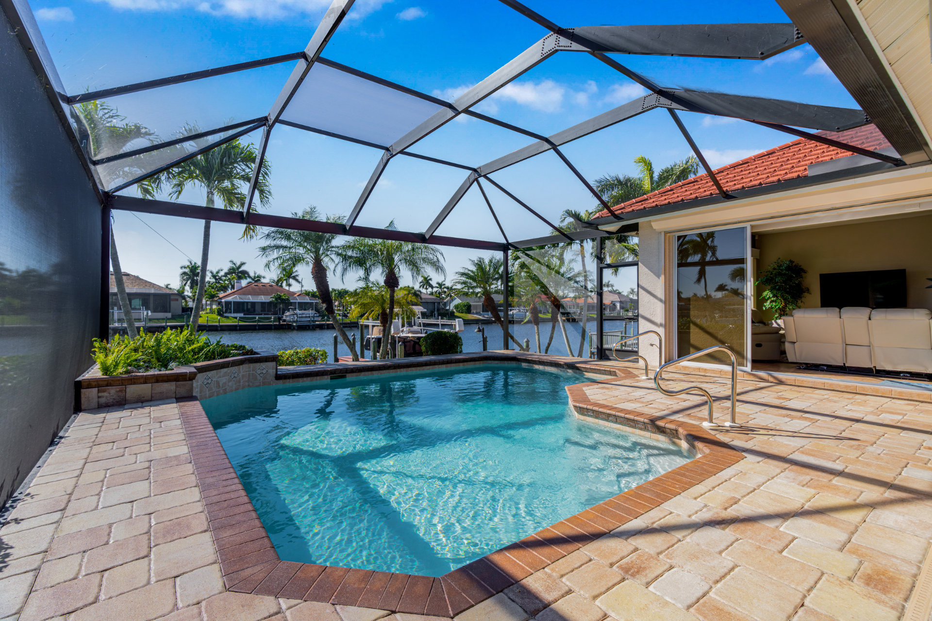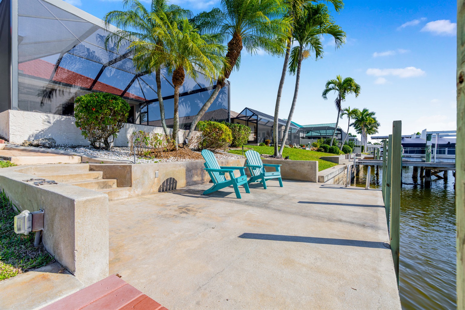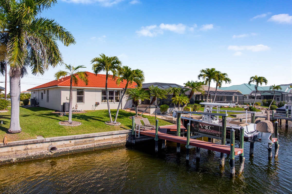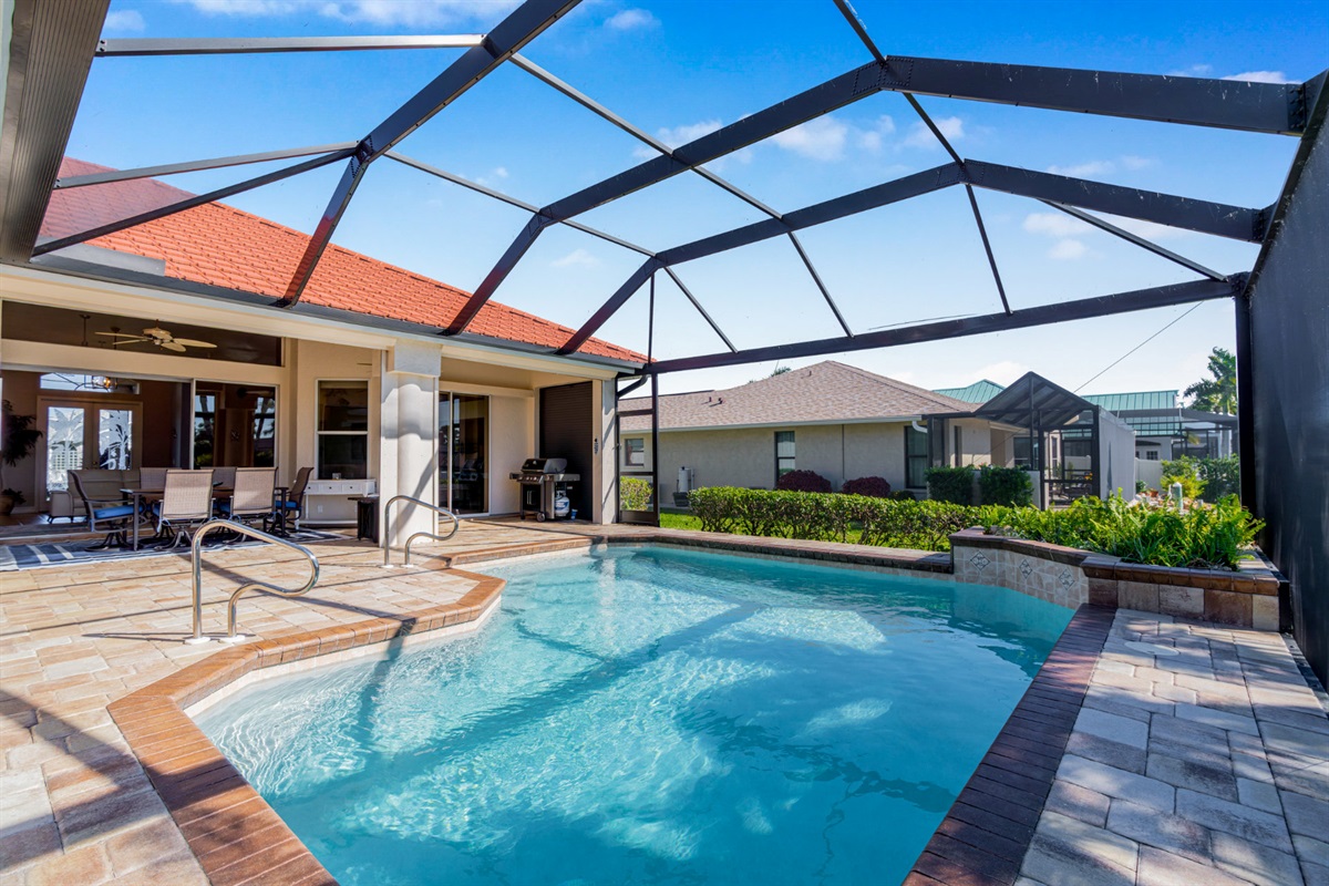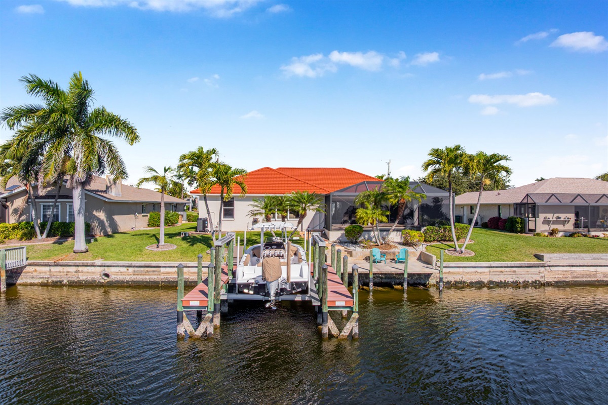 Step outside and discover your private paradise. The screened pool invites endless fun for kids and peaceful lounging for adults. The spacious outdoor seating area is perfect for sharing meals, watching boats pass by the canal, or enjoying the vibrant Florida sunsets. With direct water access and a private boat lift, you can set off for a day on the water whenever the mood strikes.