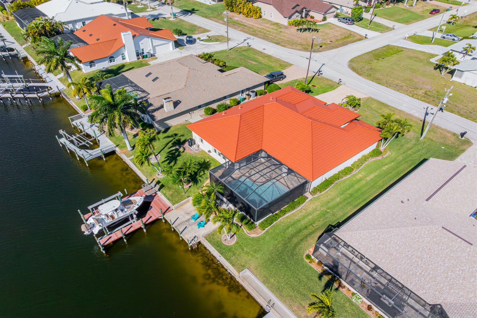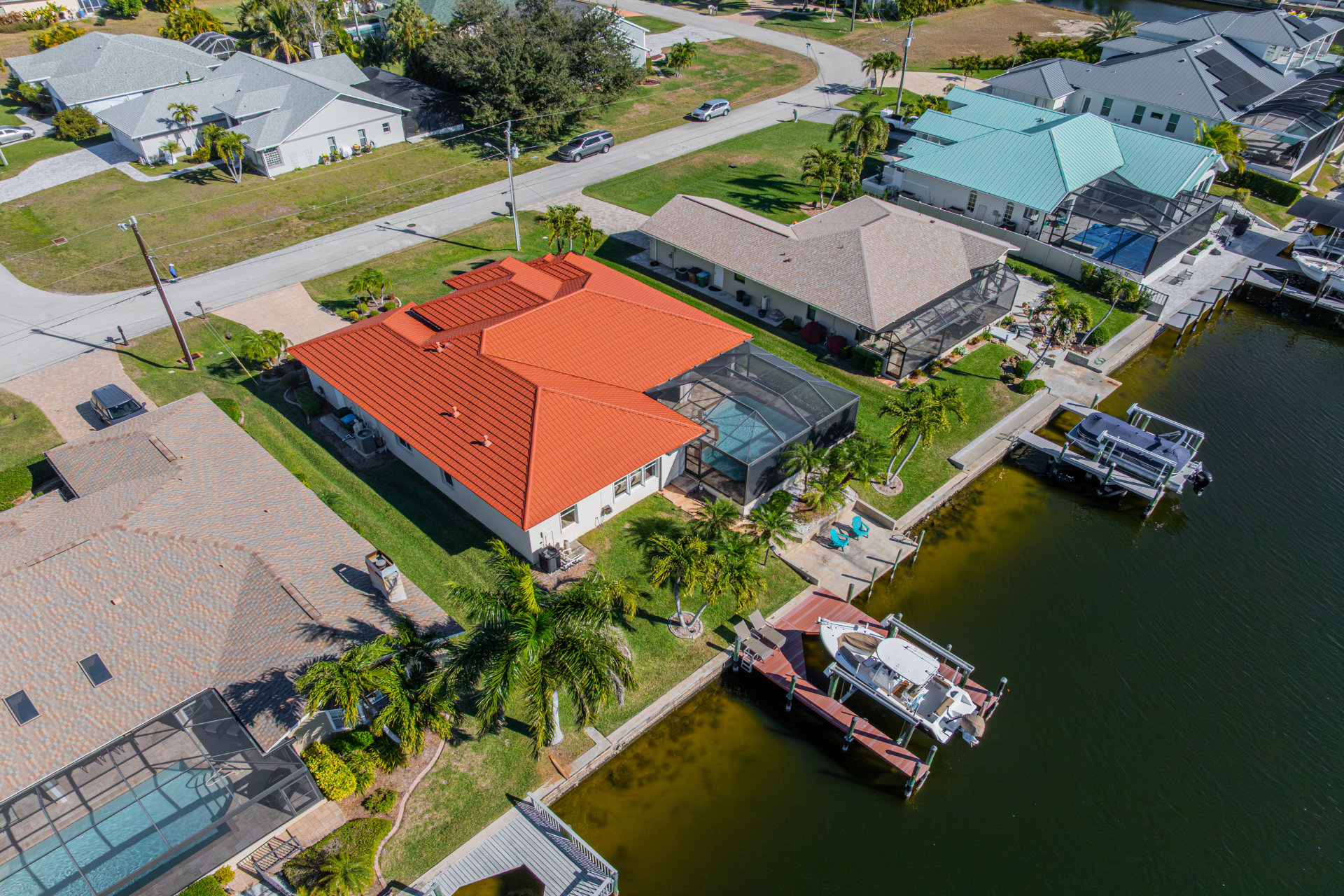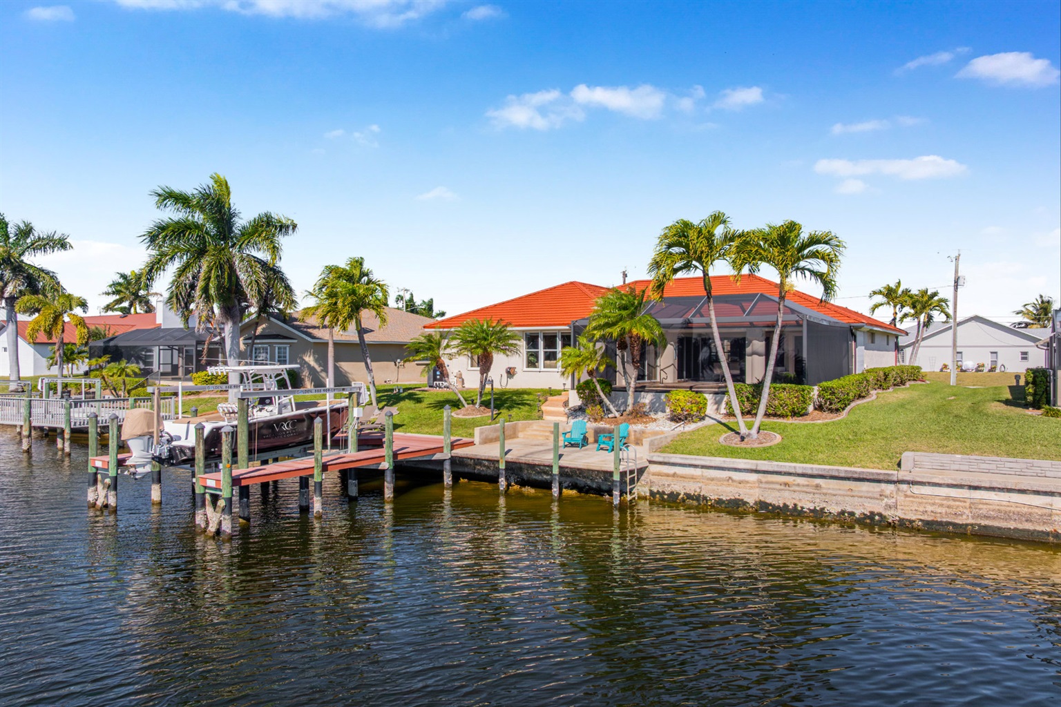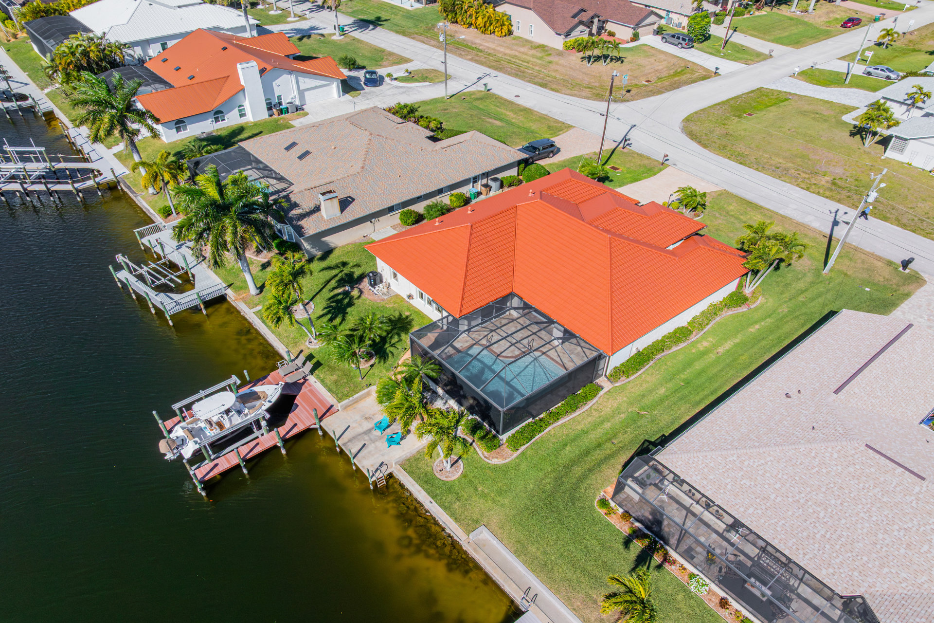 Step outside and discover your private paradise. The screened pool invites endless fun for kids and peaceful lounging for adults. The spacious outdoor seating area is perfect for sharing meals, watching boats pass by the canal, or enjoying the vibrant Florida sunsets. With direct water access and a private boat lift, you can set off for a day on the water whenever the mood strikes.