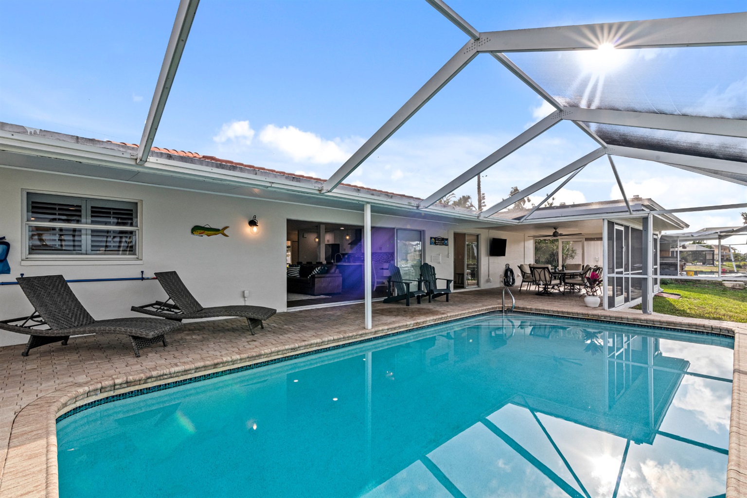 Outdoor living: Refreshing family sized pool, covered lanai and pool deck, lounge chairs, dining table for six, outdoor smart tv, propane grill, dock with boat lift and relaxing waterfront views.
