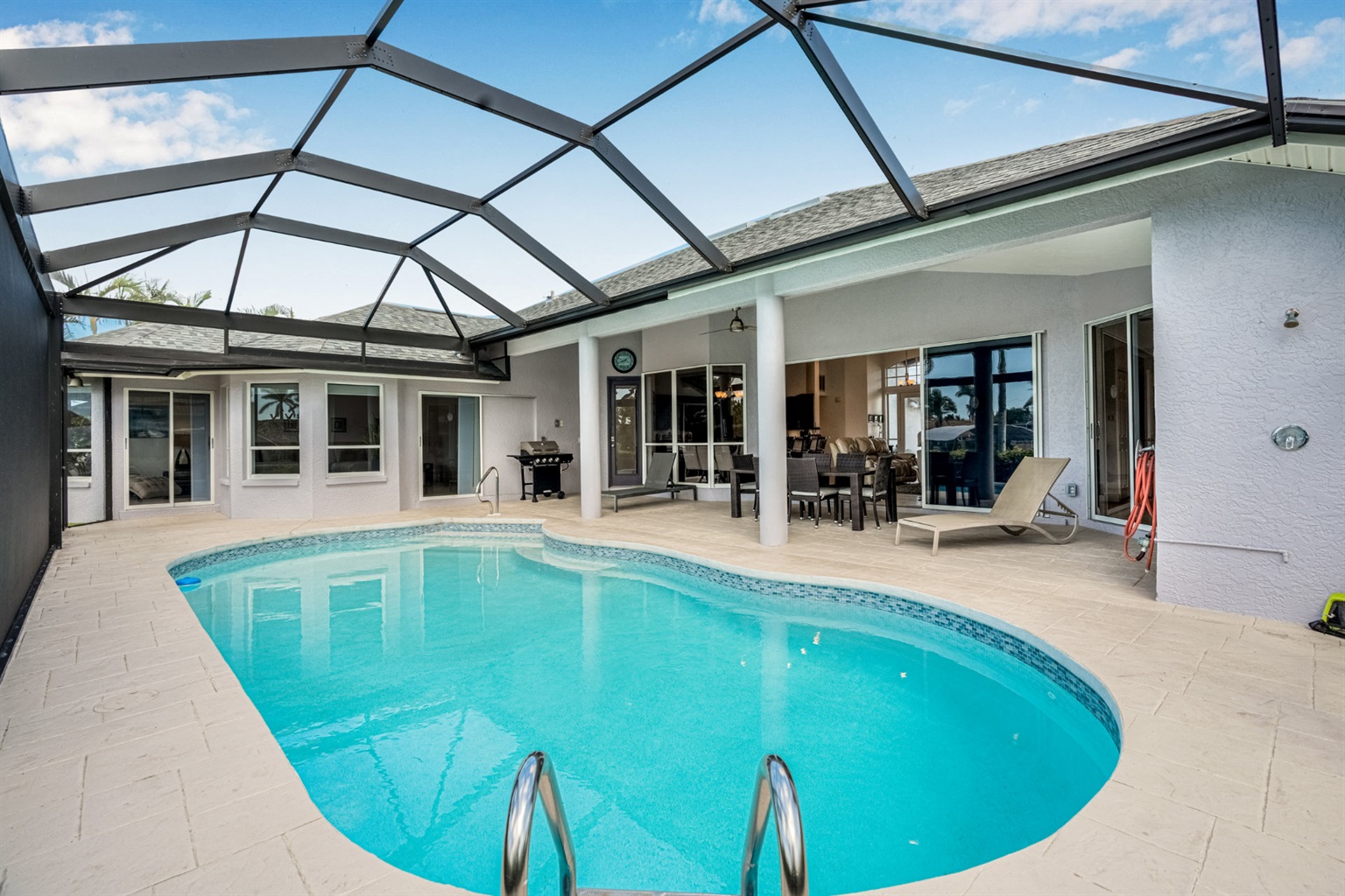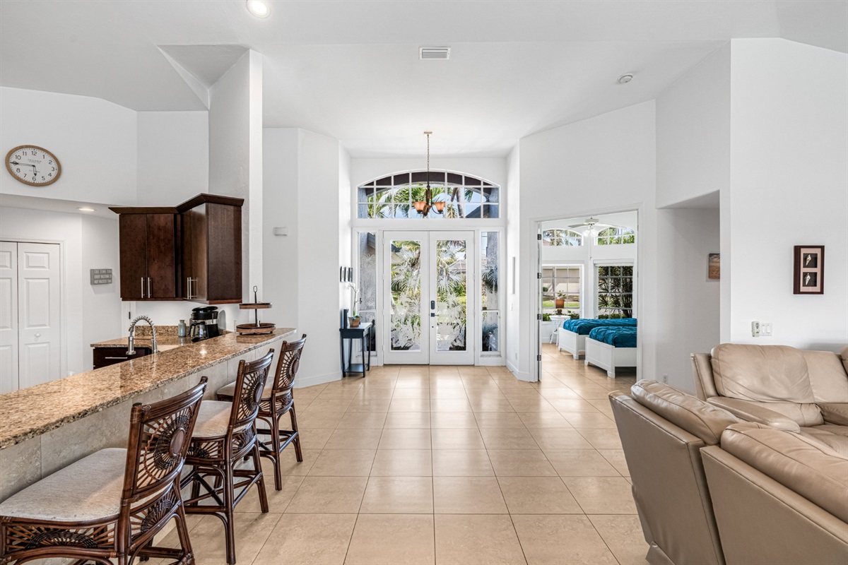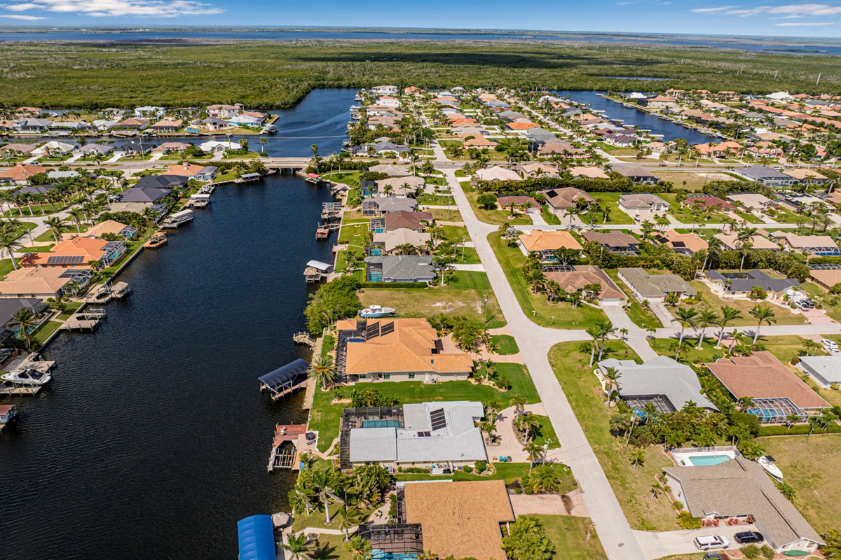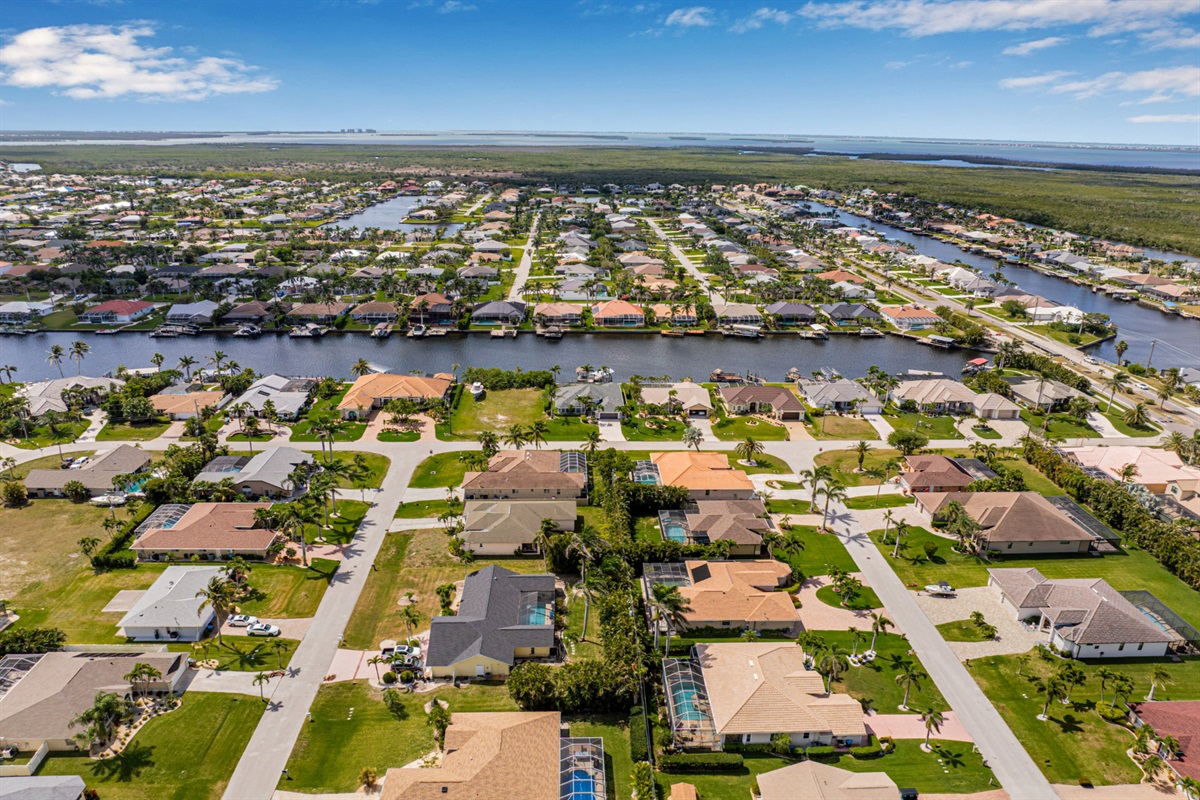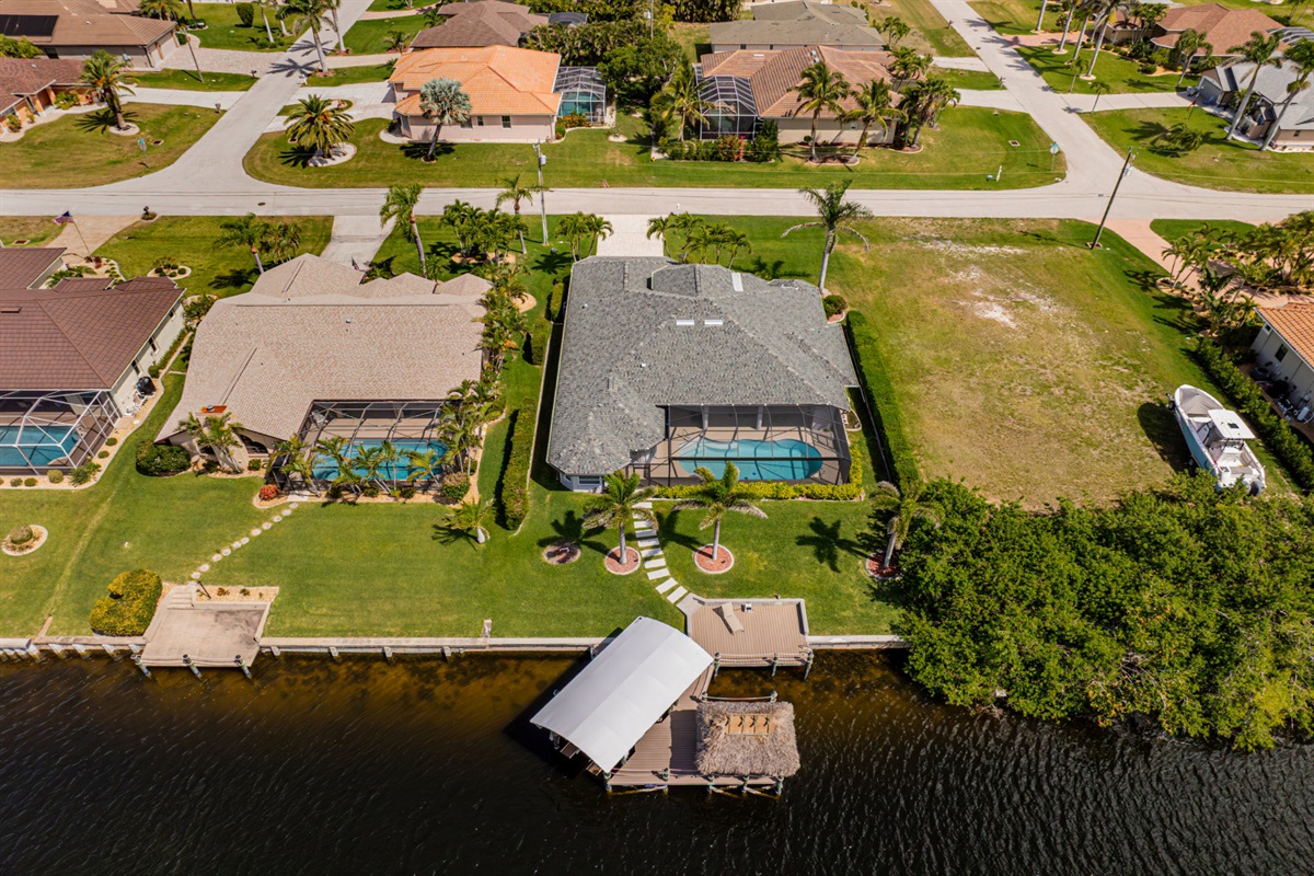 4 Bedrooms • 3 Bathrooms (2 full, 1 half) 3 Baths (2 full, 1 half) • Sleeps 6-8Villa Mango is located in Cape Coral's southwestern location, very quiet and away from other major streets. The southern exposure allows you to enjoy beautiful sunsets in the evenings and sunshine all day on the pool deck. The adjoining canal has the maximum width in Cape Coral. Privacy to the neighbors is given not only on land side by the beautifully landscaped garden, but by the wide channel also water side.