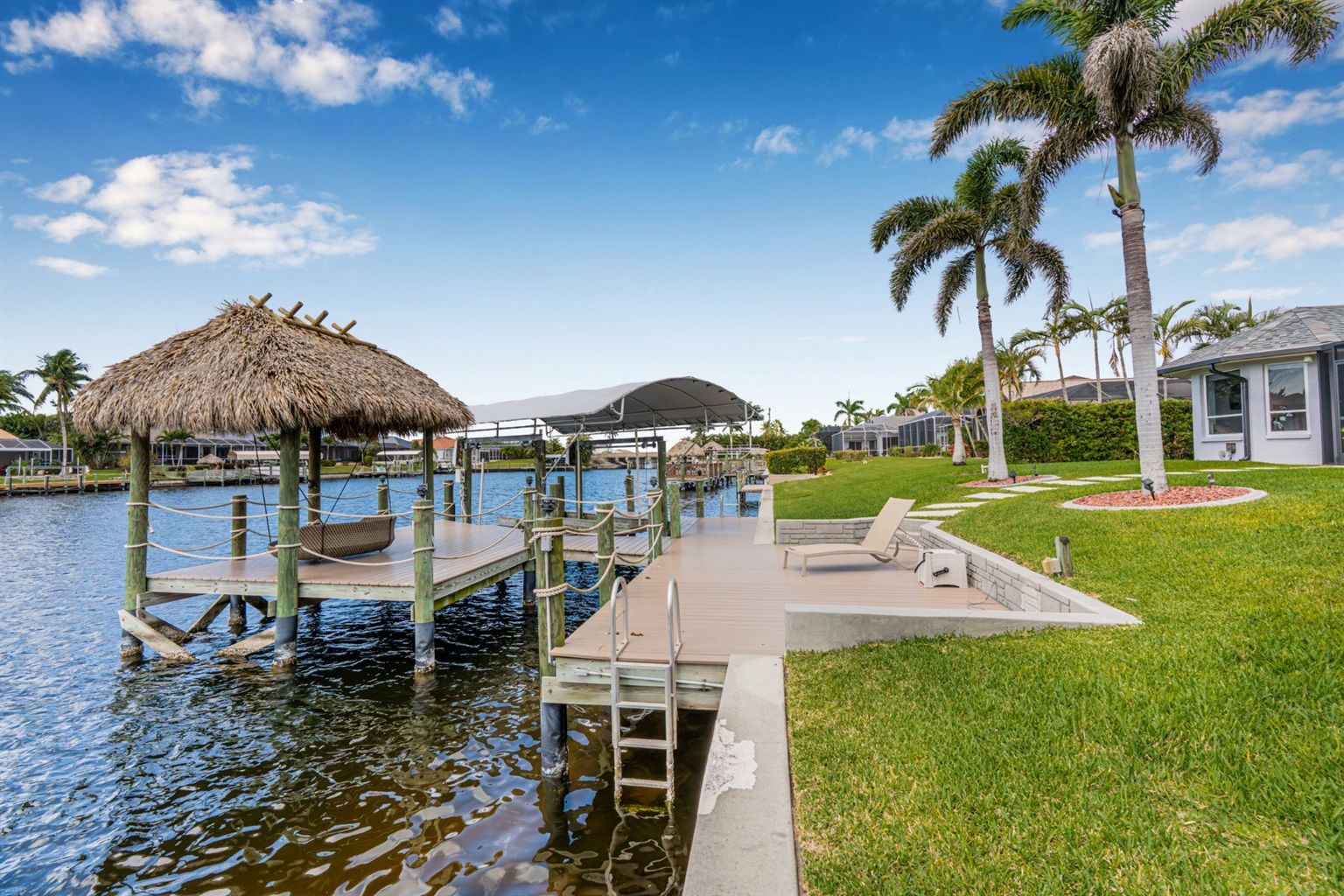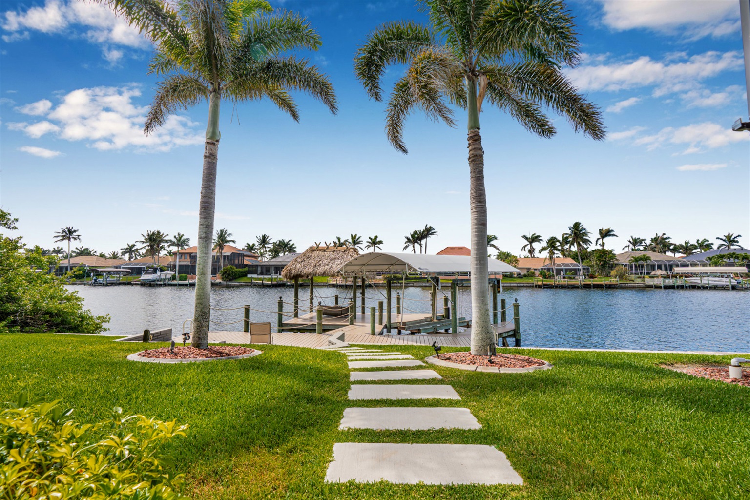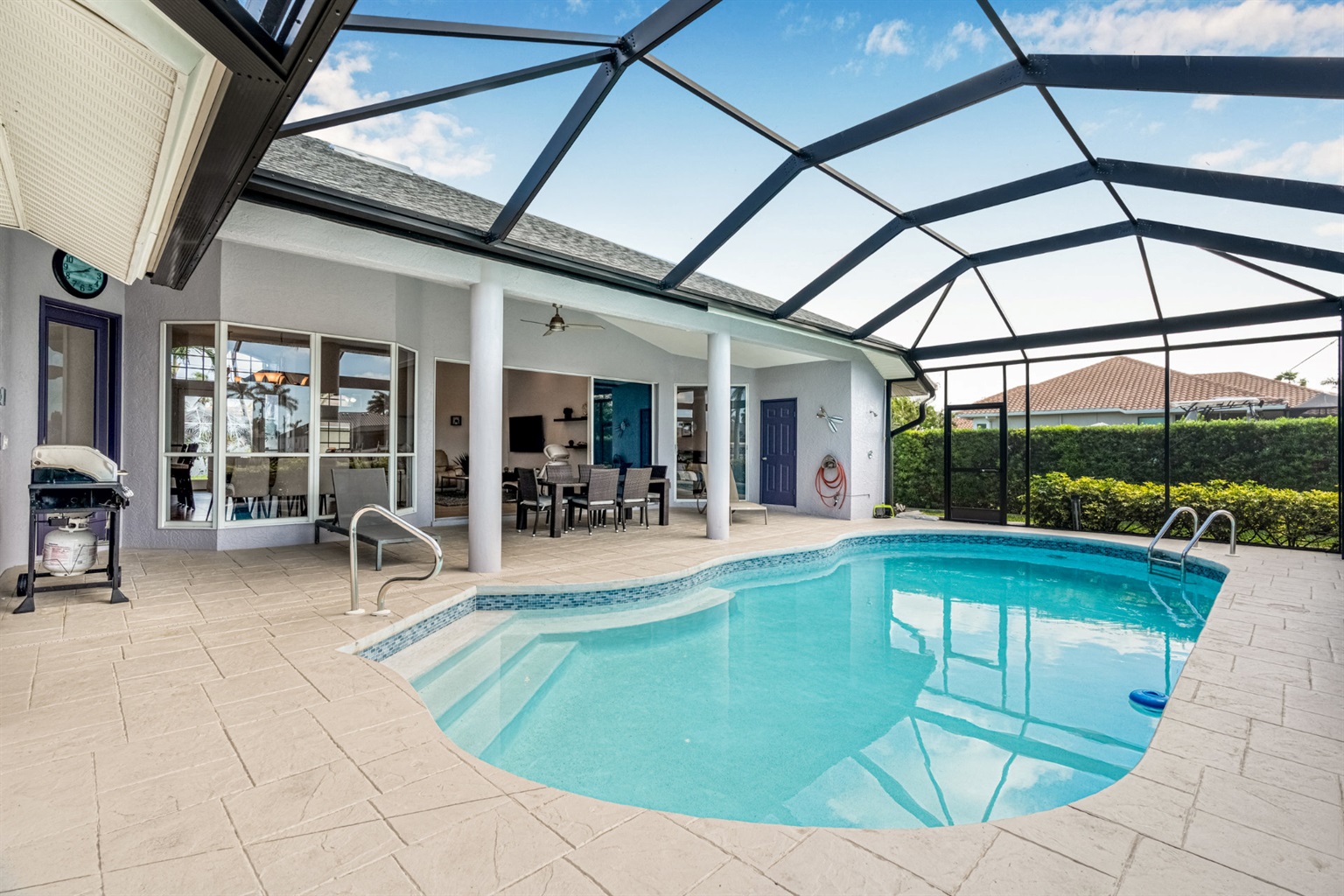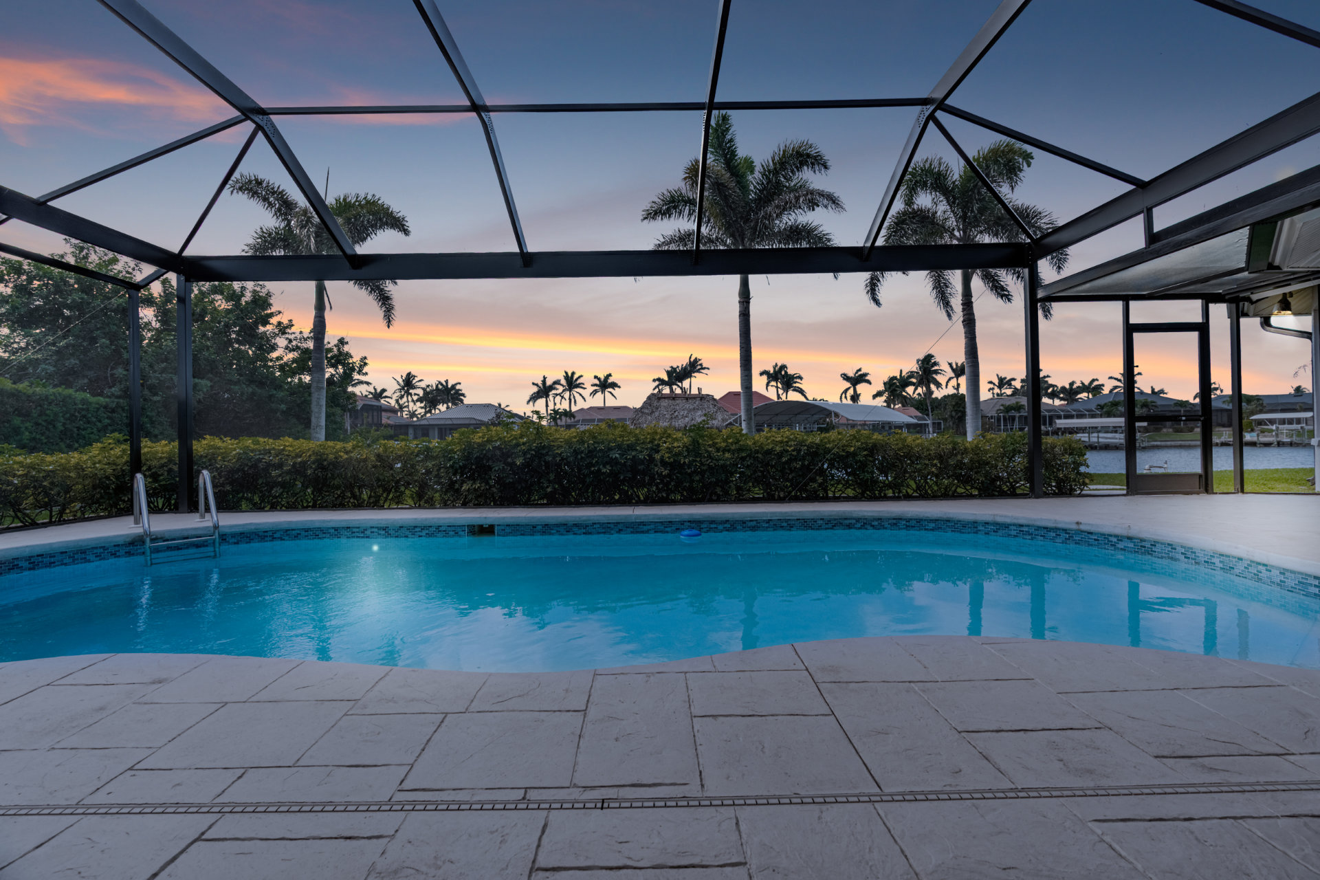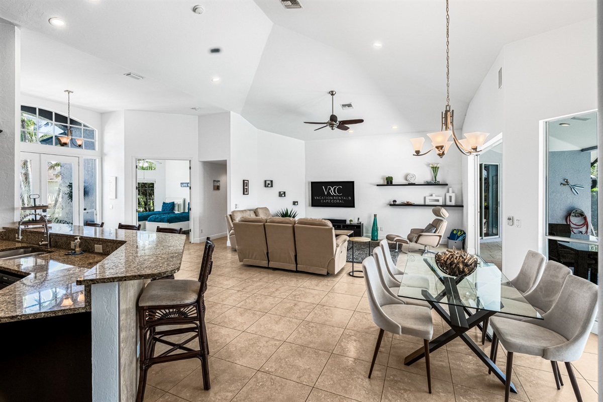 4 Bedrooms • 3 Bathrooms (2 full, 1 half) 3 Baths (2 full, 1 half) • Sleeps 6-8Villa Mango is located in Cape Coral's southwestern location, very quiet and away from other major streets. The southern exposure allows you to enjoy beautiful sunsets in the evenings and sunshine all day on the pool deck. The adjoining canal has the maximum width in Cape Coral. Privacy to the neighbors is given not only on land side by the beautifully landscaped garden, but by the wide channel also water side.