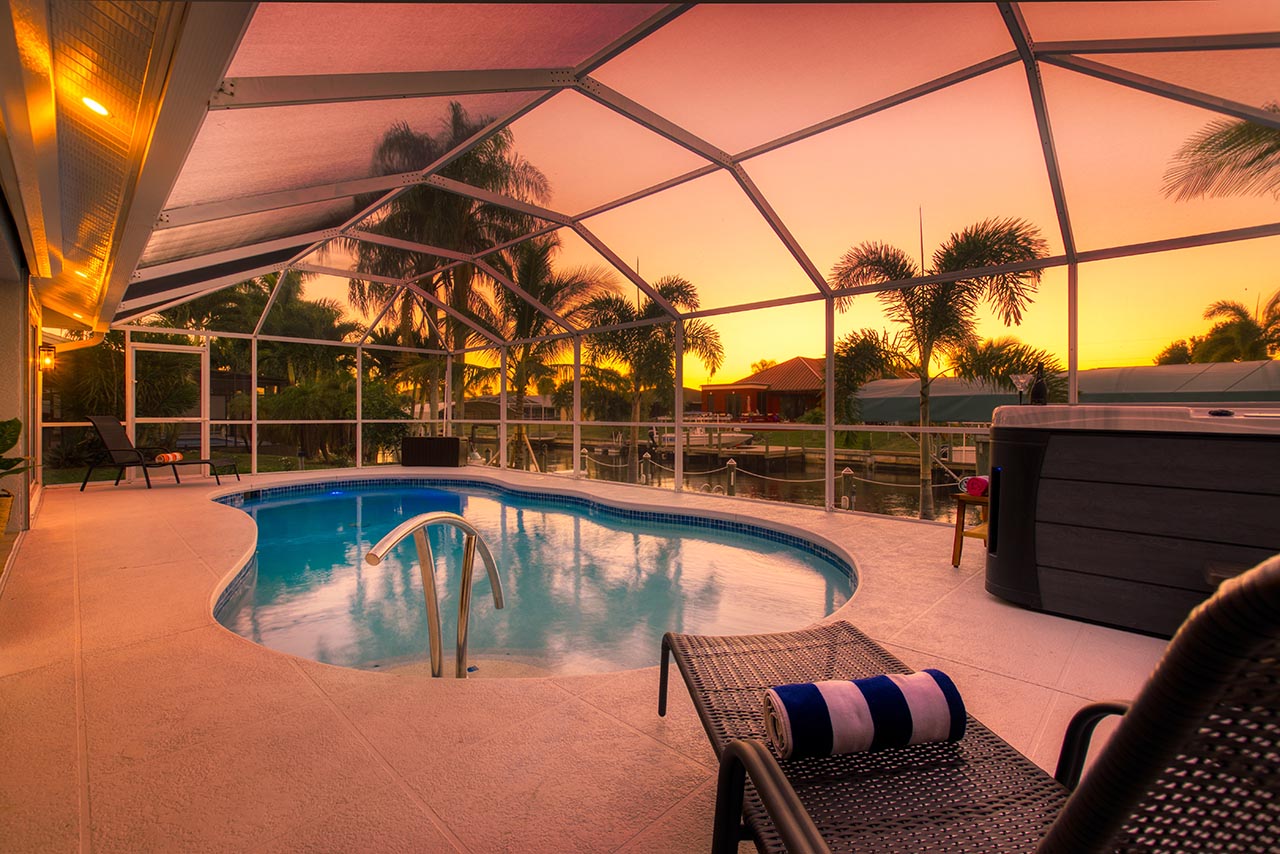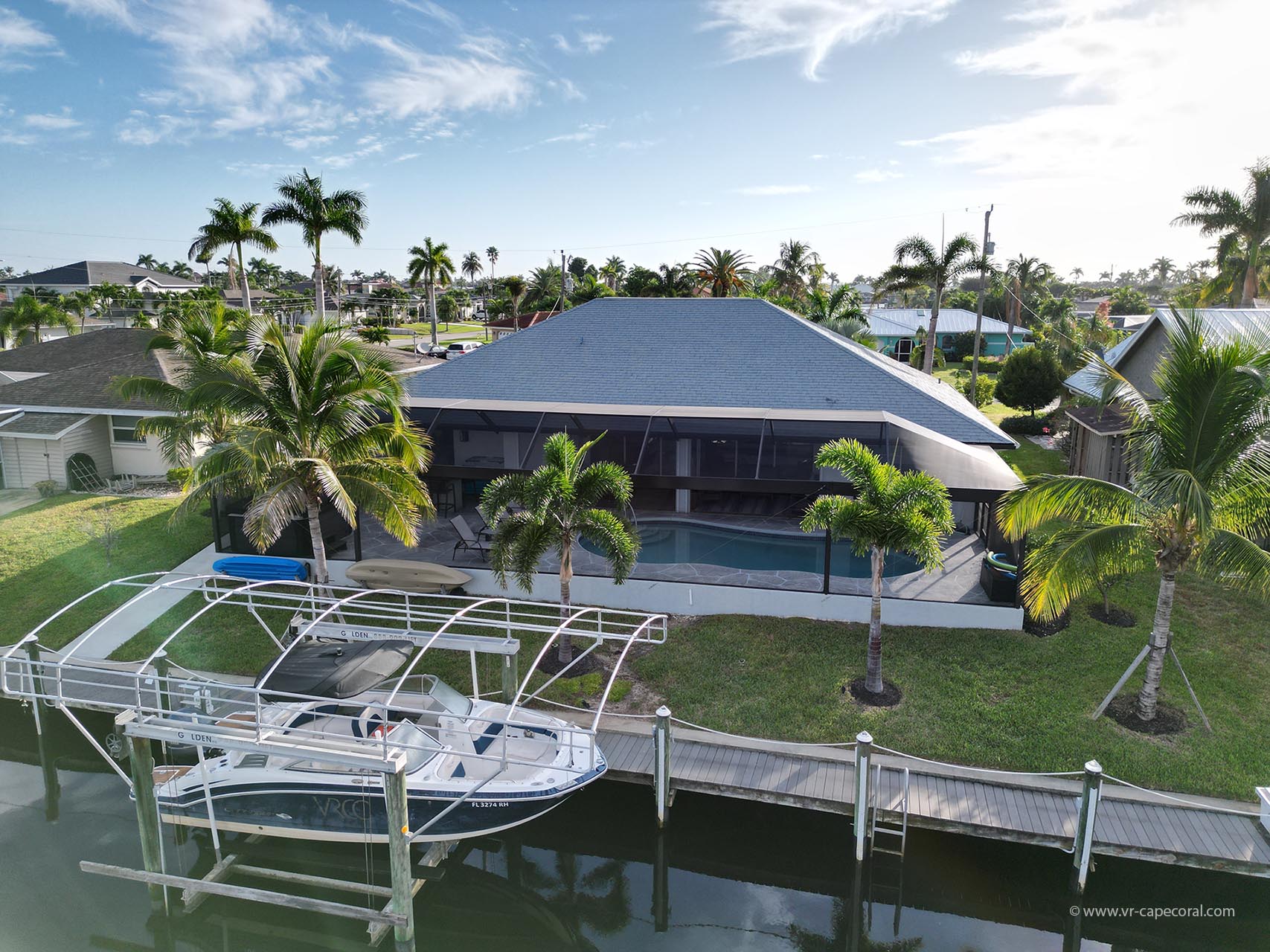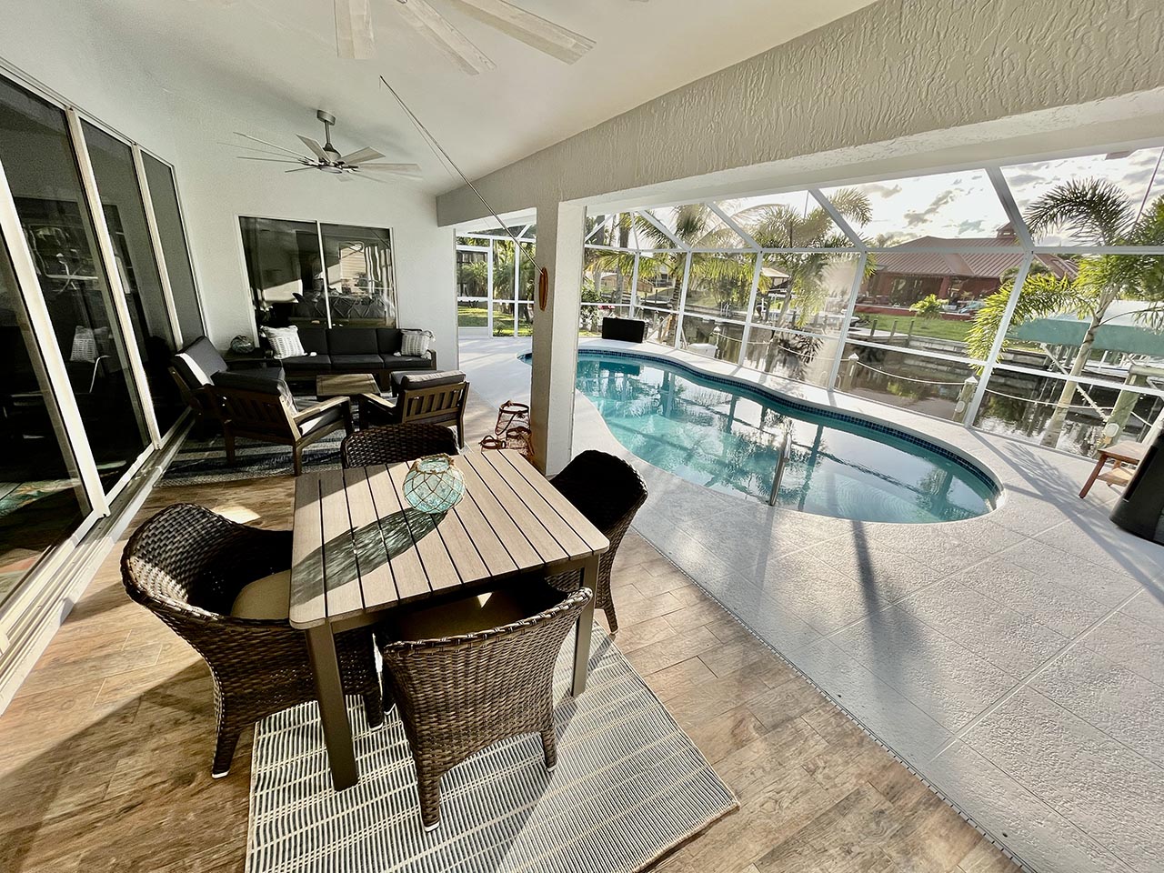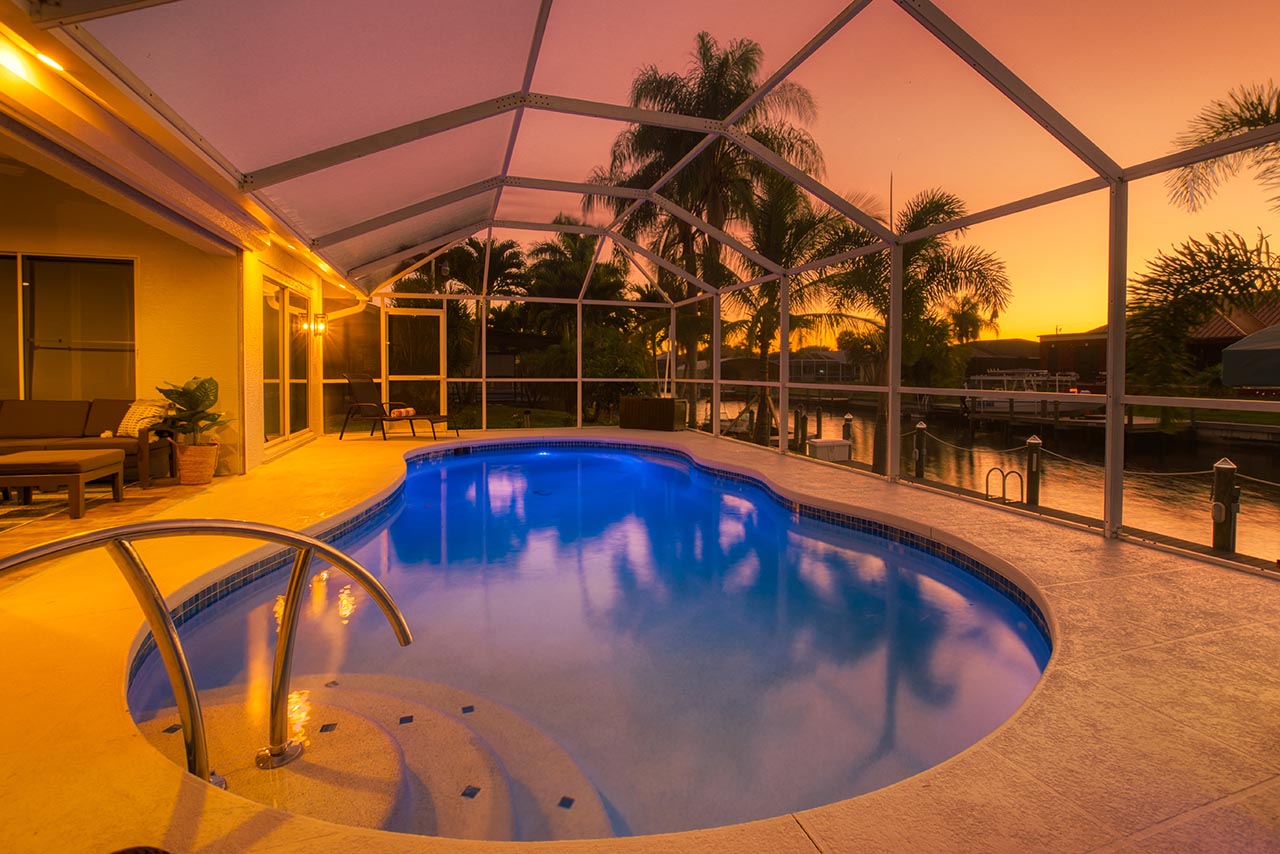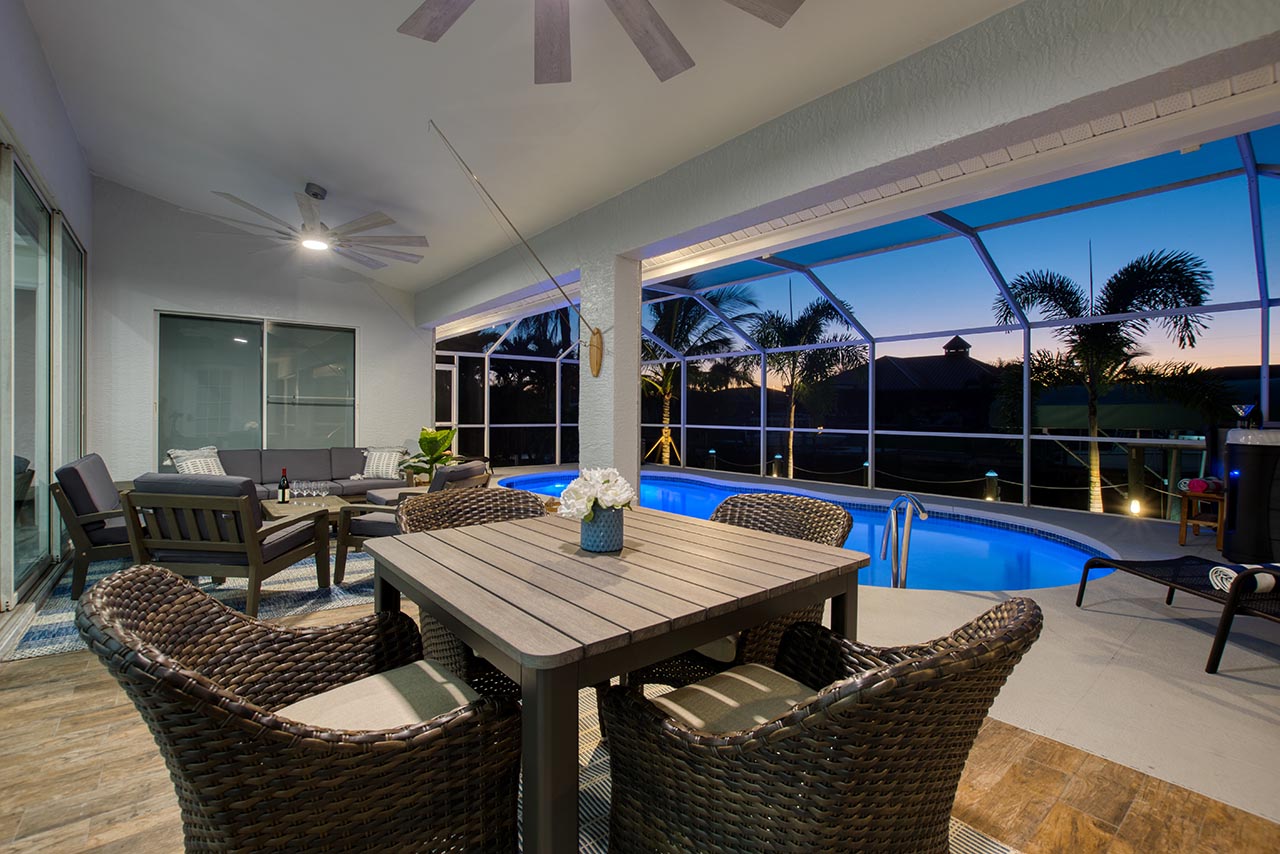 Villa Mosa is located in Cape Coral's most desired Yacht Club location and was remodelled from the scratch until 2022. The villa is located in a quiet neighbourhood and away from other major streets. The western exposure allows you to enjoy beautiful sunsets in the evenings and sunshine all day on the pool deck. The adjoining canal has the maximum width in Cape Coral and on top of that you can enjoy the sunsets from the beginning of this intersection. Privacy to the neighbours is given not only on land side by the beautifully landscaped garden, but by the wide channel also water side. Very often you also can see dolphins and manatees right at the dock.