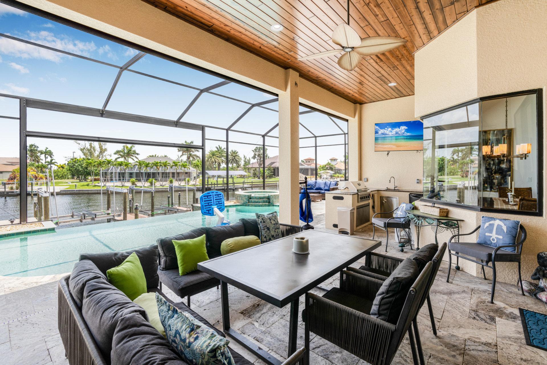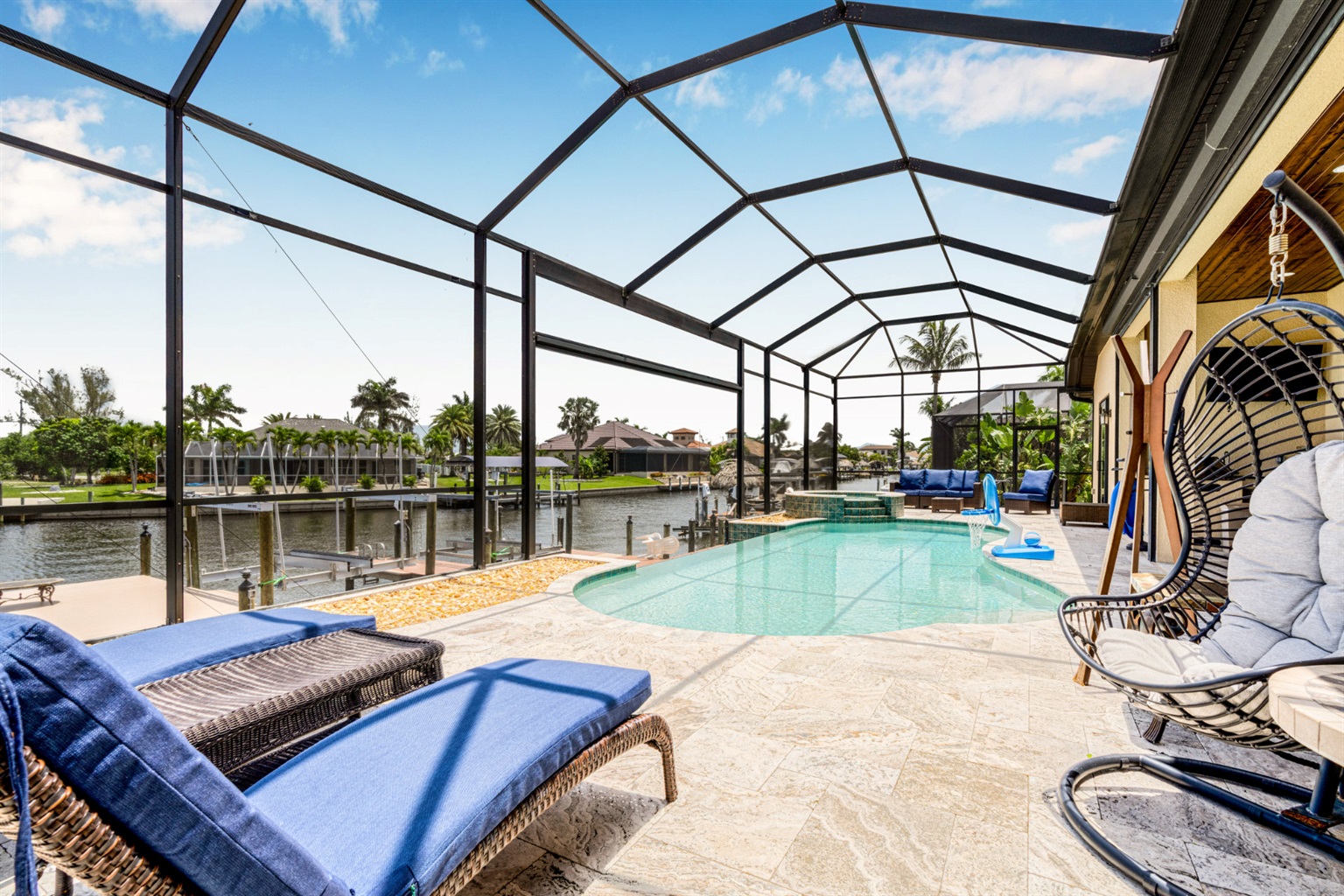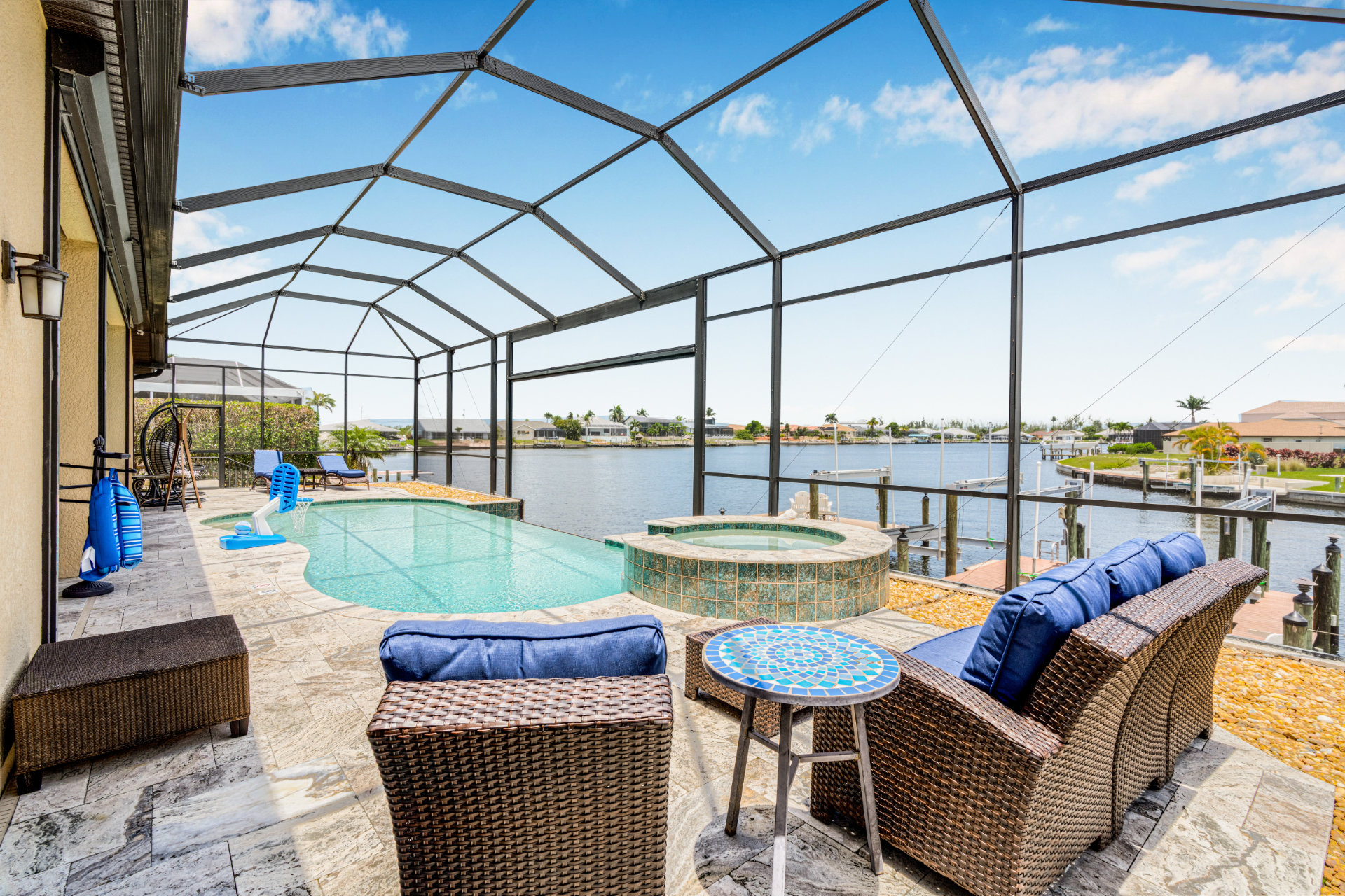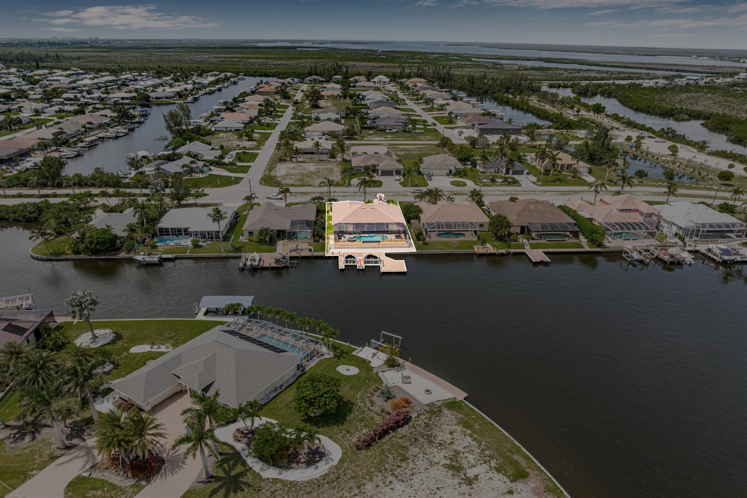 The villa's lanai offers a breathtaking view, ensuring plentiful sunshine for idyllic days of lounging by the pool or soaking in the spa. Bring your boat or rent one of ours to keep on your backyard dock. Enjoy world-class fishing or cruising on the sparkling gulf waters. Your perfect tropical vacation home awaits!