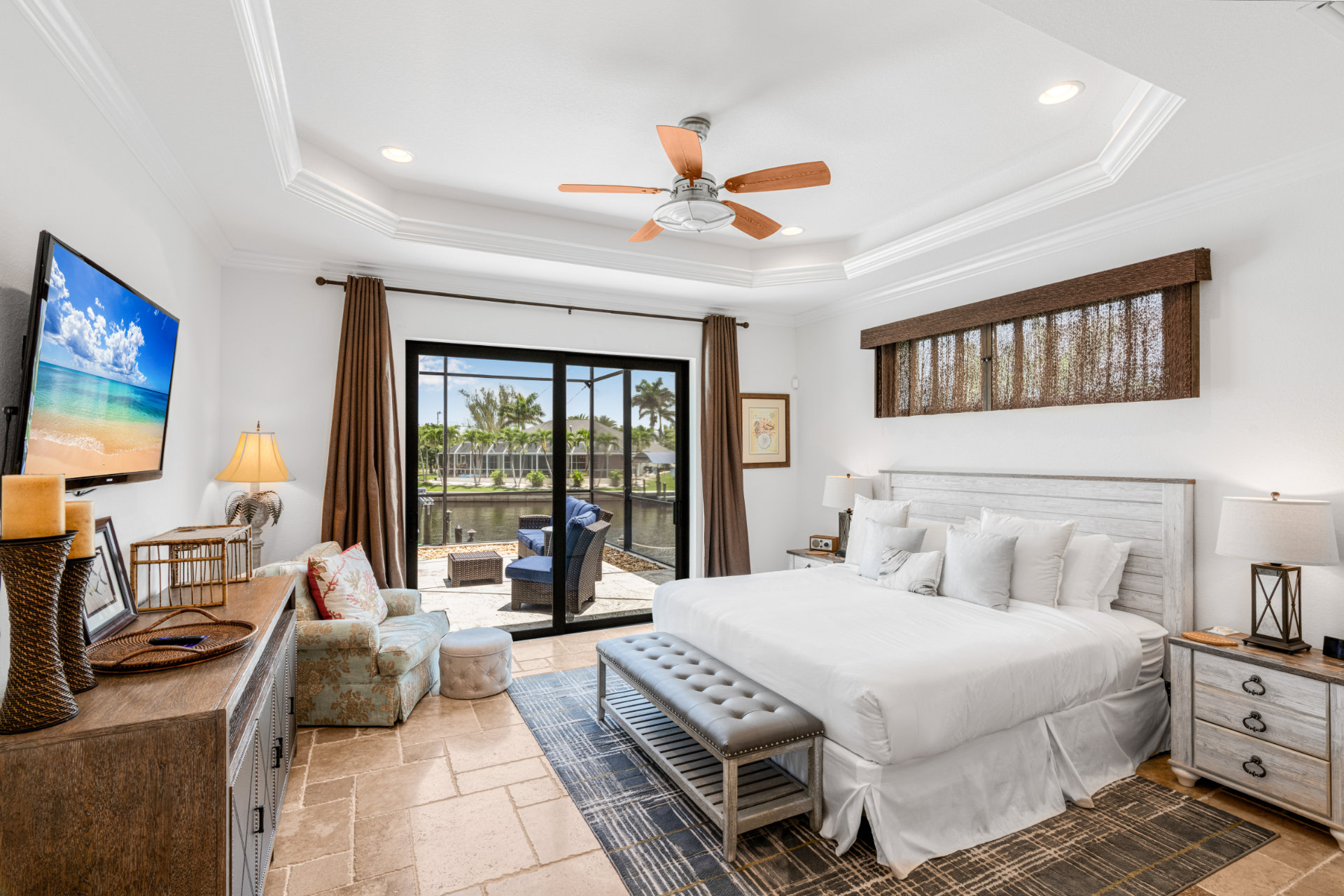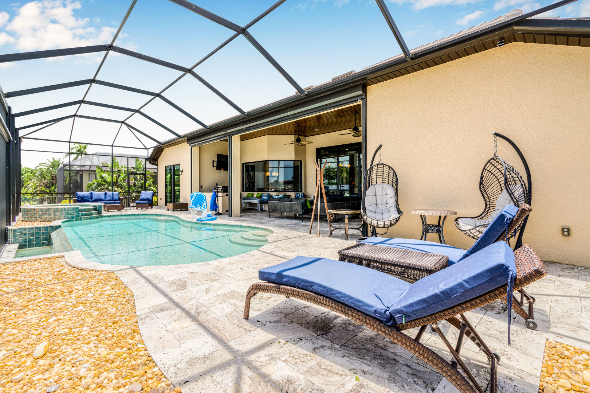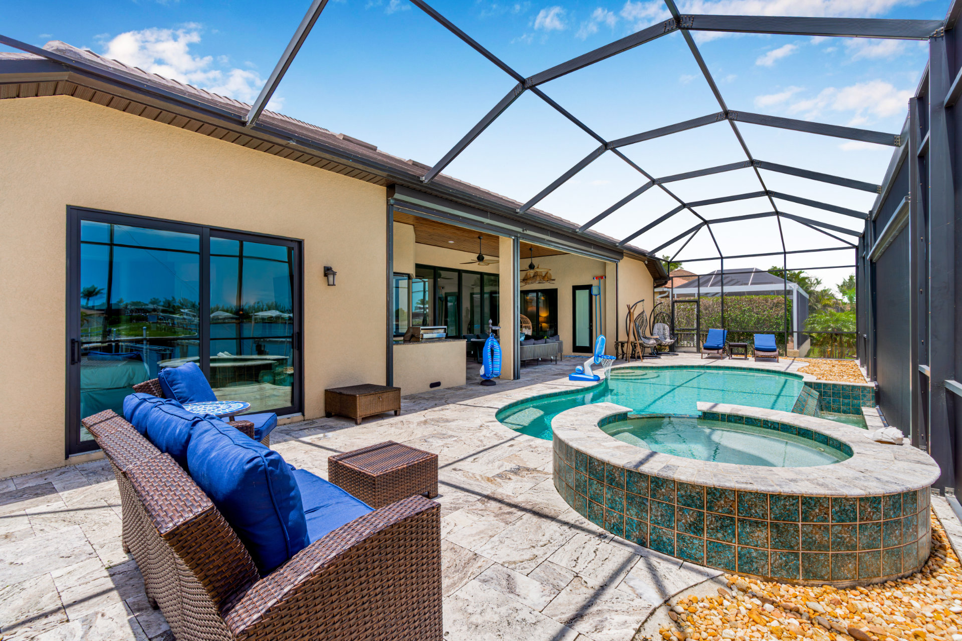 The villa's lanai offers a breathtaking view, ensuring plentiful sunshine for idyllic days of lounging by the pool or soaking in the spa. Bring your boat or rent one of ours to keep on your backyard dock. Enjoy world-class fishing or cruising on the sparkling gulf waters. Your perfect tropical vacation home awaits!