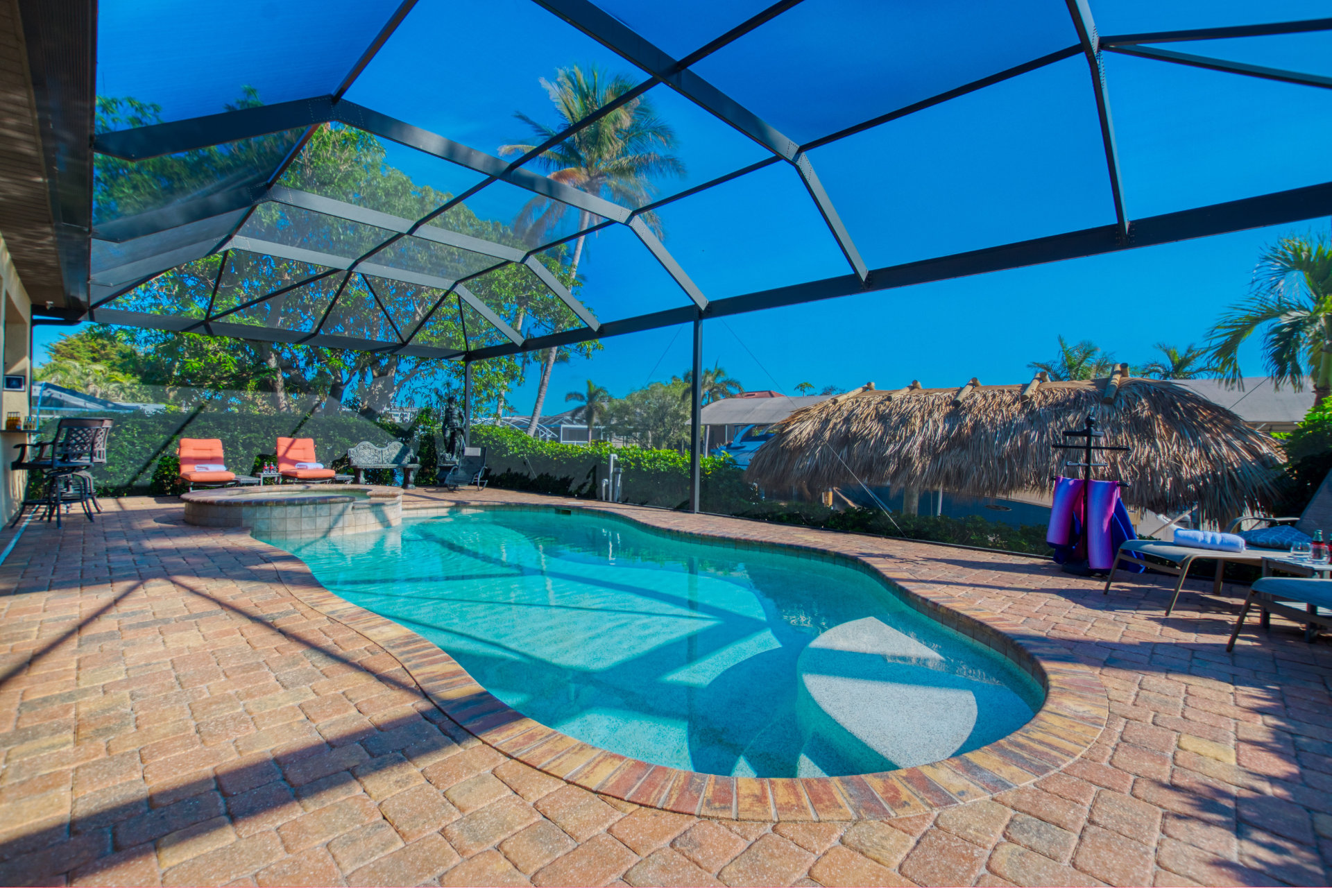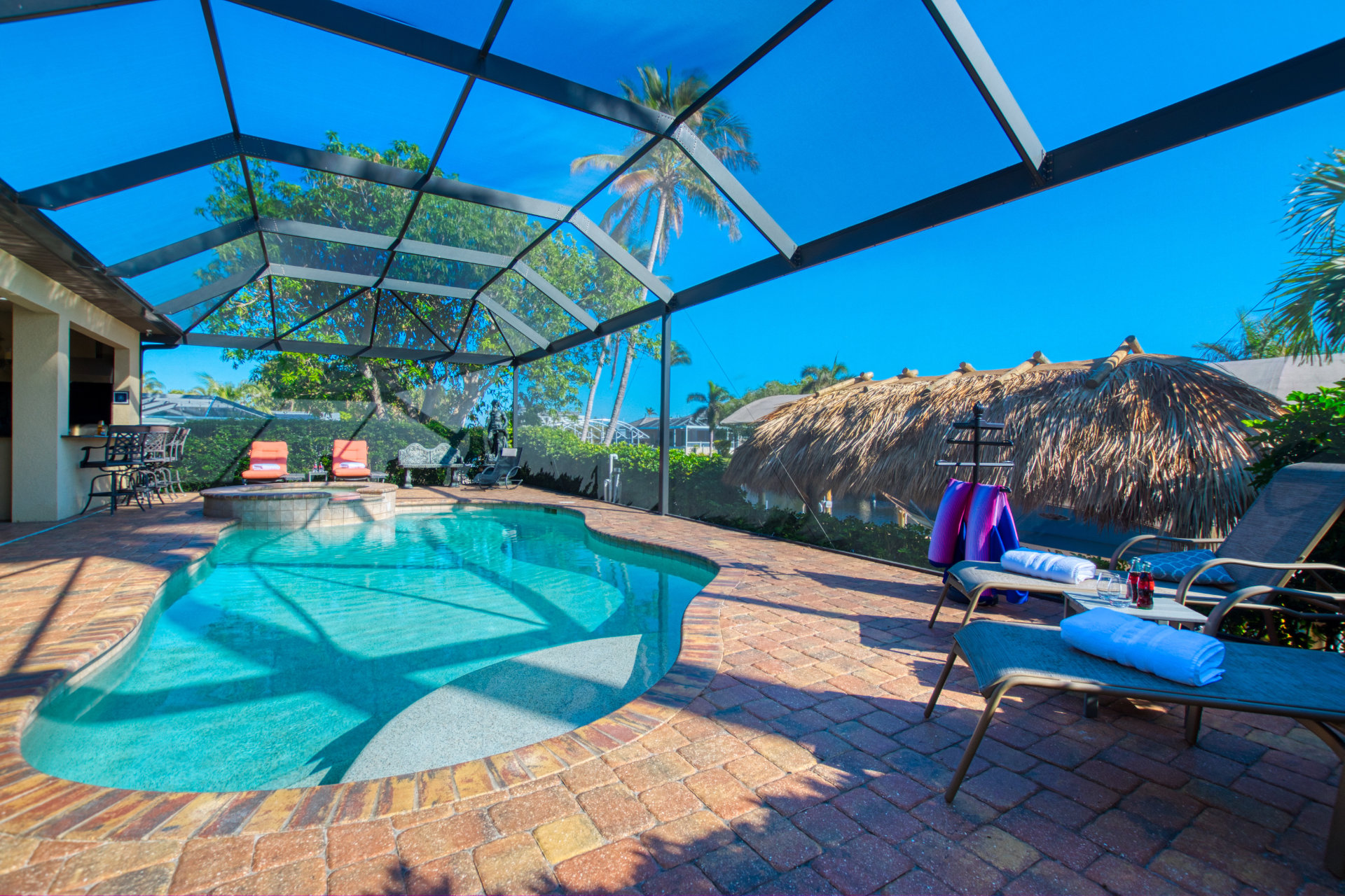 A heated saltwater pool, a private spa and a 22-foot hut-covered dock provide endless outdoor fun and relaxation.