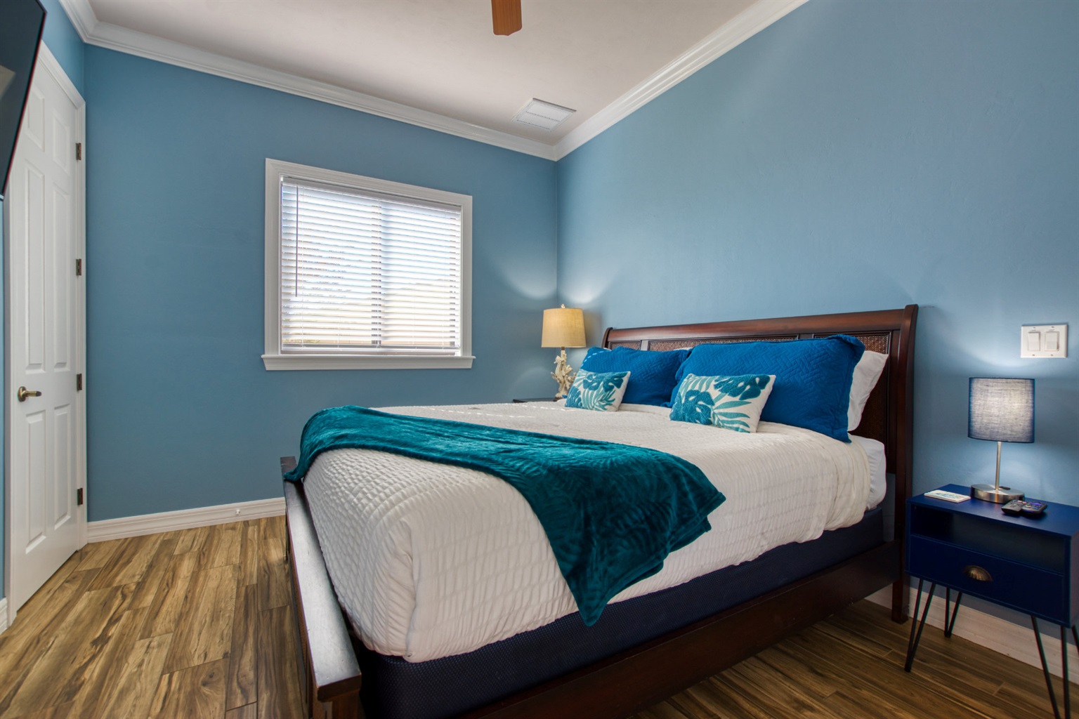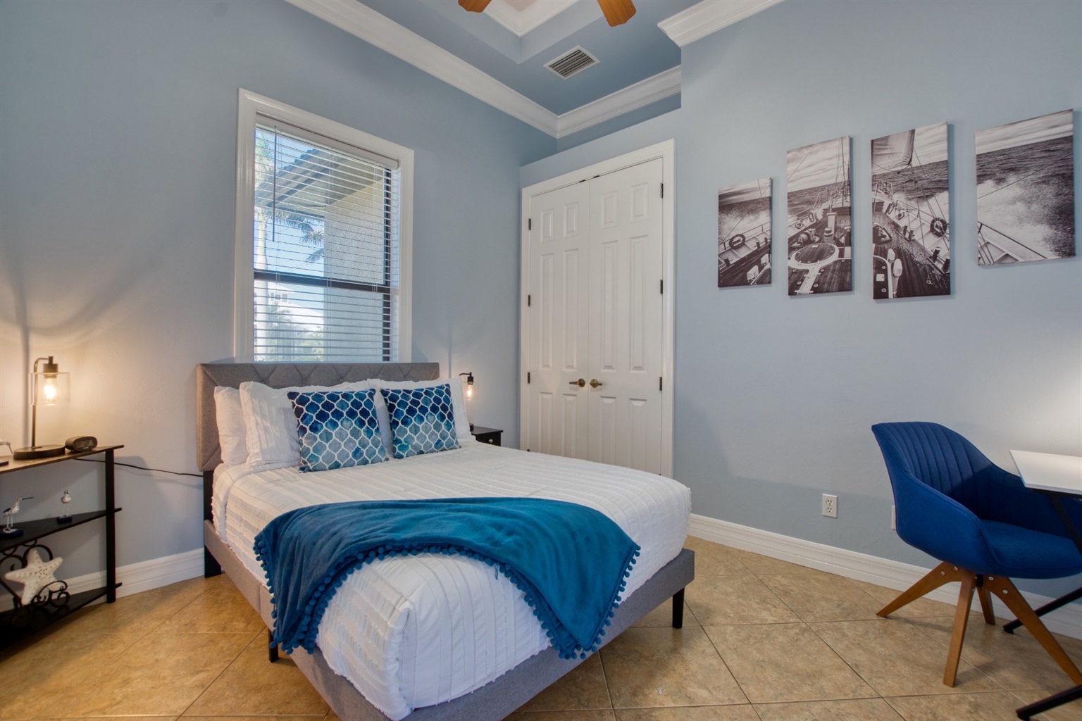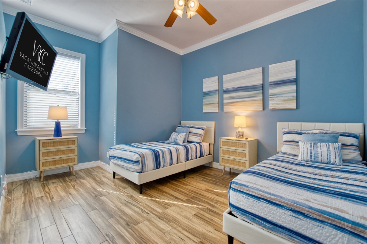 The fifth bedroom features two twin beds that can be reconfigured into a king-size bed if preferred.