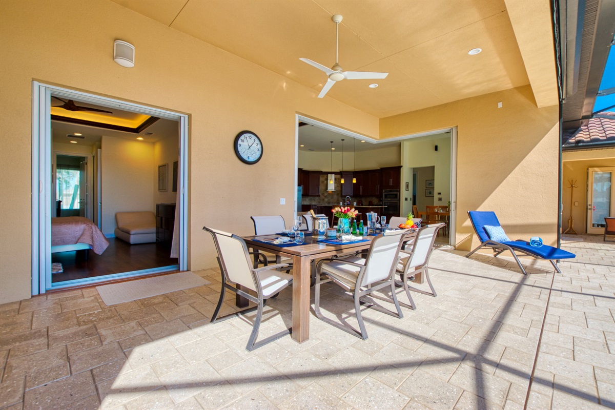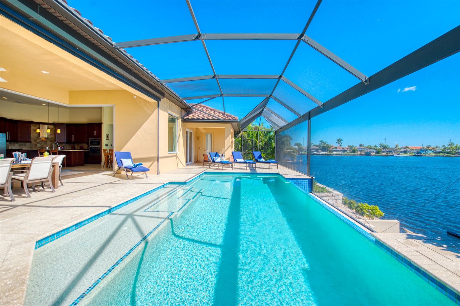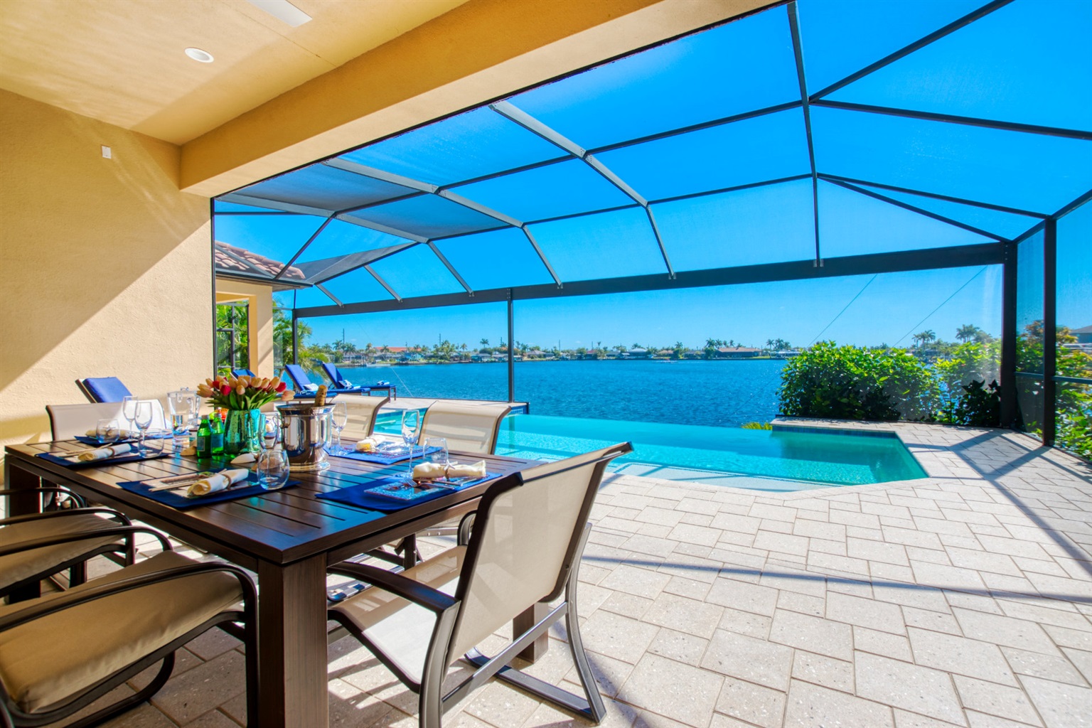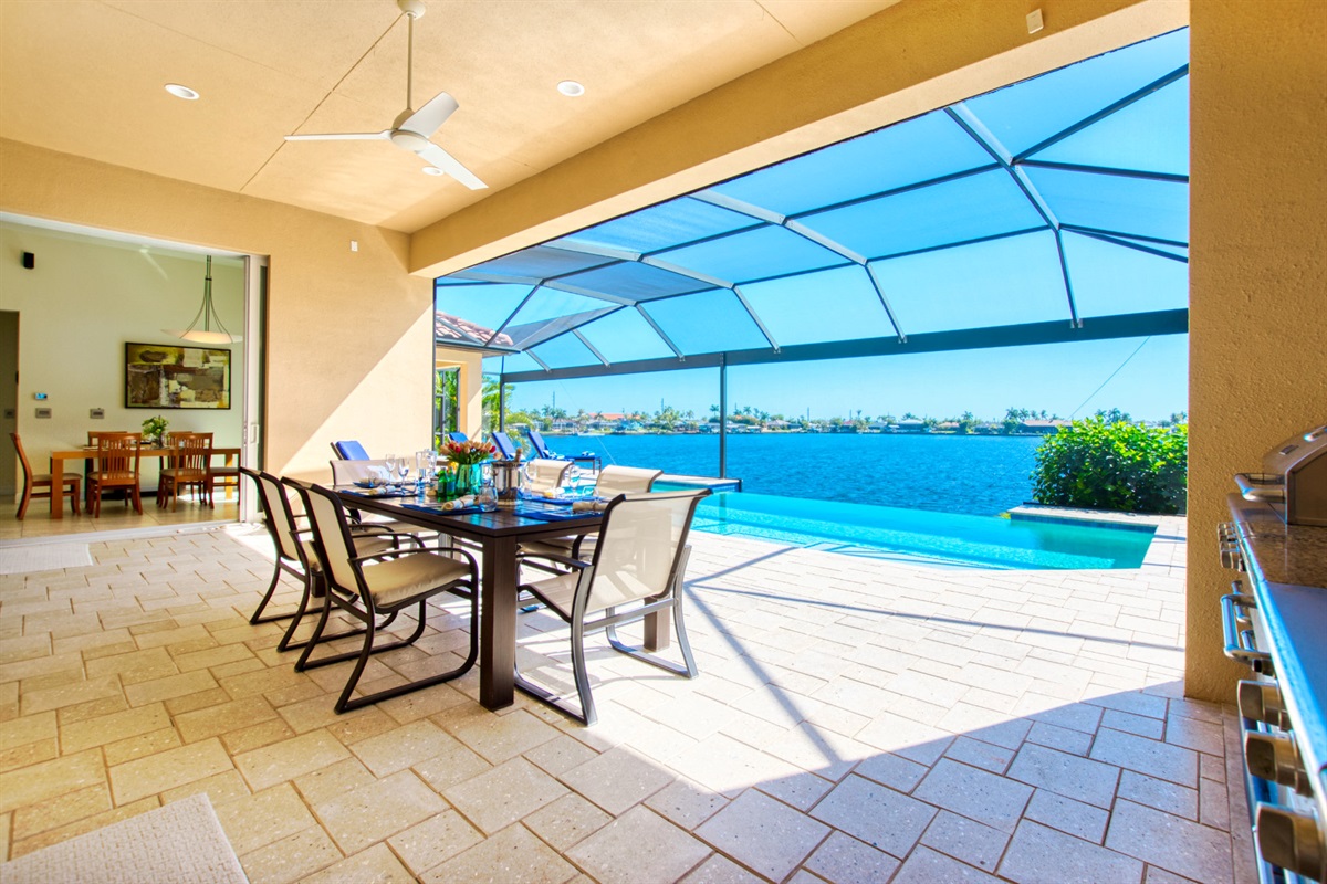 This newly built villa features a spacious outdoor dining area where you can enjoy your meals while enjoying the waterfront view.