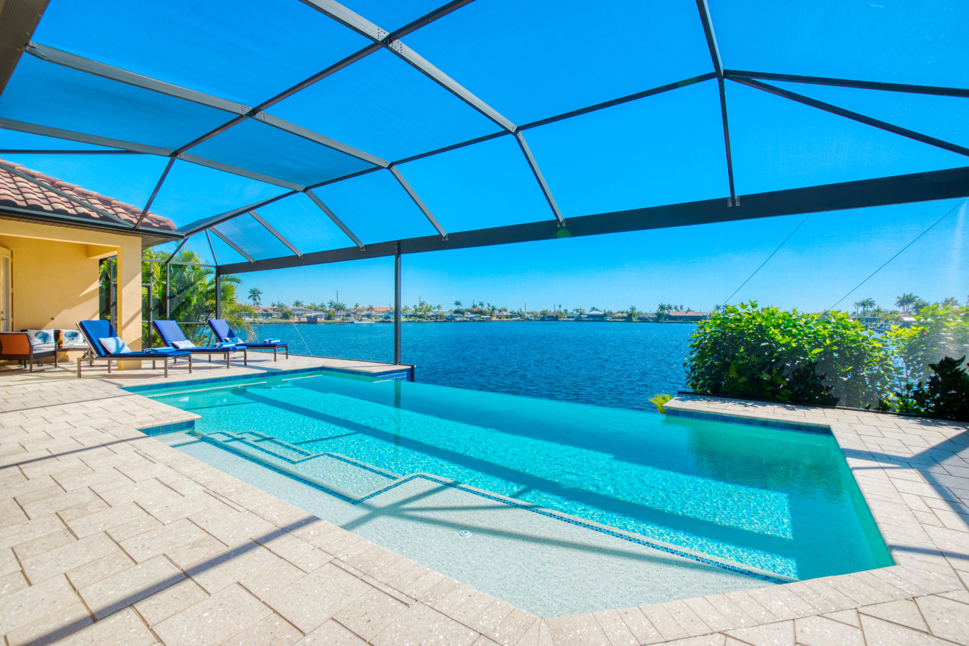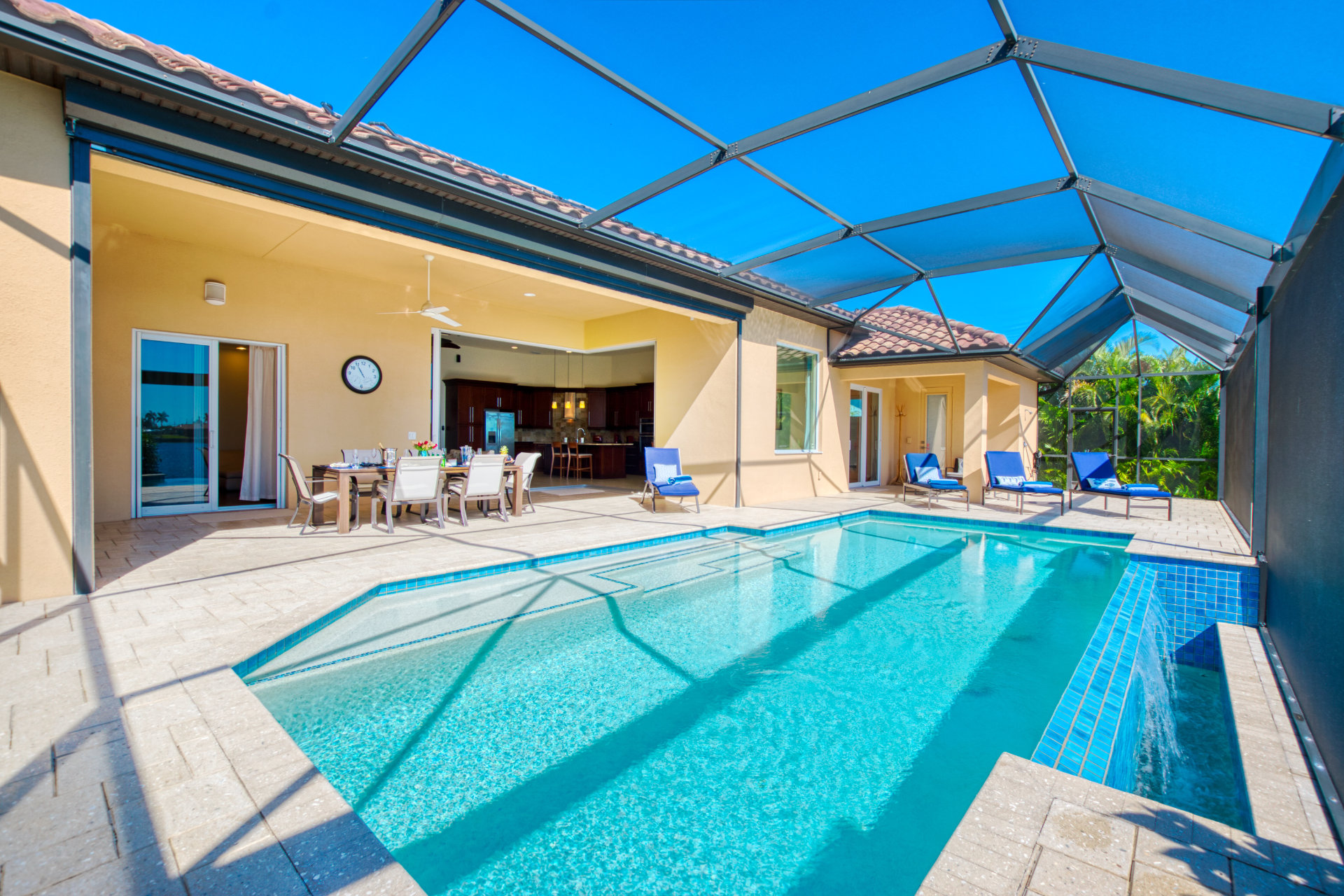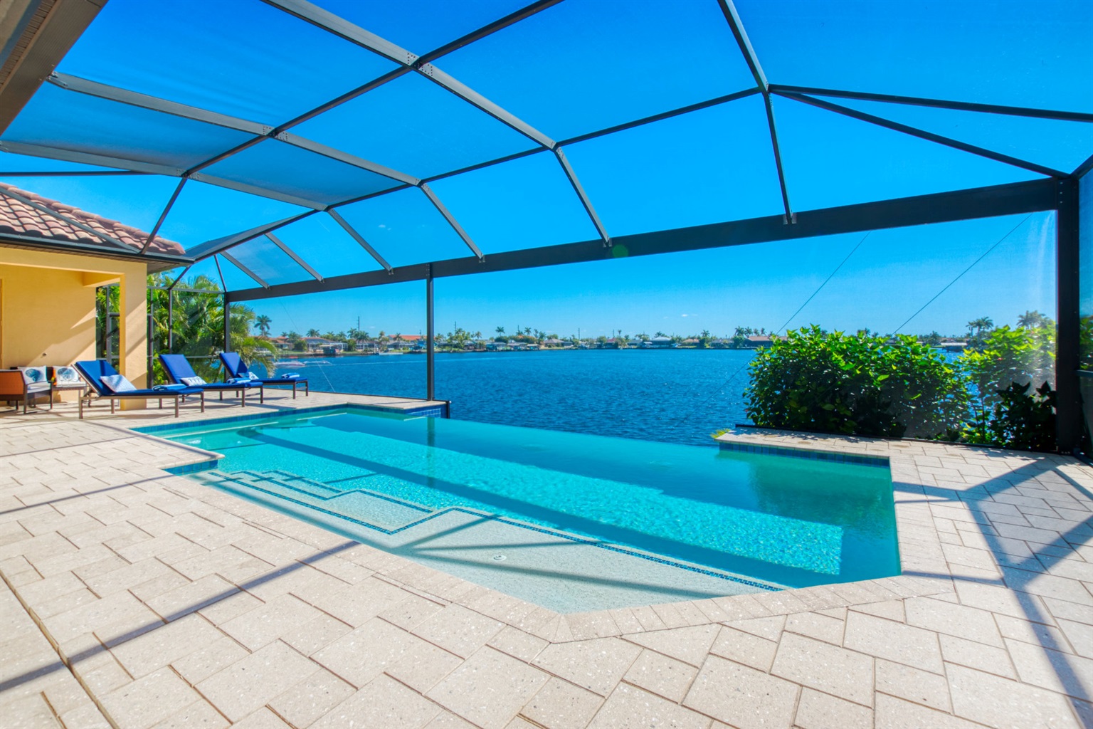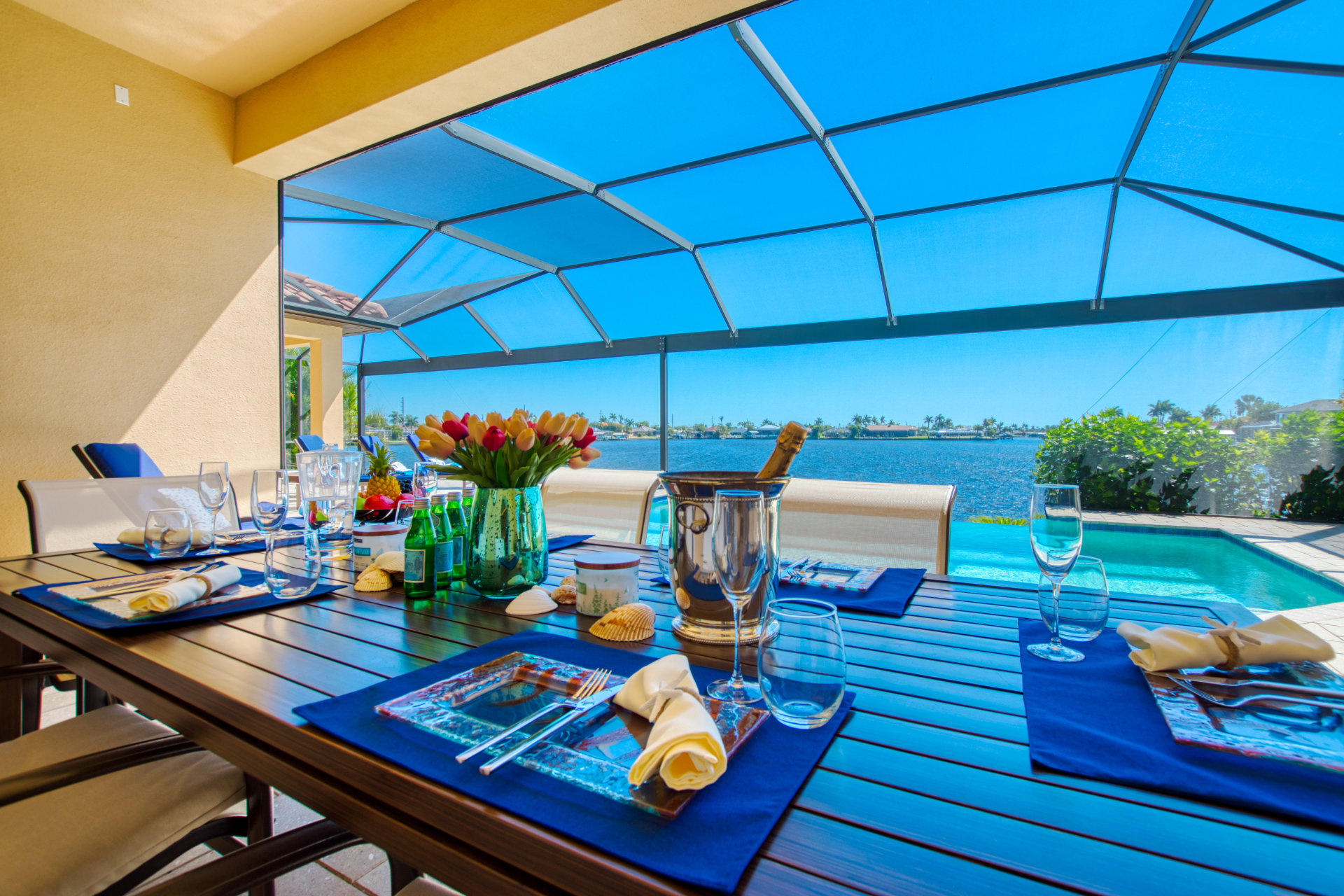 This newly built villa features a spacious outdoor dining area where you can enjoy your meals while enjoying the waterfront view.