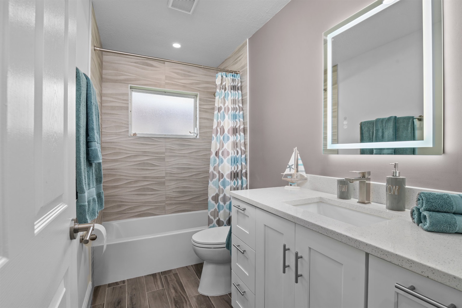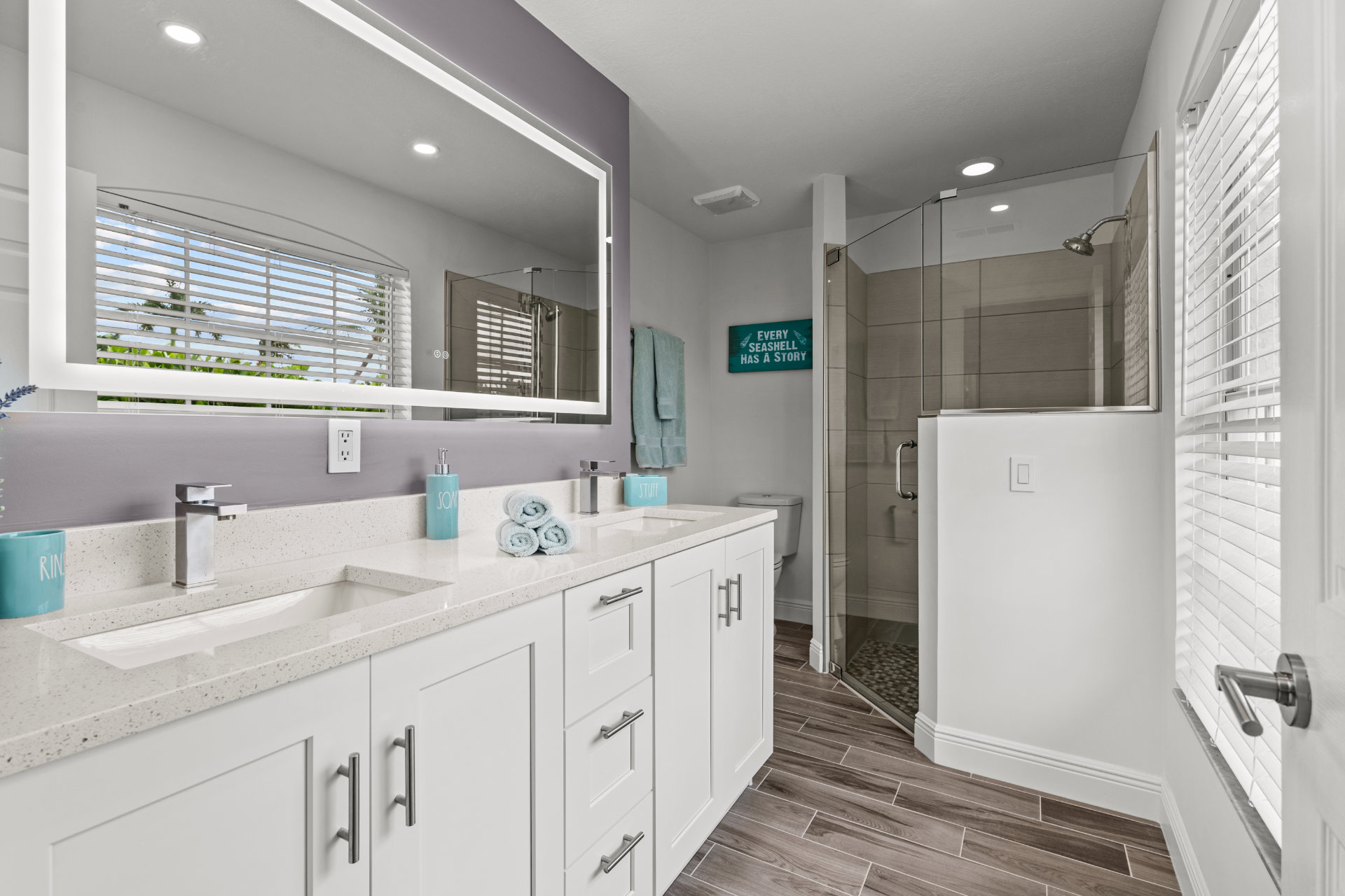 In the master bedroom there is the large bathroom with a spacious shower and double vanity. Our guest toilet has a bath with shower.
