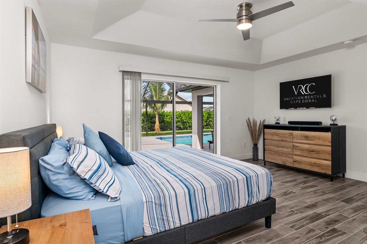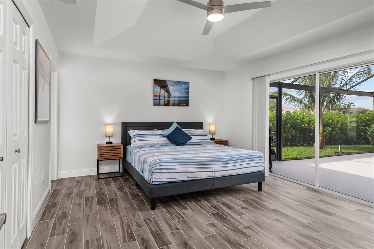 In addition to the large master bedroom (also LCD TV) with a king-size bed and walk-in closet, there is a queen-size bed in the second bedroom with pool access and two twin beds in the third bedroom.