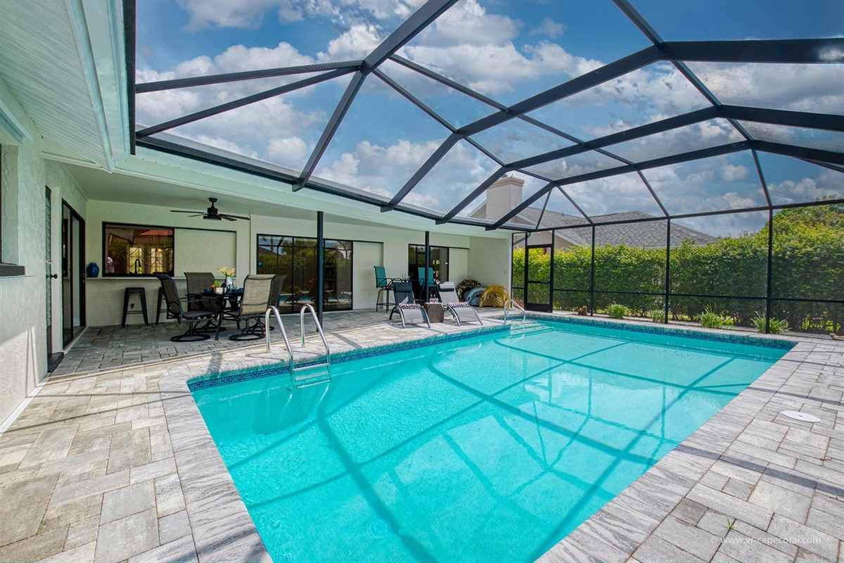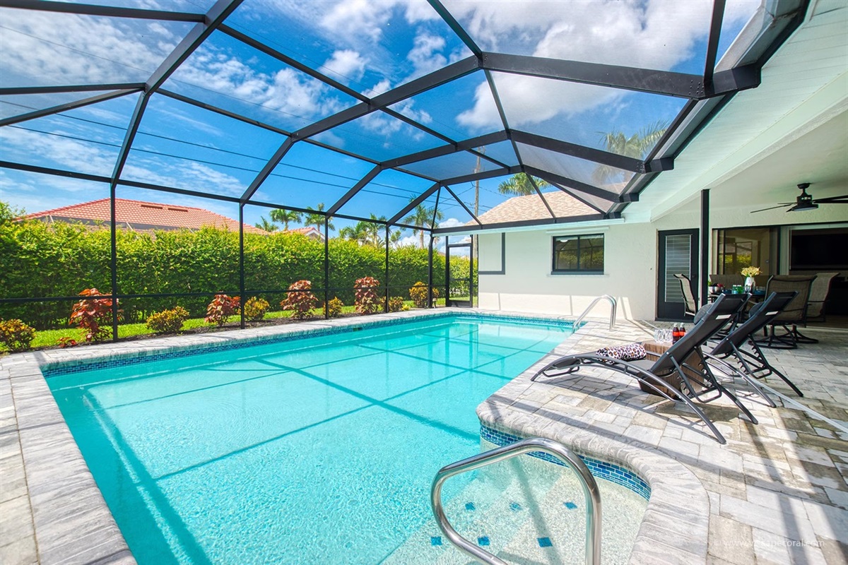 Step outside into the screened lanai to enjoy the beautiful, meticulous landscaping and sparkling pool, which create an oasis that feels miles away from the world. Enjoy balmy evenings entertaining with friends on the pool deck, or turn the lights down and take in the peacefulness of your surroundings, the options are endless.