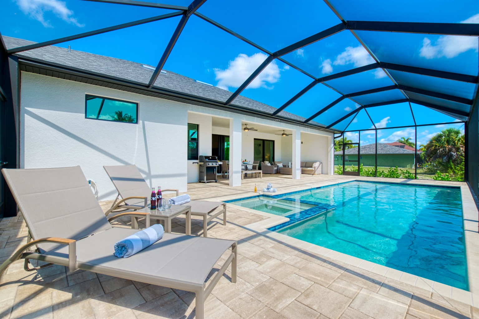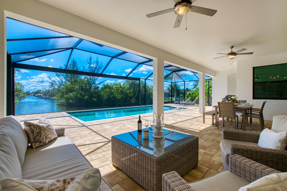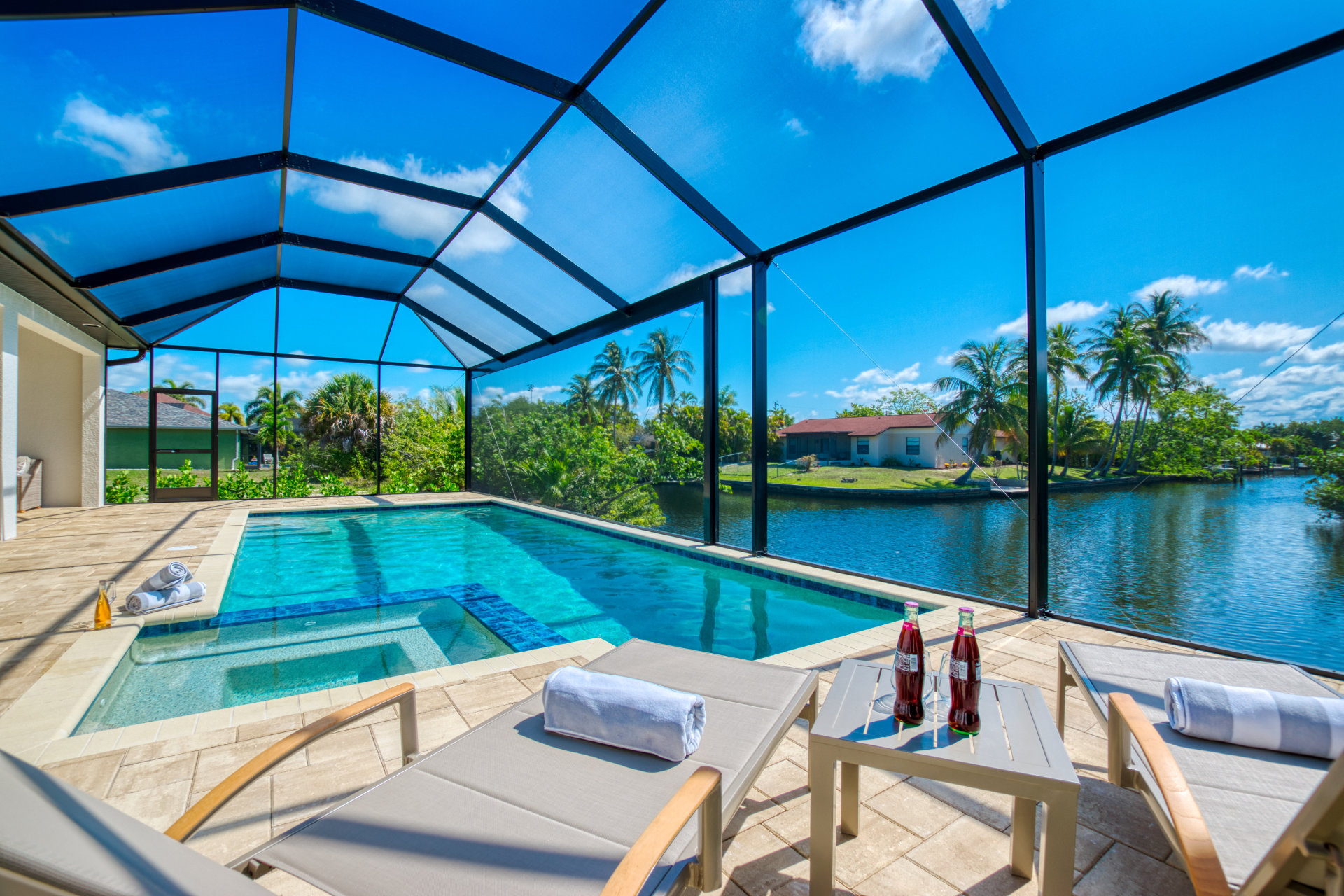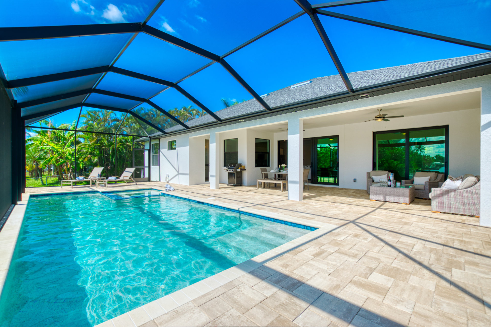 3 Bedrooms • 2 Bathrooms 2 Baths • Sleeps 3-6Villa Tesoro has been constructed as holiday home and welcomes up to 6 persons with a lot of space and privacy. This gorgeous, new construction vacation villa is located in the south-west corner of Cape Coral very close to the Tarpon Point. It is one of the best and most sought after residential areas in Cape Coral. Shops, doctors, pharmacies, etc. are nearby. Be the first one in this fabulous new construction. The Camelot Park is quickly accessible. There are also 2 free tennis courts available, which are also illuminated in the evening.The boat location of this house is fantastic. It is a 45min beautiful boat route to the Caloosahatchee river which offers quick access to the Gulf of Mexico, it is also one of the most beautiful boating routes here in the area.The right boat can optionally be booked in addition to this house and will be handed over to you by an expert boatman on arrival. You will then find out about boat instructions and tips on site. All our boats have powerful engines GPS system with depth measurement and fish-finder function, cool box, cabin and Bluetooth radio. BOATING IN FLORIDA IS ALLOWED WITHOUT A LICENSE !!