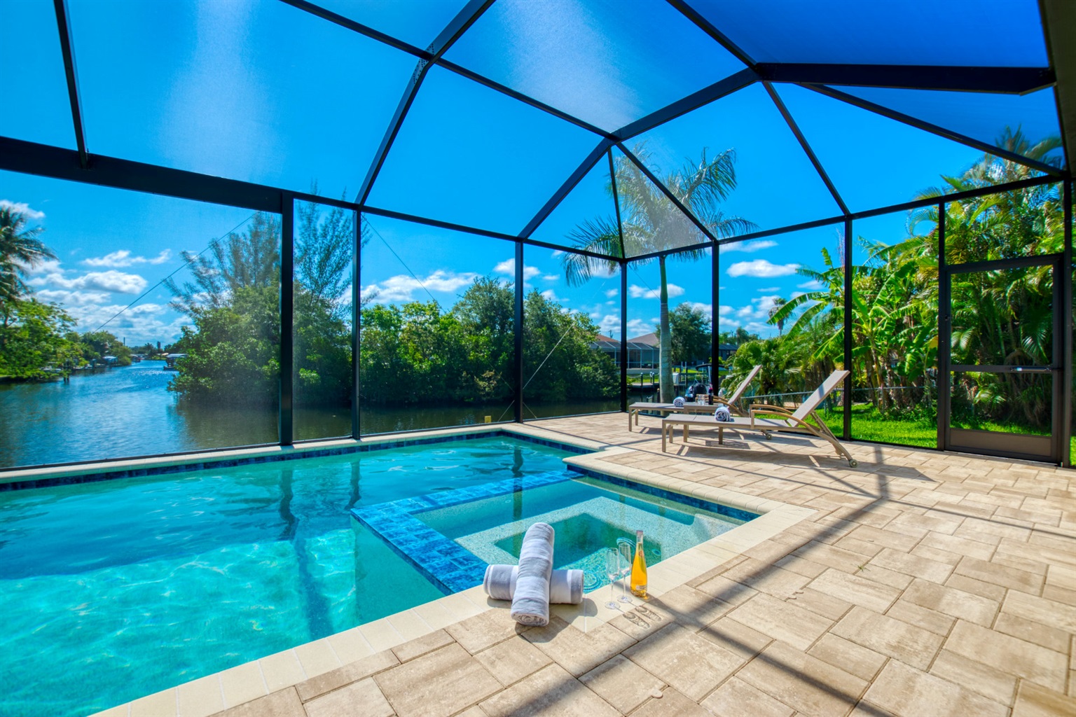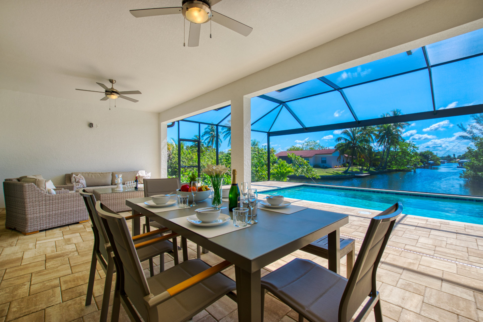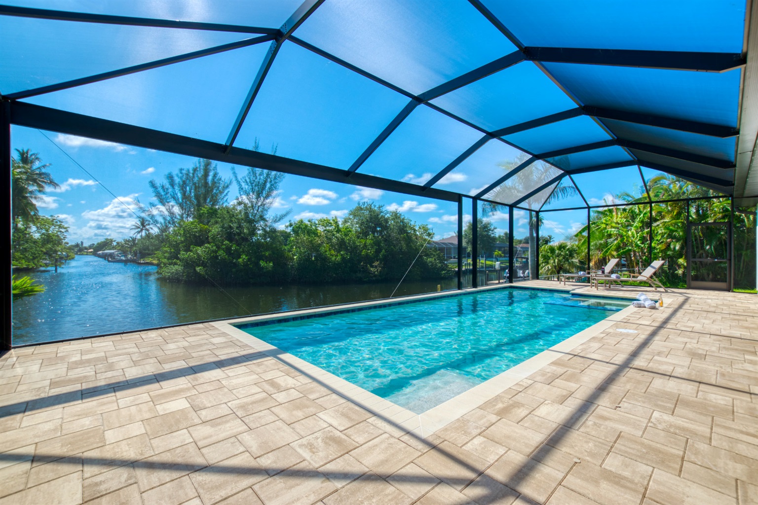 3 Bedrooms • 2 Bathrooms 2 Baths • Sleeps 3-6Villa Tesoro has been constructed as holiday home and welcomes up to 6 persons with a lot of space and privacy. This gorgeous, new construction vacation villa is located in the south-west corner of Cape Coral very close to the Tarpon Point. It is one of the best and most sought after residential areas in Cape Coral. Shops, doctors, pharmacies, etc. are nearby. Be the first one in this fabulous new construction. The Camelot Park is quickly accessible. There are also 2 free tennis courts available, which are also illuminated in the evening.The boat location of this house is fantastic. It is a 45min beautiful boat route to the Caloosahatchee river which offers quick access to the Gulf of Mexico, it is also one of the most beautiful boating routes here in the area.The right boat can optionally be booked in addition to this house and will be handed over to you by an expert boatman on arrival. You will then find out about boat instructions and tips on site. All our boats have powerful engines GPS system with depth measurement and fish-finder function, cool box, cabin and Bluetooth radio. BOATING IN FLORIDA IS ALLOWED WITHOUT A LICENSE !!