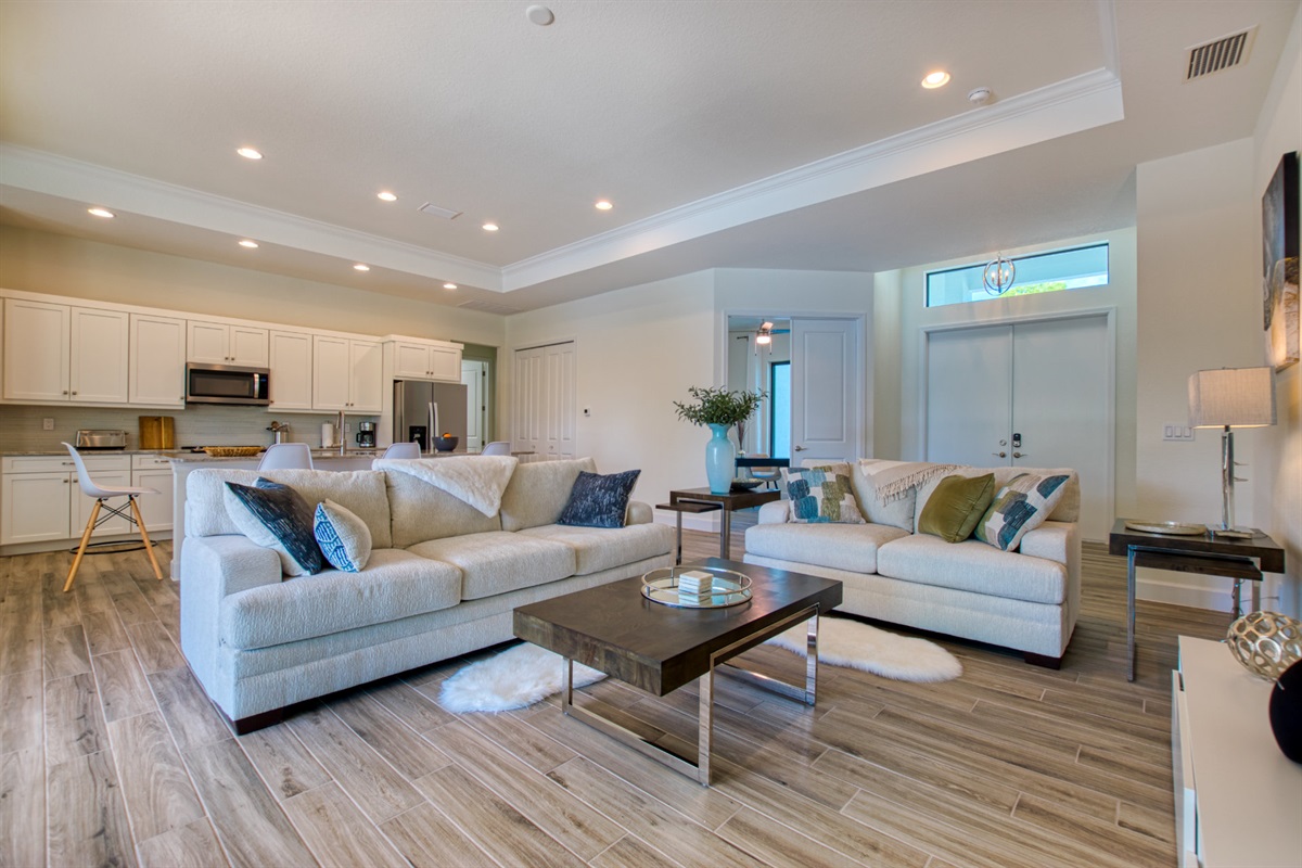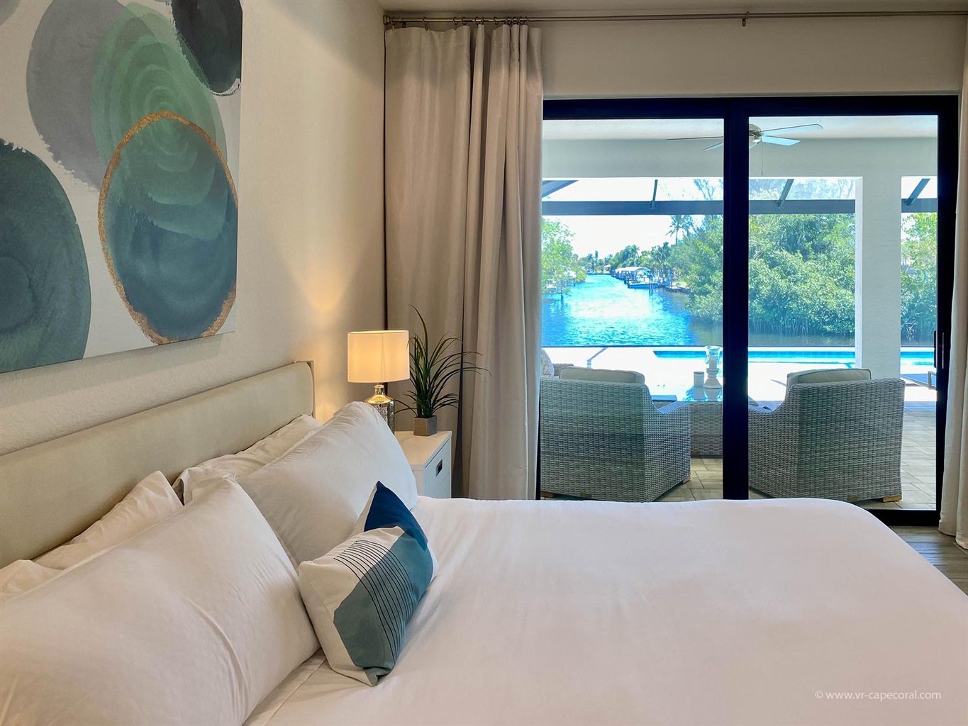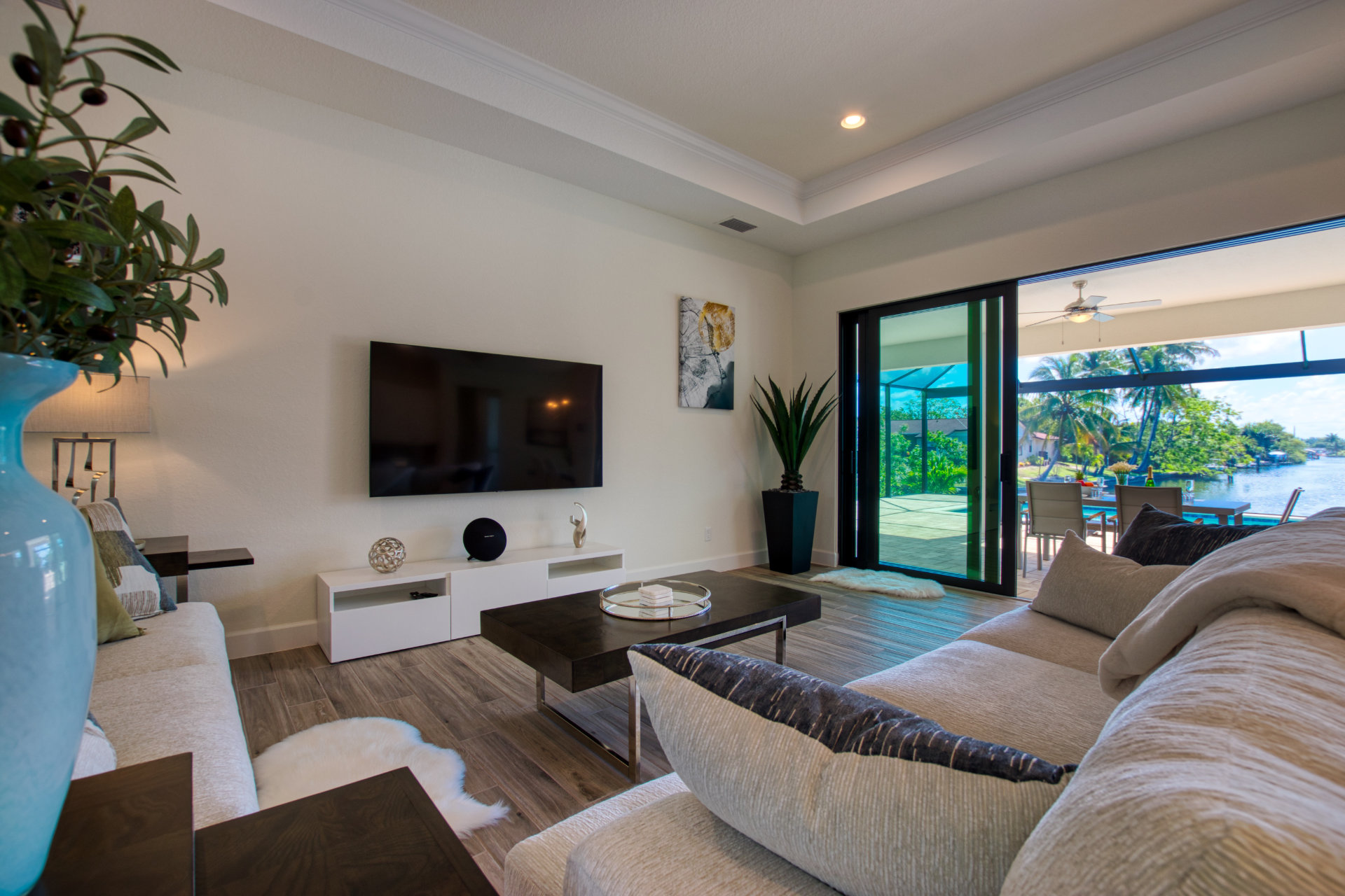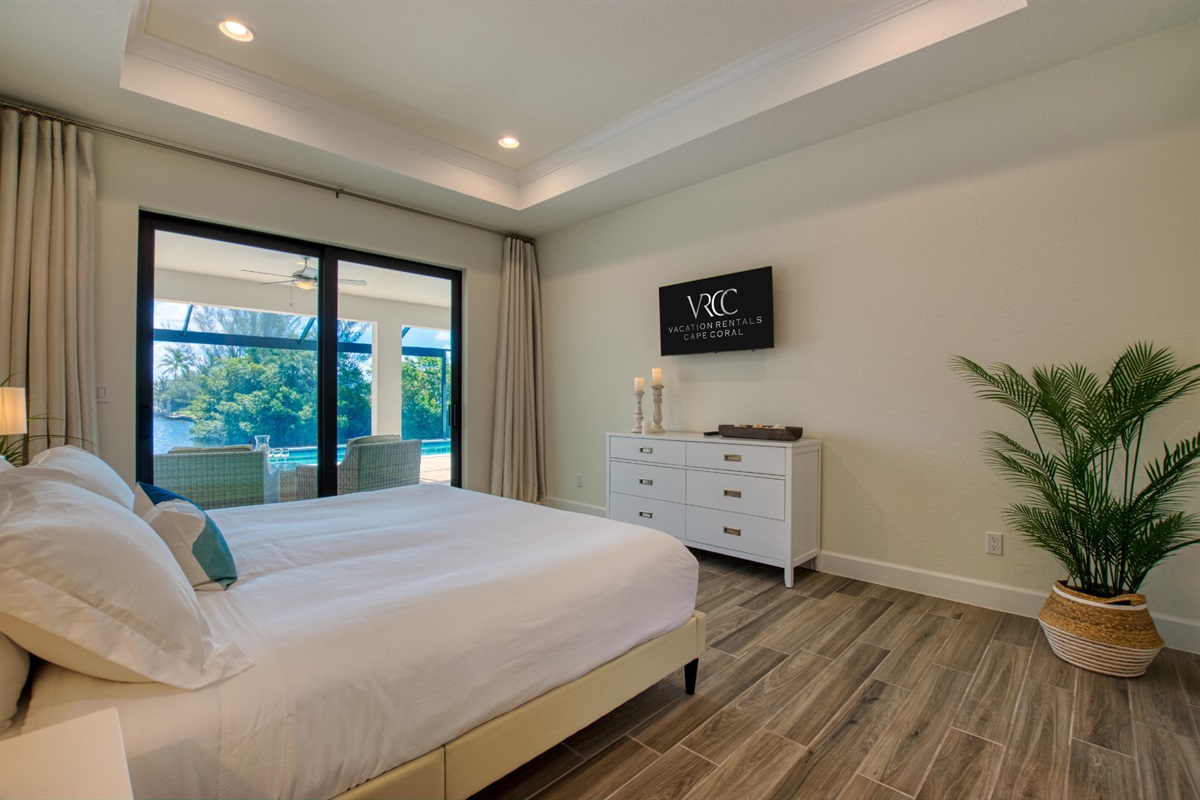 For enjoying a perfect Florida outside living you will find a cosy sofa set as well as a dining set on the terrace.From the elegant, light-flooded living room (with 70'LCD ) you can enjoy the view of the large pool, the wide canal and the tropical garden. When opening the sliding glass doors you will experience a great inside-outside feeling.Villa Tesoro offers 1 spacious master suite with a king size bed and two huge walk- in closets and with direct access to the pool area. The master suite offers a private bathroom.