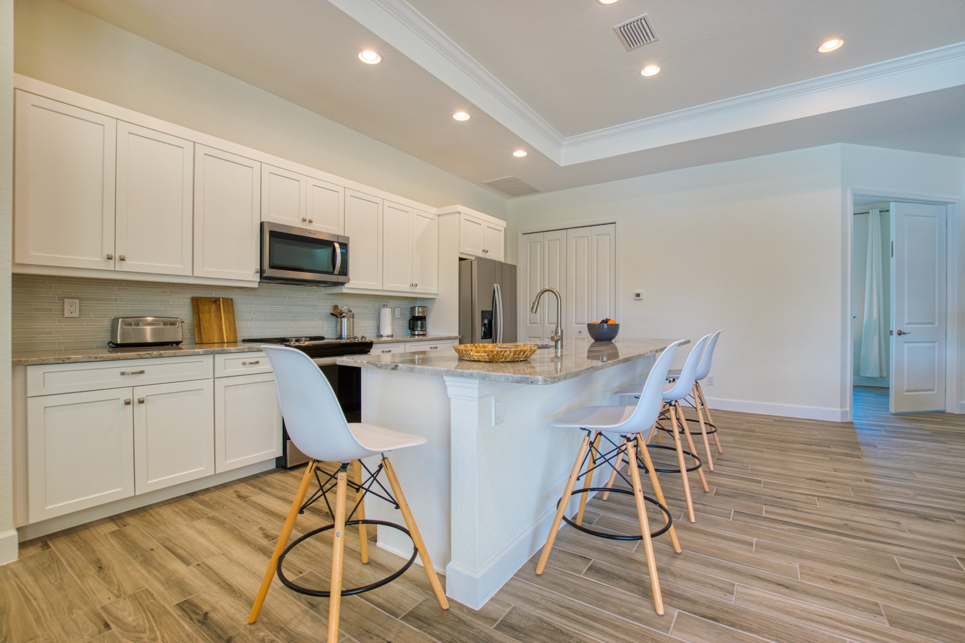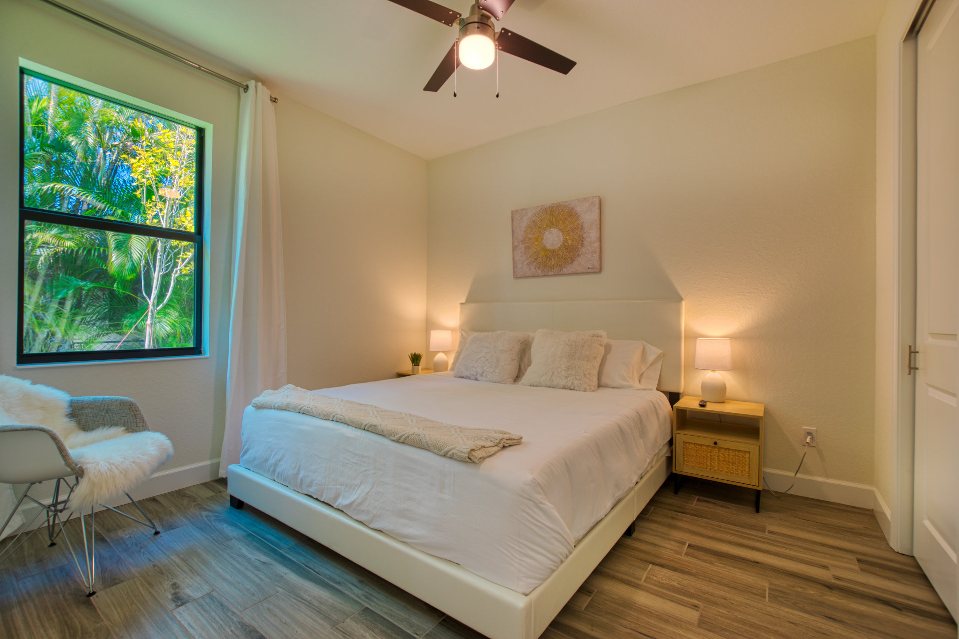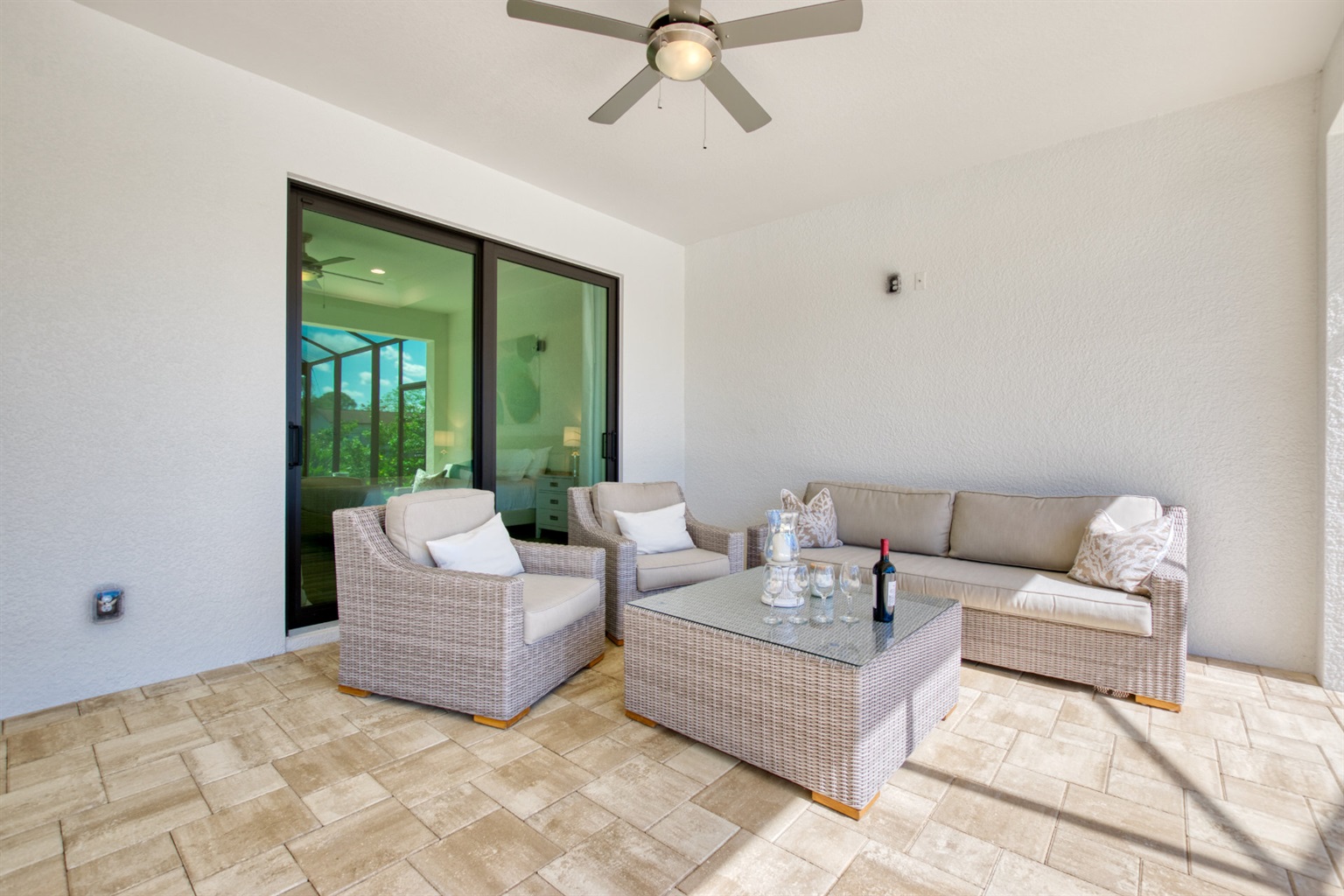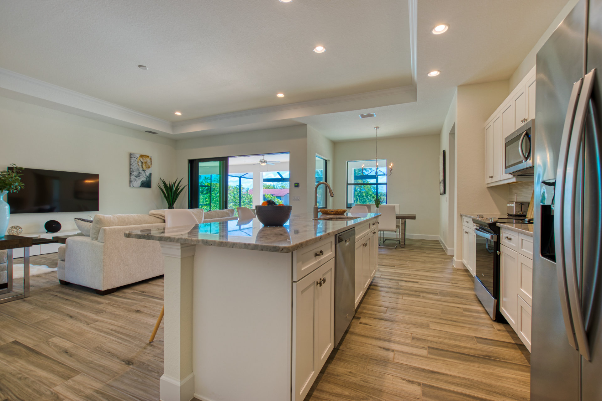 For enjoying a perfect Florida outside living you will find a cosy sofa set as well as a dining set on the terrace.From the elegant, light-flooded living room (with 70'LCD ) you can enjoy the view of the large pool, the wide canal and the tropical garden. When opening the sliding glass doors you will experience a great inside-outside feeling.Villa Tesoro offers 1 spacious master suite with a king size bed and two huge walk- in closets and with direct access to the pool area. The master suite offers a private bathroom.