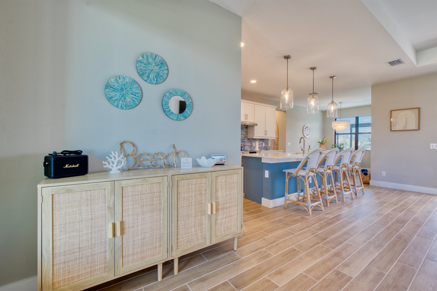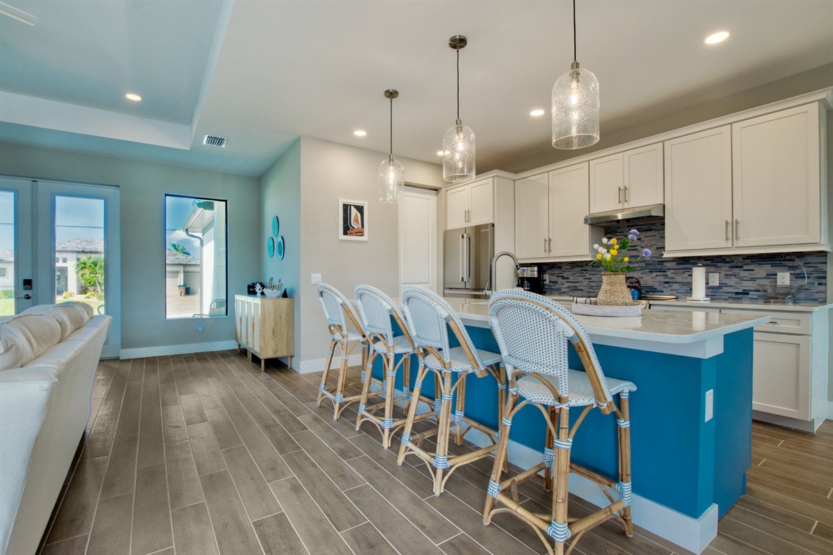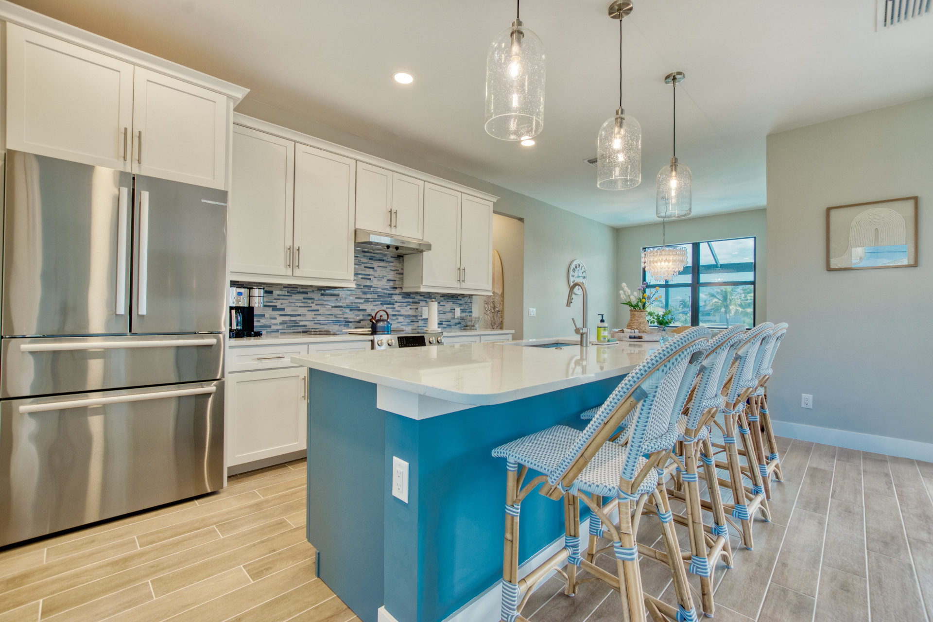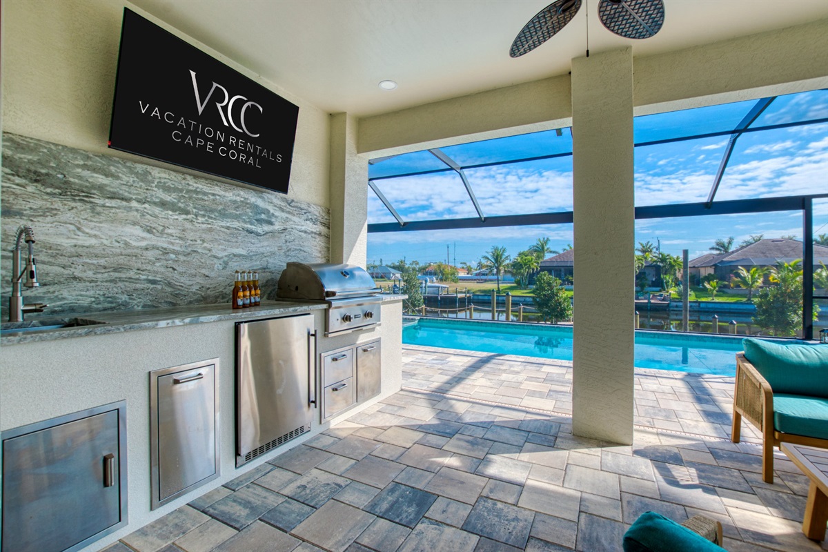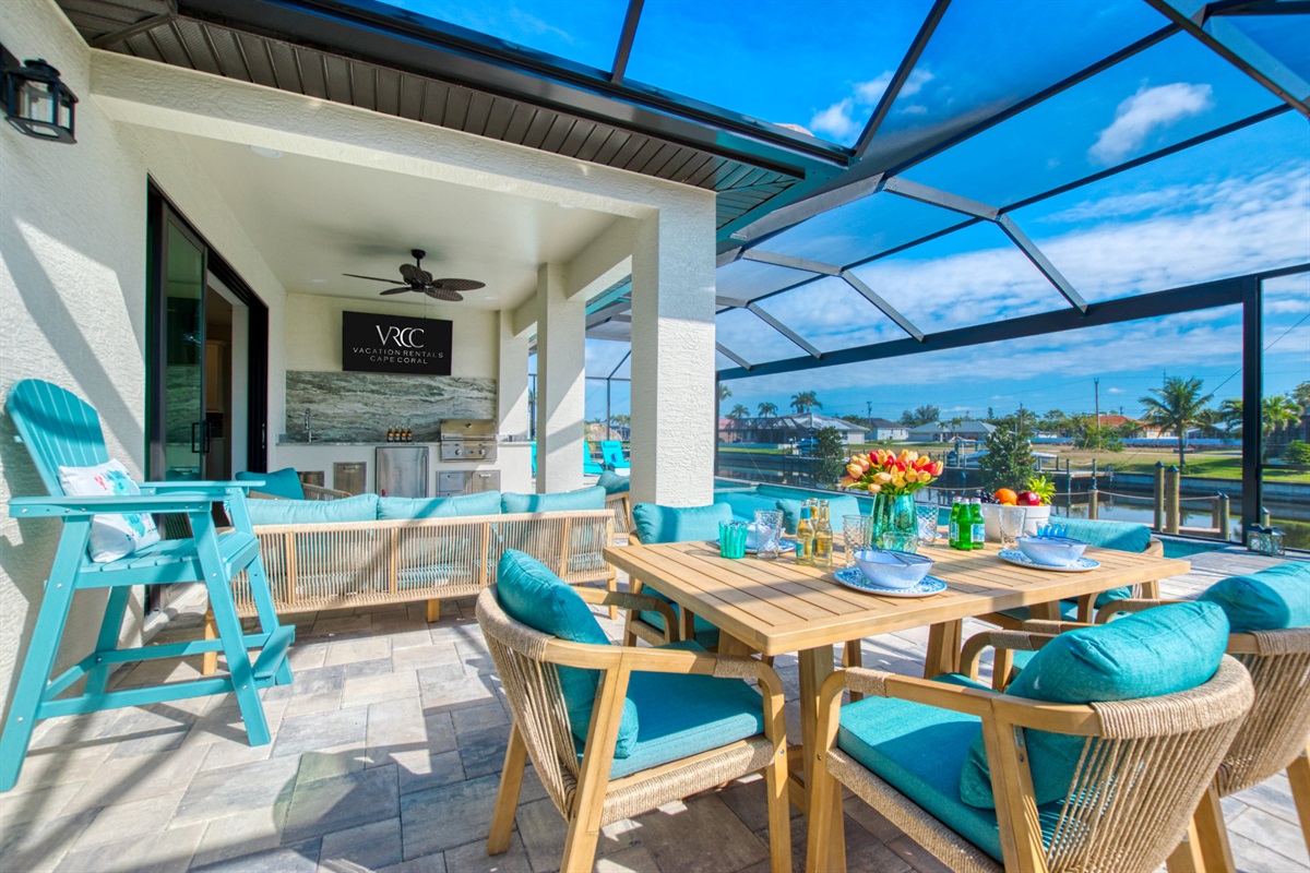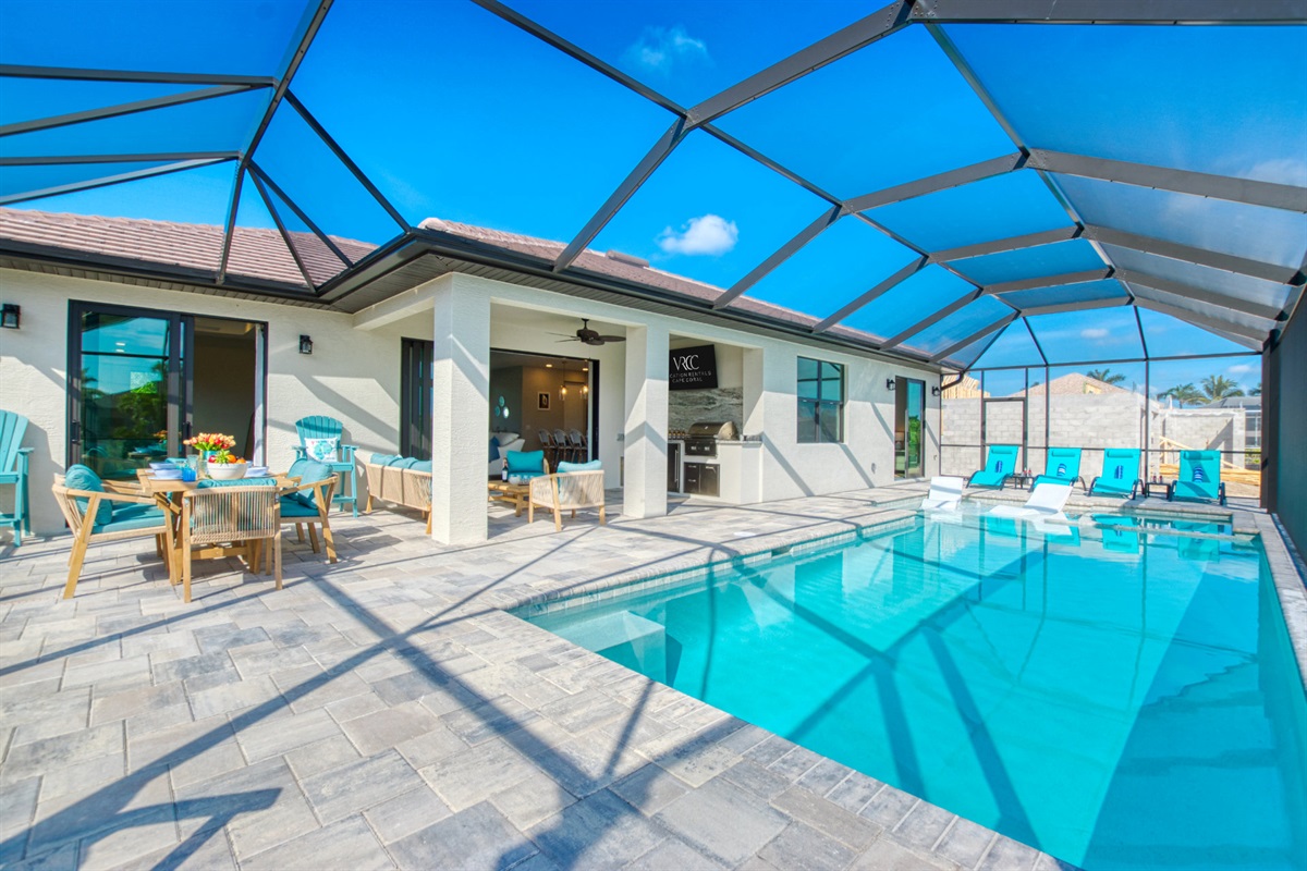 Love to cook? The custom outdoor kitchen is a dream come true, featuring a built-in gas grill, sink, and refrigerator—perfect for grilling up fresh seafood or juicy steaks while enjoying the Florida sunshine. Dine alfresco in the spacious outdoor seating area, surrounded by tropical vibes.
