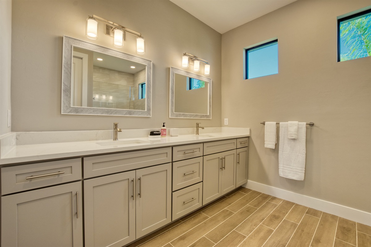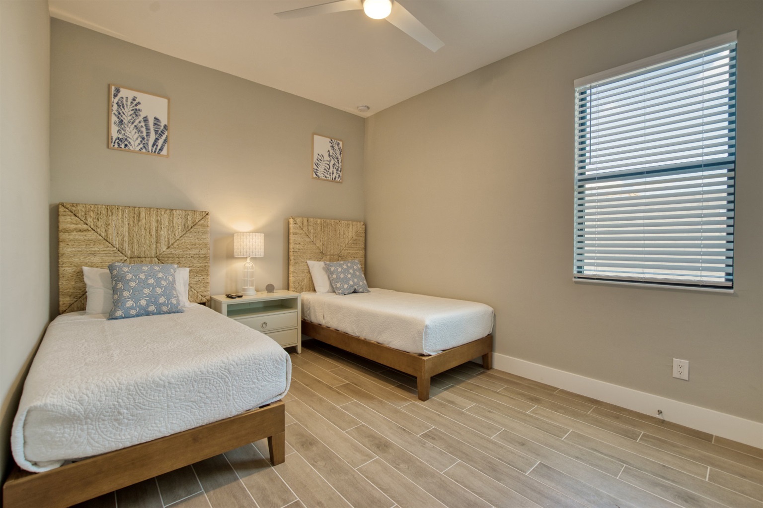 The large master suite offers a King-size bed, direct pool access, spacious master bath and walk-in closet. The second bedroom offers a queen-size bed, private access to the pool. The third bedroom is equipped with two comfortable twin beds, ideal for families or friends. The second and third bedrooms share a bath.